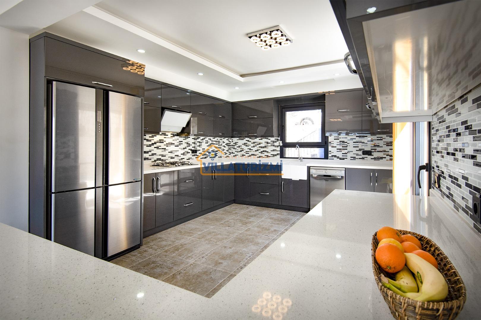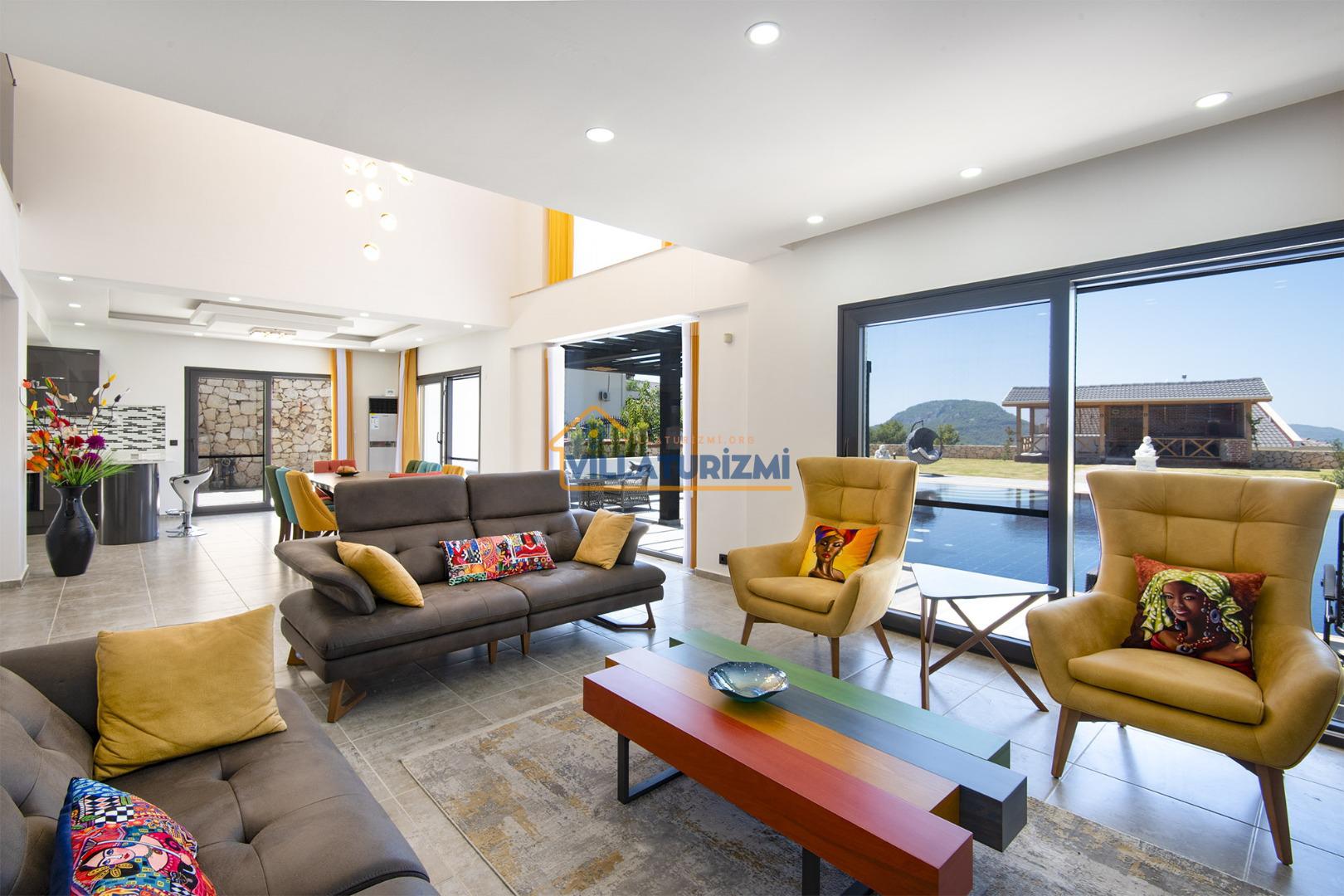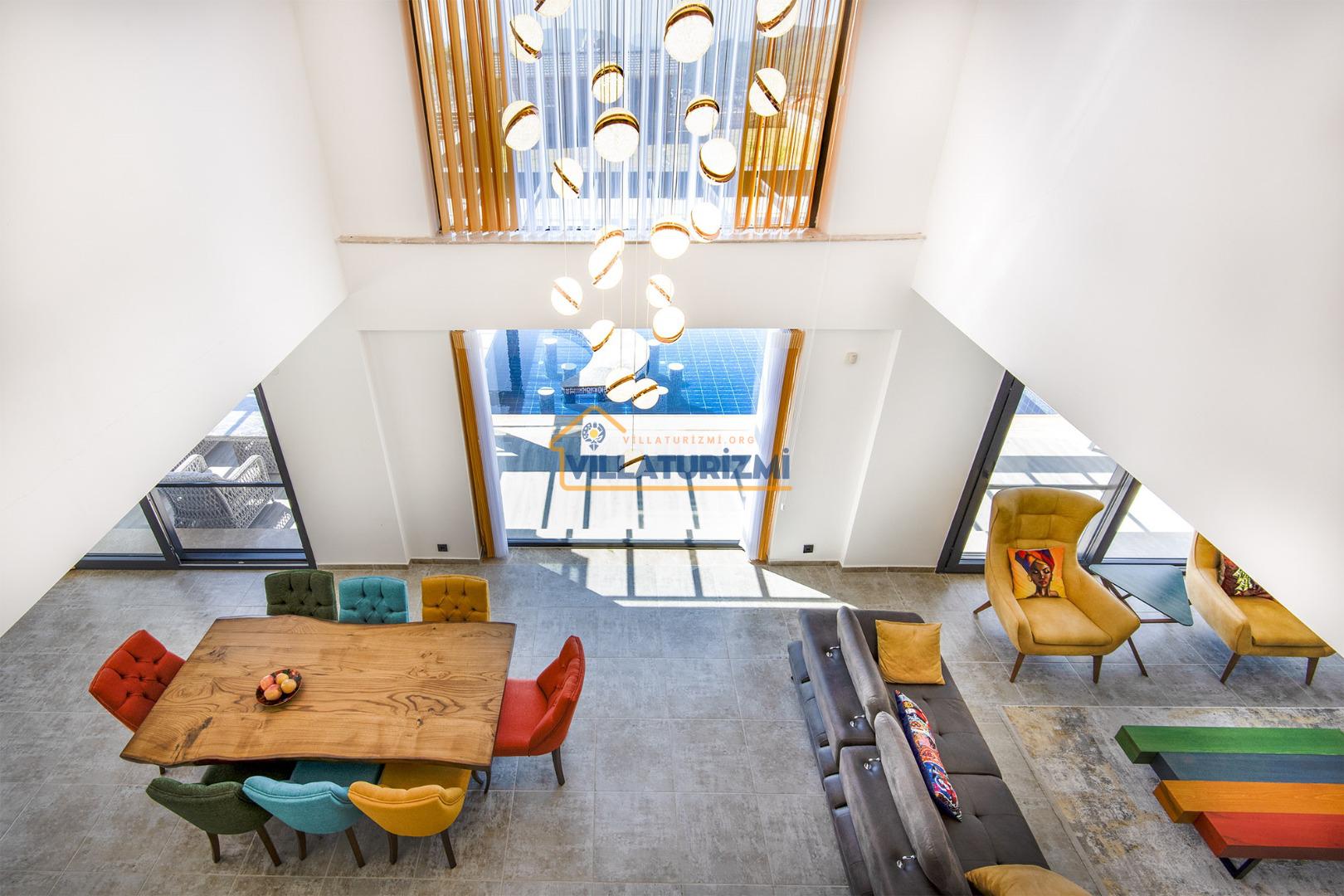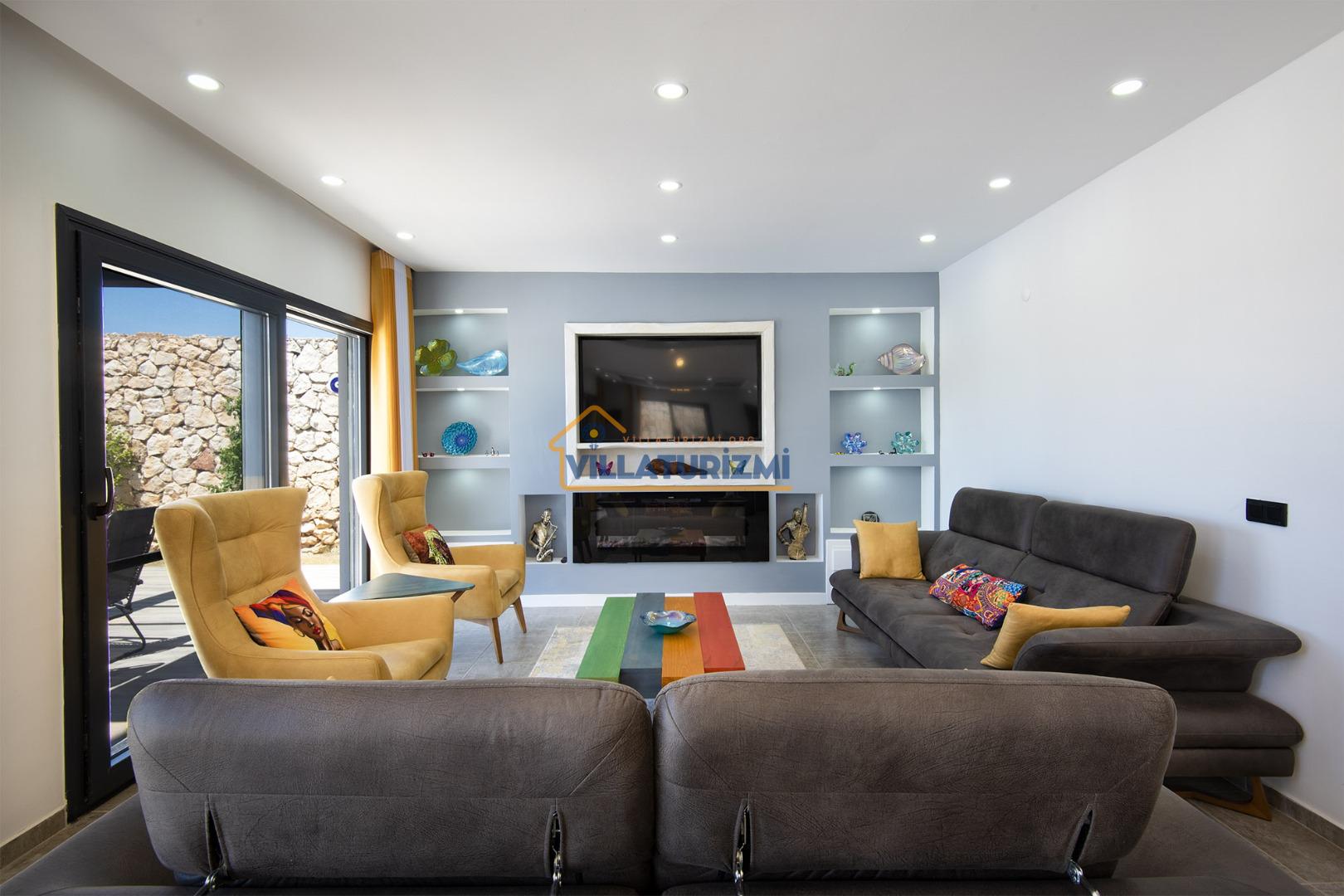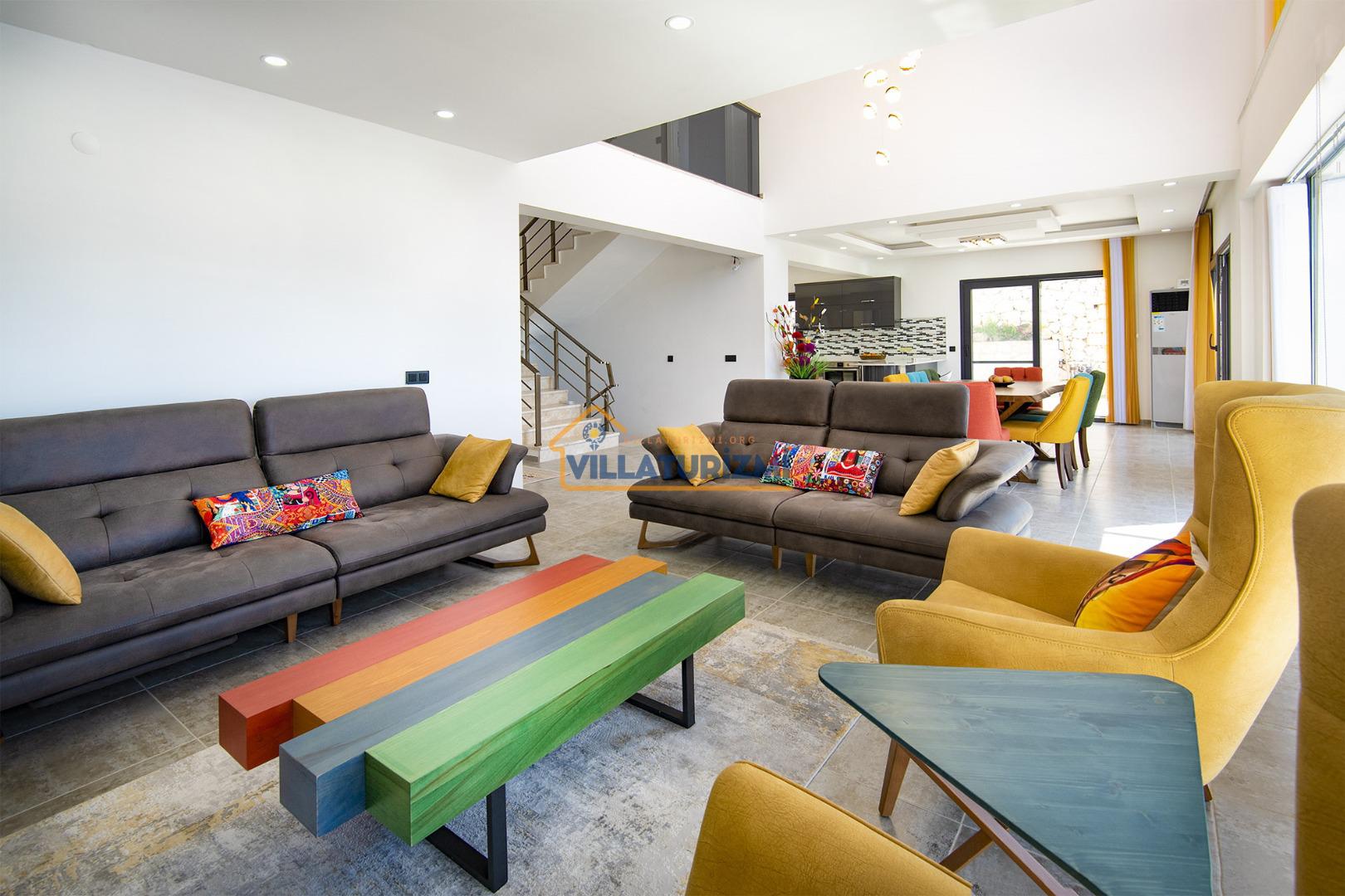 Salon: Oturma grubu, WC, uydu alıcı, LCDTV, internet klima, yemek masası, sandalyeler ve havuza çıkış bulunmaktadır.Ayrıca villada alarm,kamera ve panjur mevcuttur