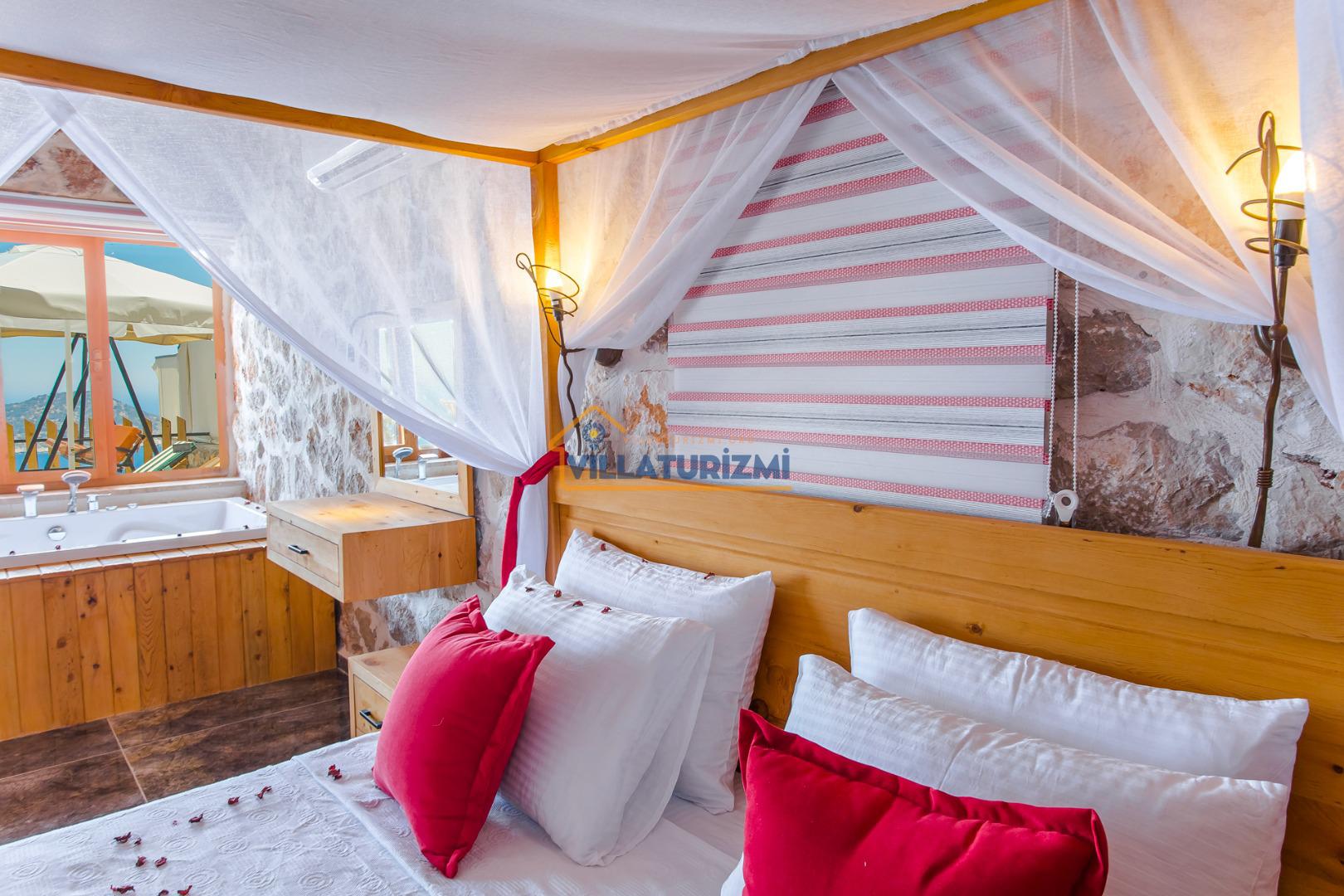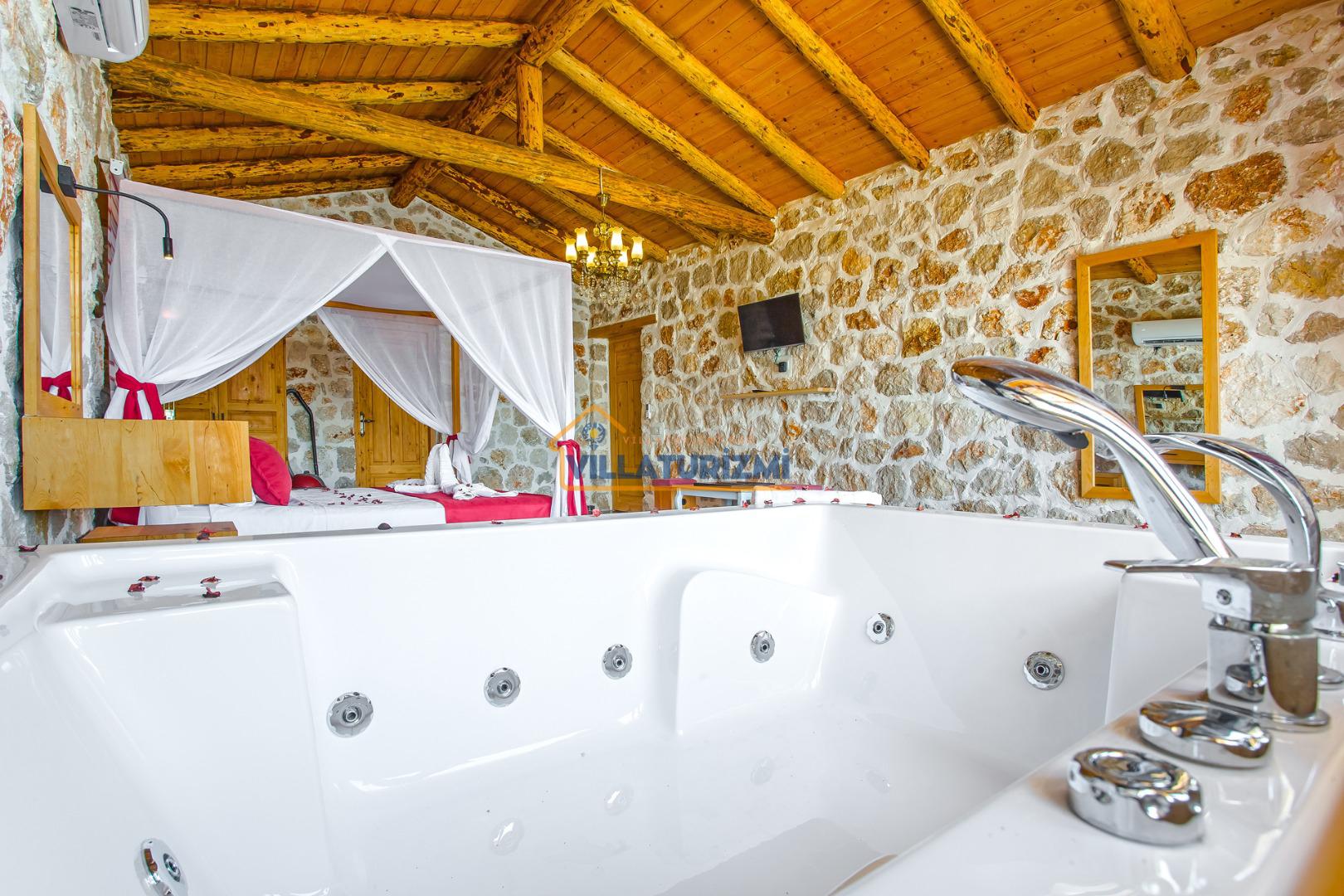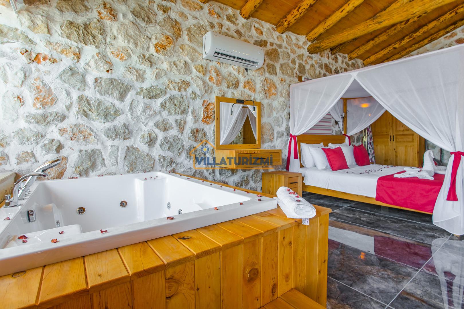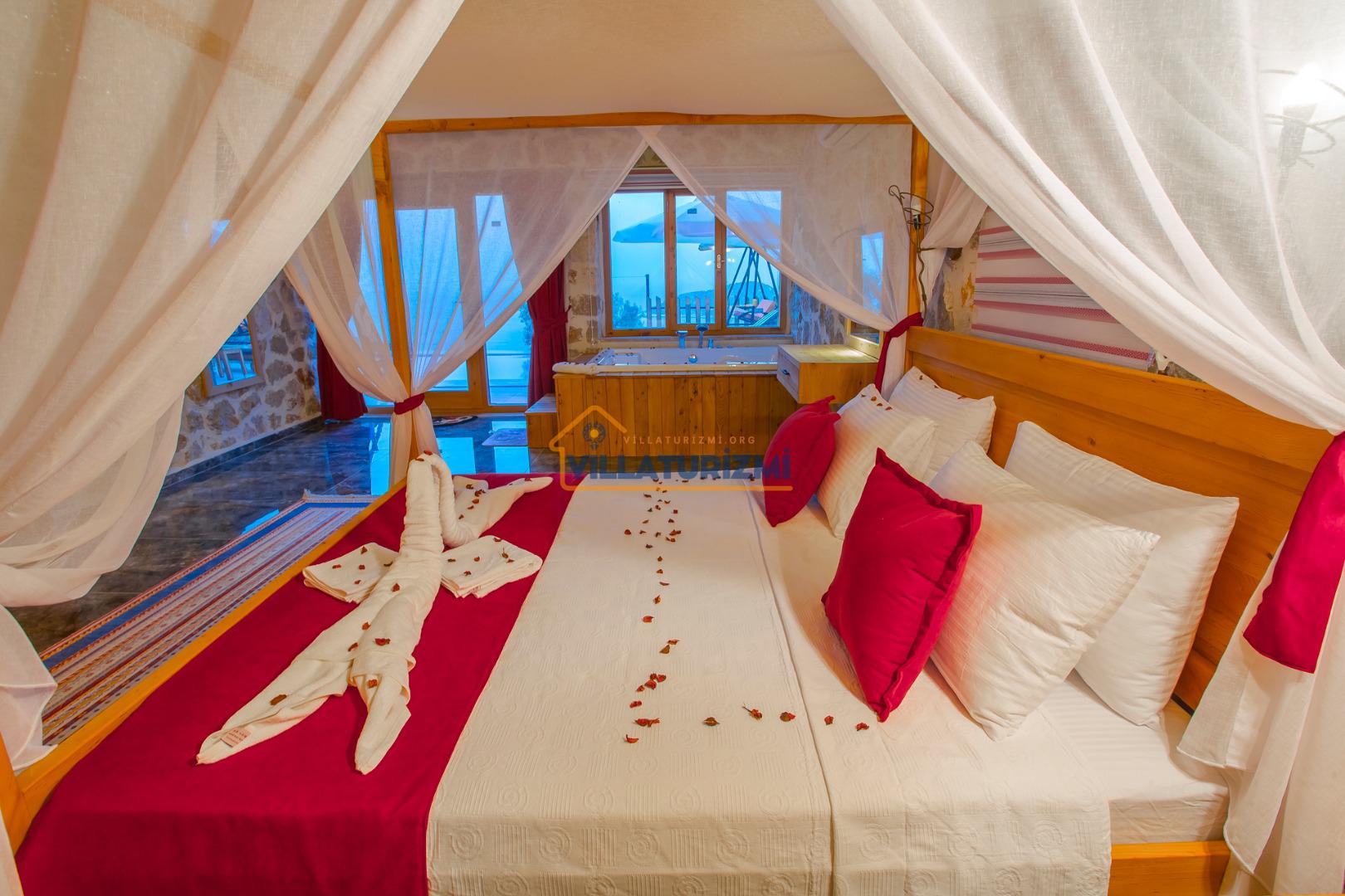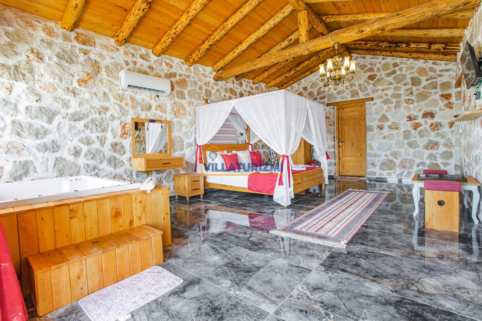Yatak Odası: 1 adet çift kişilik yatak, komodin, elbise dolabı, klima, jakuzi, WC banyo bulunmaktadır.