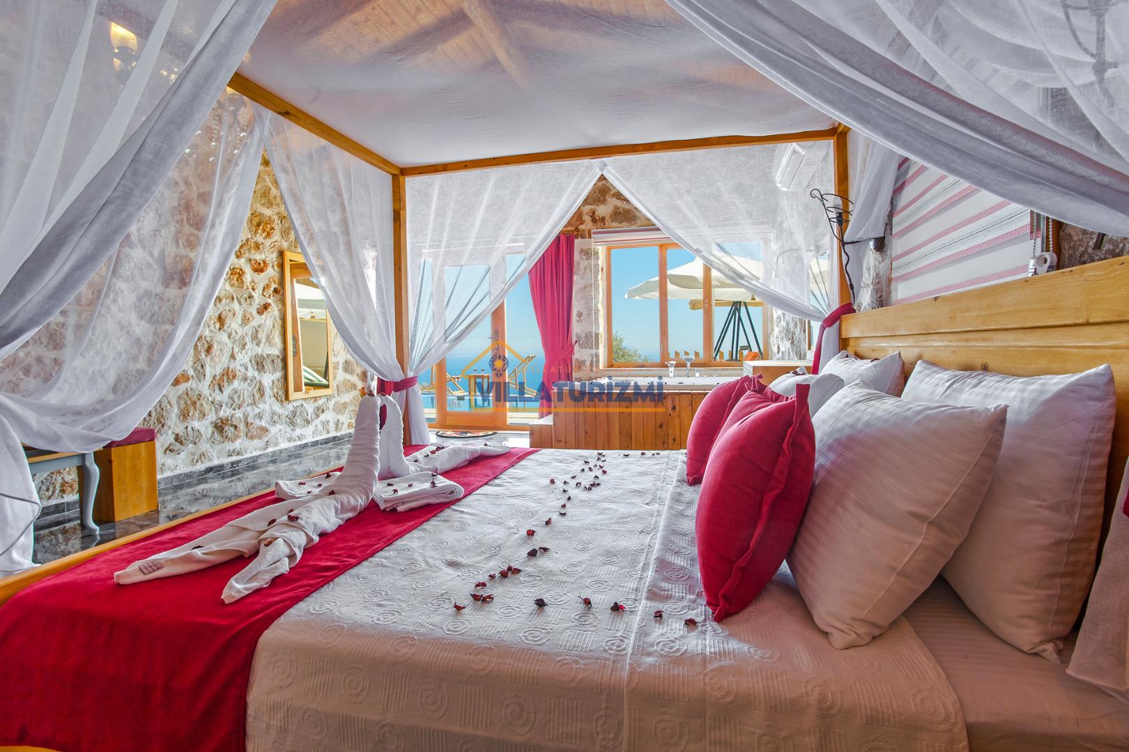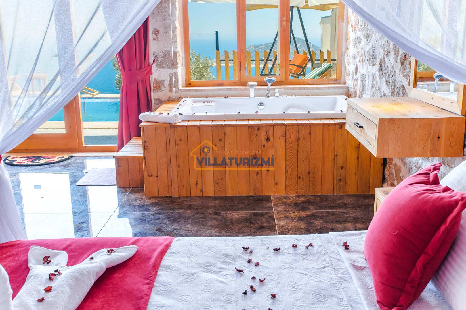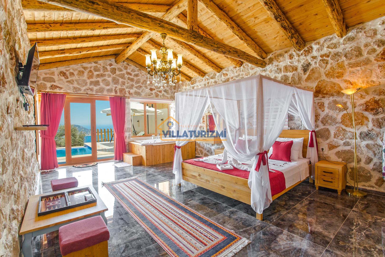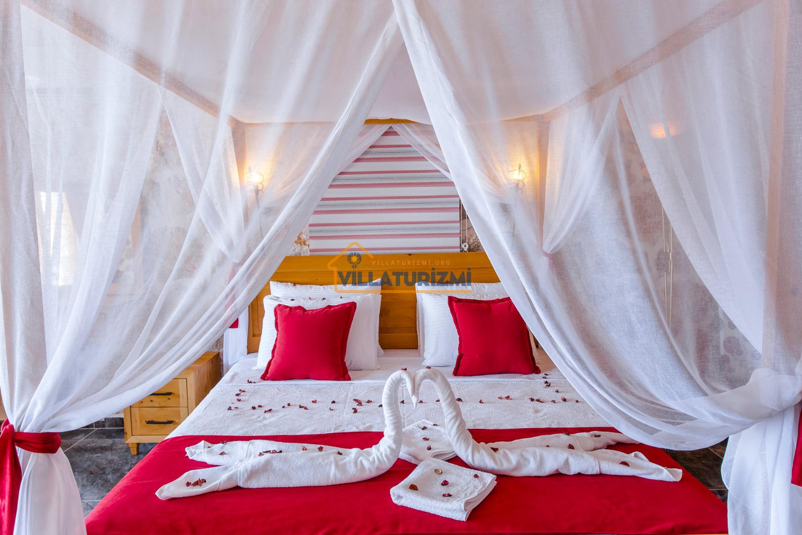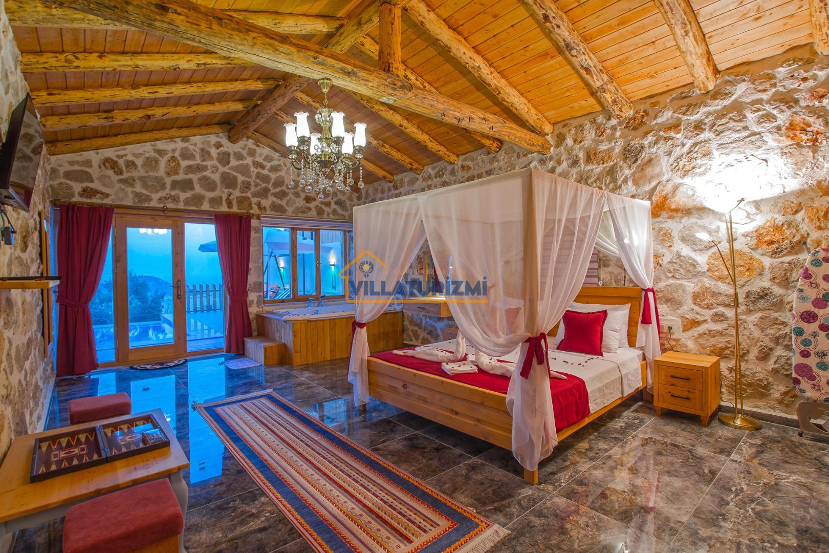 Yatak Odası: 1 adet çift kişilik yatak, komodin, elbise dolabı, klima, jakuzi, WC banyo bulunmaktadır.