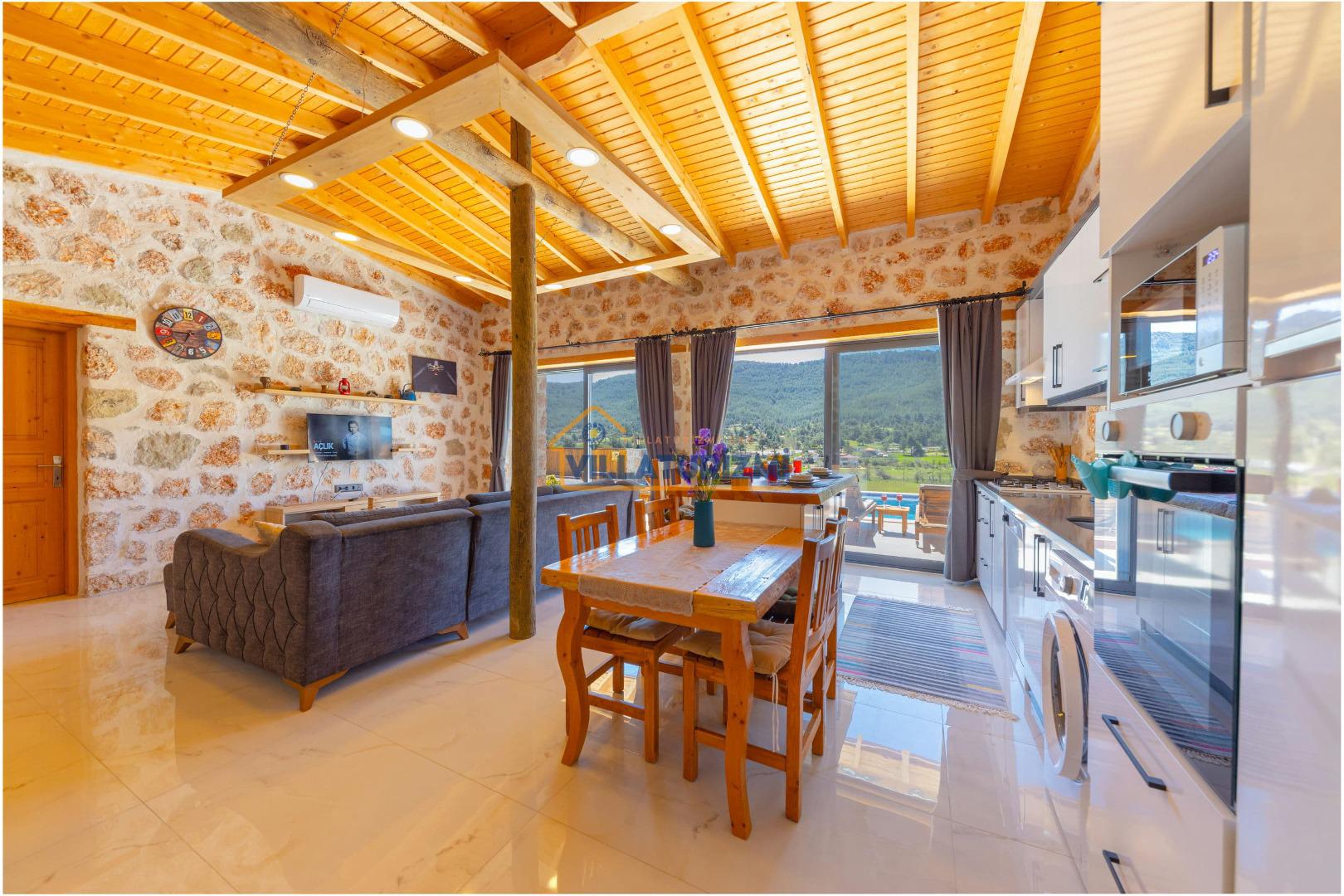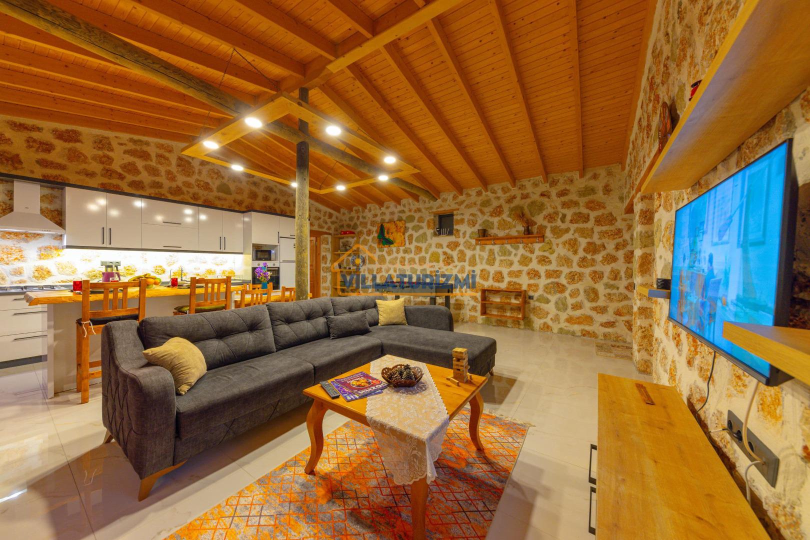 Kiralık Villanın yaşam alanı, modern bir mutfak, rahat bir oturma grubu, televizyon ve klima ile donatılmış geniş bir salondan oluşmaktadır. Mutfak, kendi yemeklerini hazırlamak isteyen misafirler için gerekli tüm ekipmanlara sahip olup, tatil boyunca ev konforunda yemek yapma imkanı sunar. Oturma grubu, aile ve arkadaşlarla keyifli sohbetler etmek veya televizyon izlemek için ideal bir ortam sağlarken, klima ise iç mekanın her zaman serin ve ferah kalmasını garantiler.