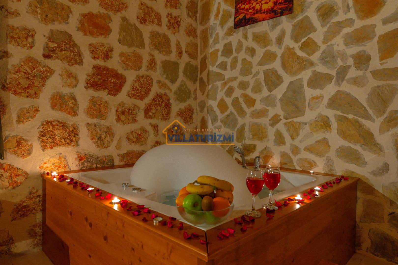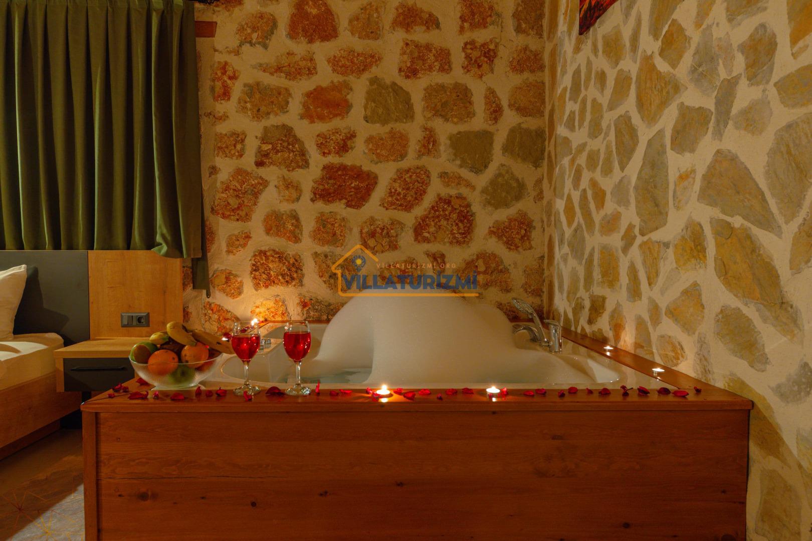 Kiralık villanın konaklama kapasitesi iki yatak odası ile sınırlı olup, her bir oda kendine özgü özellikleriyle konforlu bir dinlenme alanı sunar. Birinci yatak odası, çift kişilik yatağı, klima, jakuzi ve özel banyosu ile romantik bir kaçamak arayan çiftler için mükemmel bir seçenektir. Jakuzi, uzun bir günün ardından rahatlama ve tazelenme imkanı sunarken, klima ise sıcak yaz günlerinde serin ve konforlu bir uyku sunar. İkinci yatak odasında ise iki adet tek kişilik yatak, banyo ve klima bulunmaktadır. Bu düzenleme, aileler veya arkadaş grupları için esnek ve konforlu bir konaklama imkanı sağlar. Her iki yatak odasının da özenle dekore edilmiş olması, misafirlerin kendilerini şımartılmış hissetmelerine olanak tanır.
