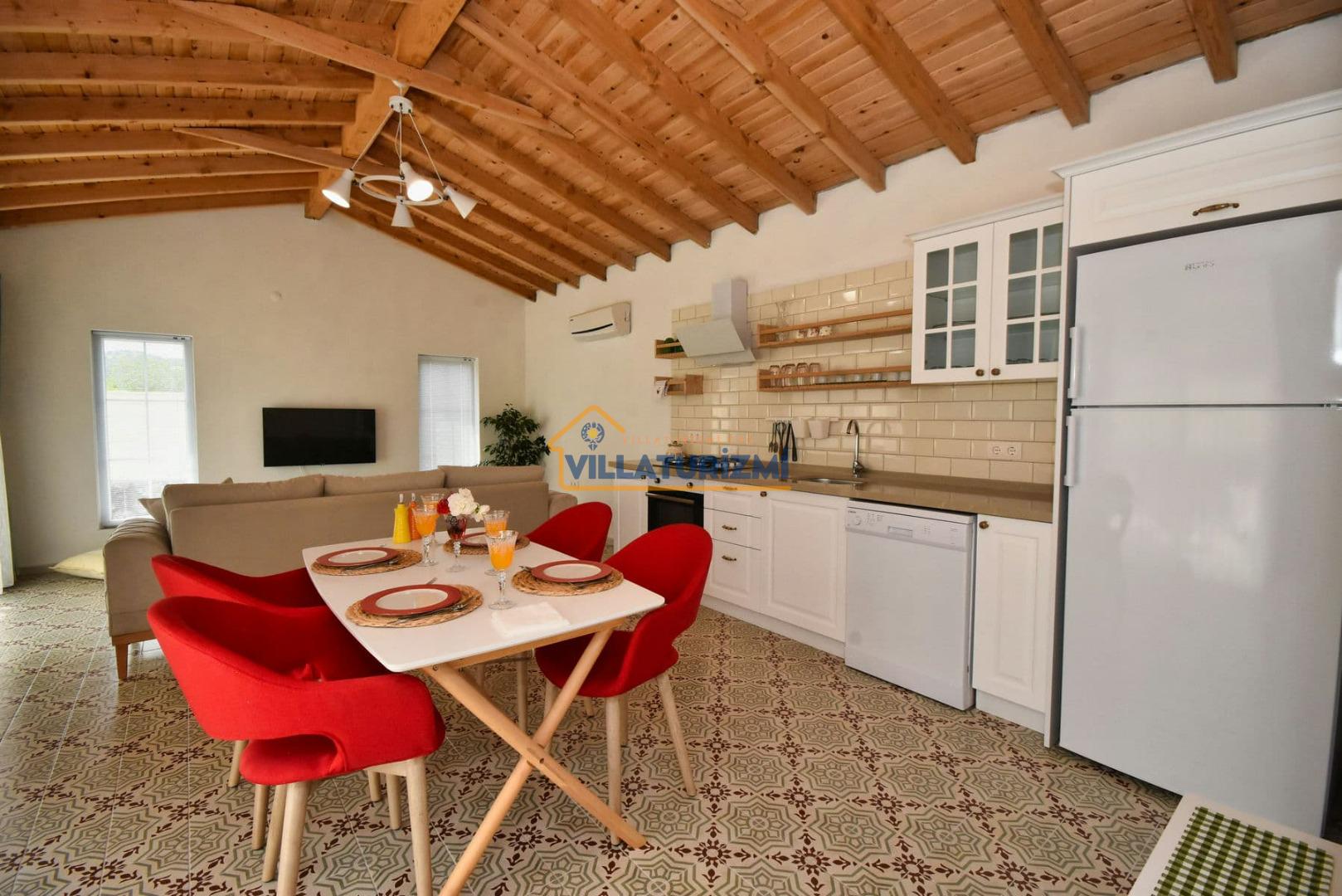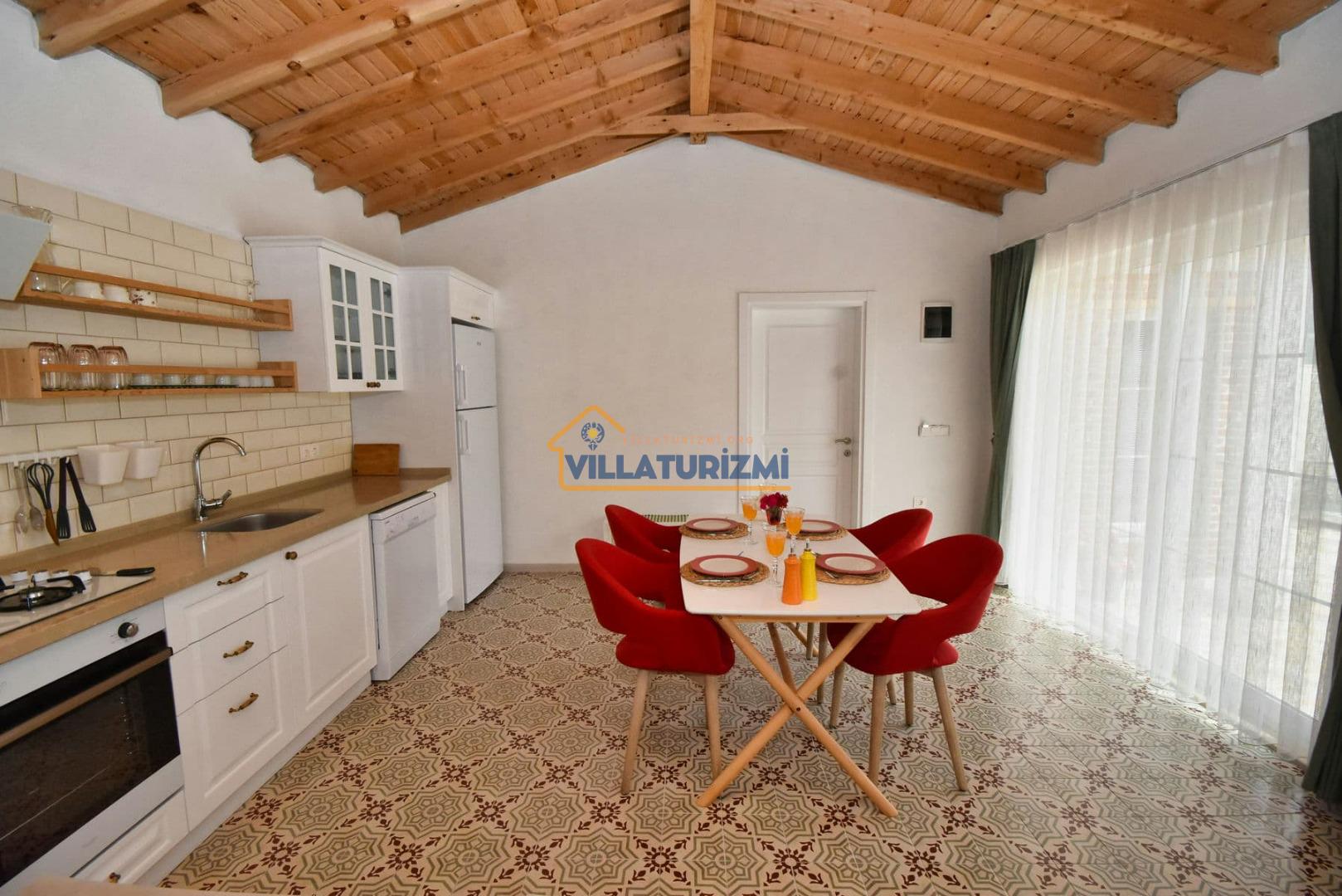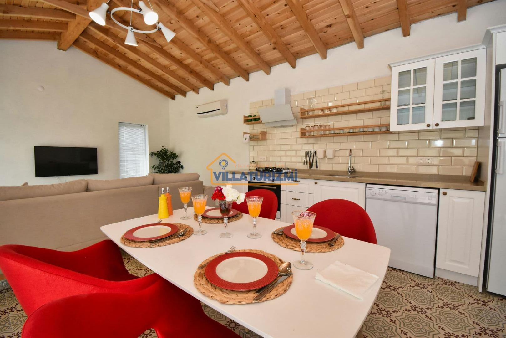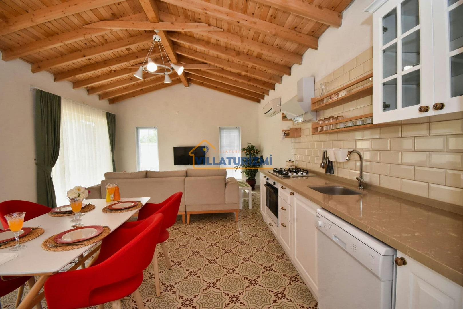 Villa Cansel'in 2 adet yatak odası ve yüzme havuzuna açılan açık mutfaklı oturma/yemek odasından oluşur. Mutfak kısmında bulunan yemek masası 6 kişi kapasitelidir.