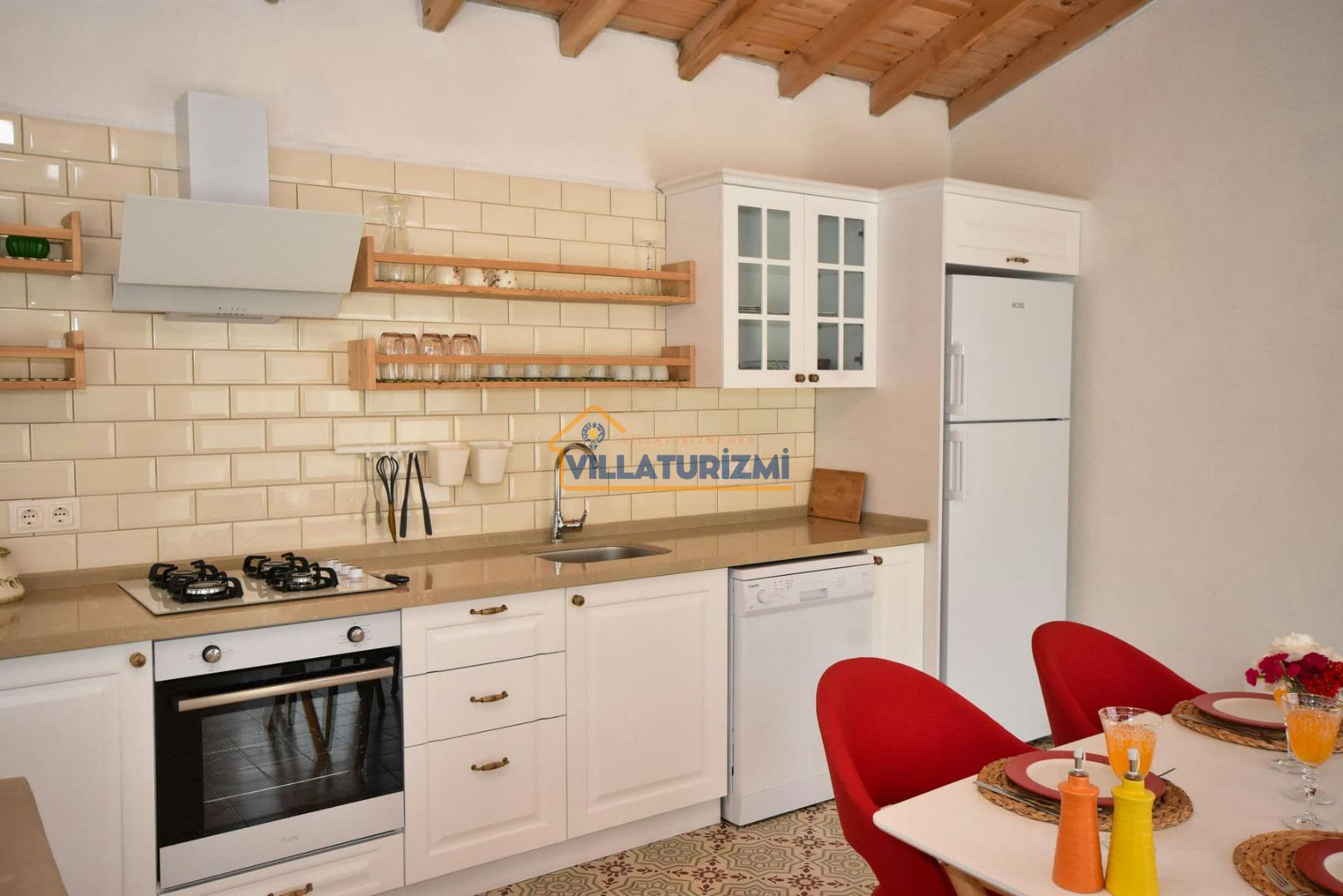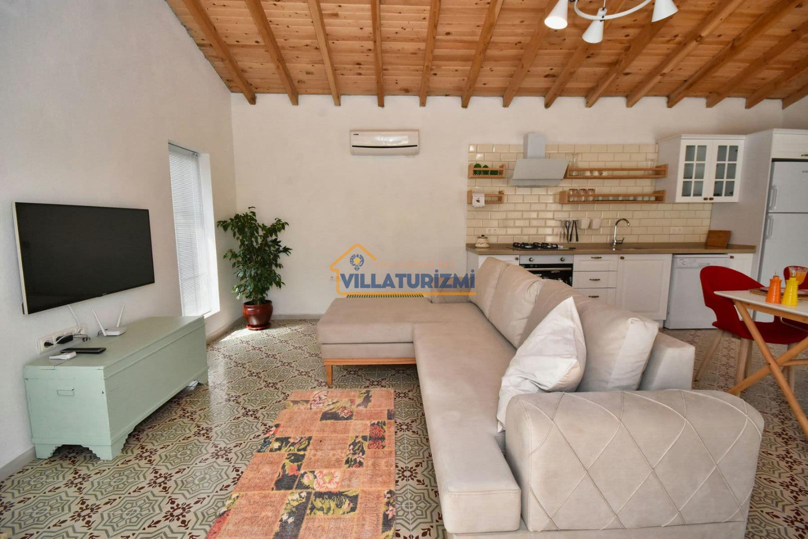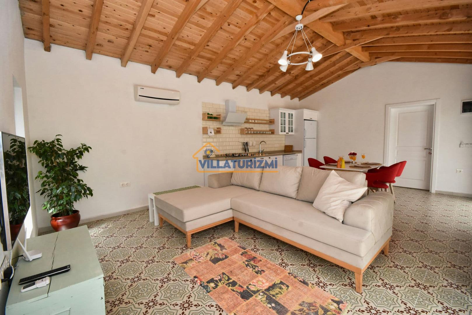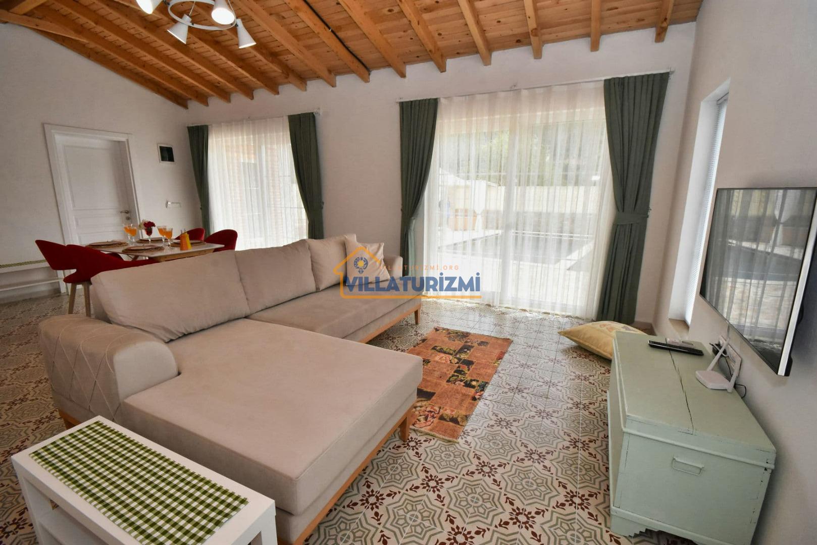 Villa Cansel'in 2 adet yatak odası ve yüzme havuzuna açılan açık mutfaklı oturma/yemek odasından oluşur. Mutfak kısmında bulunan yemek masası 6 kişi kapasitelidir.
