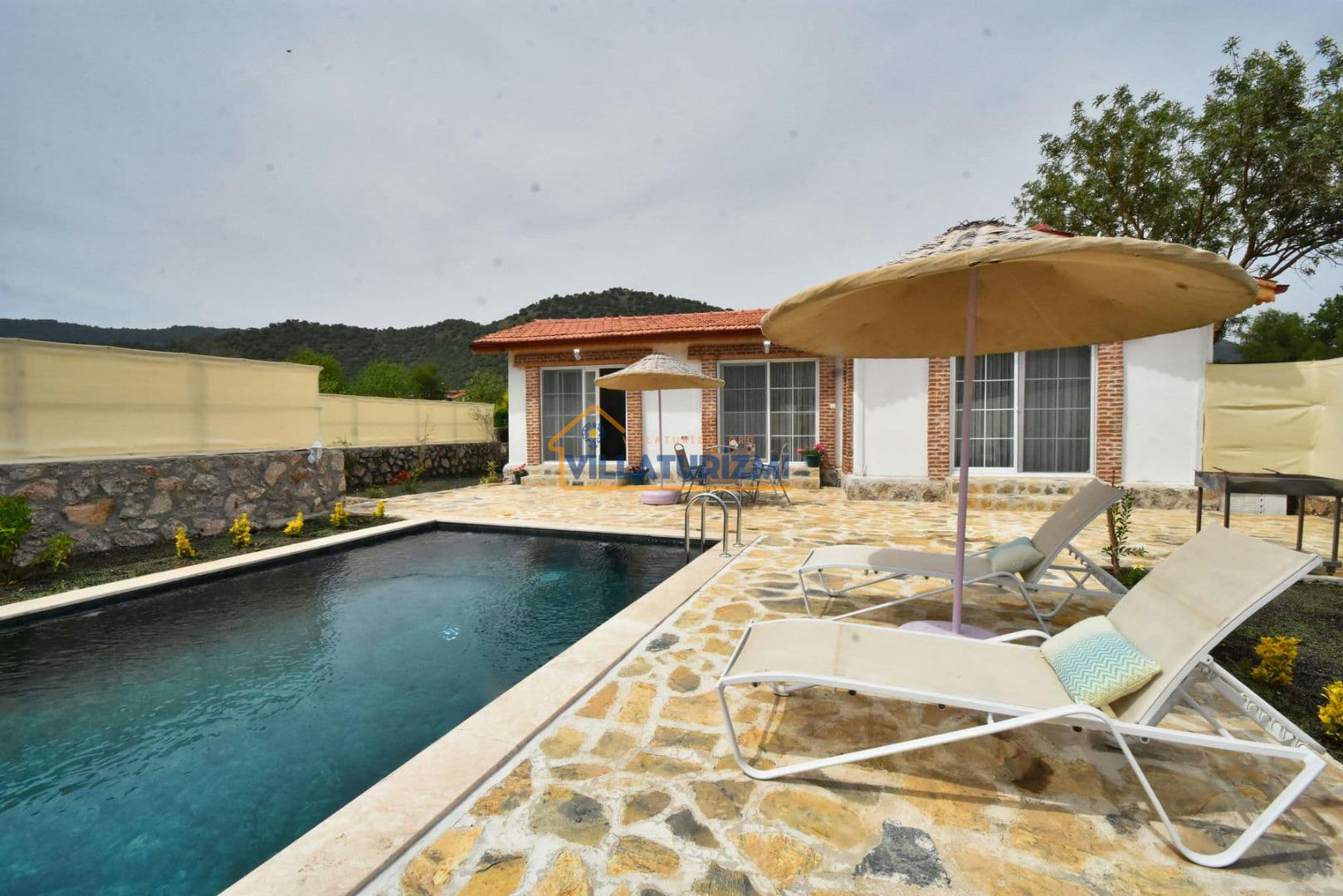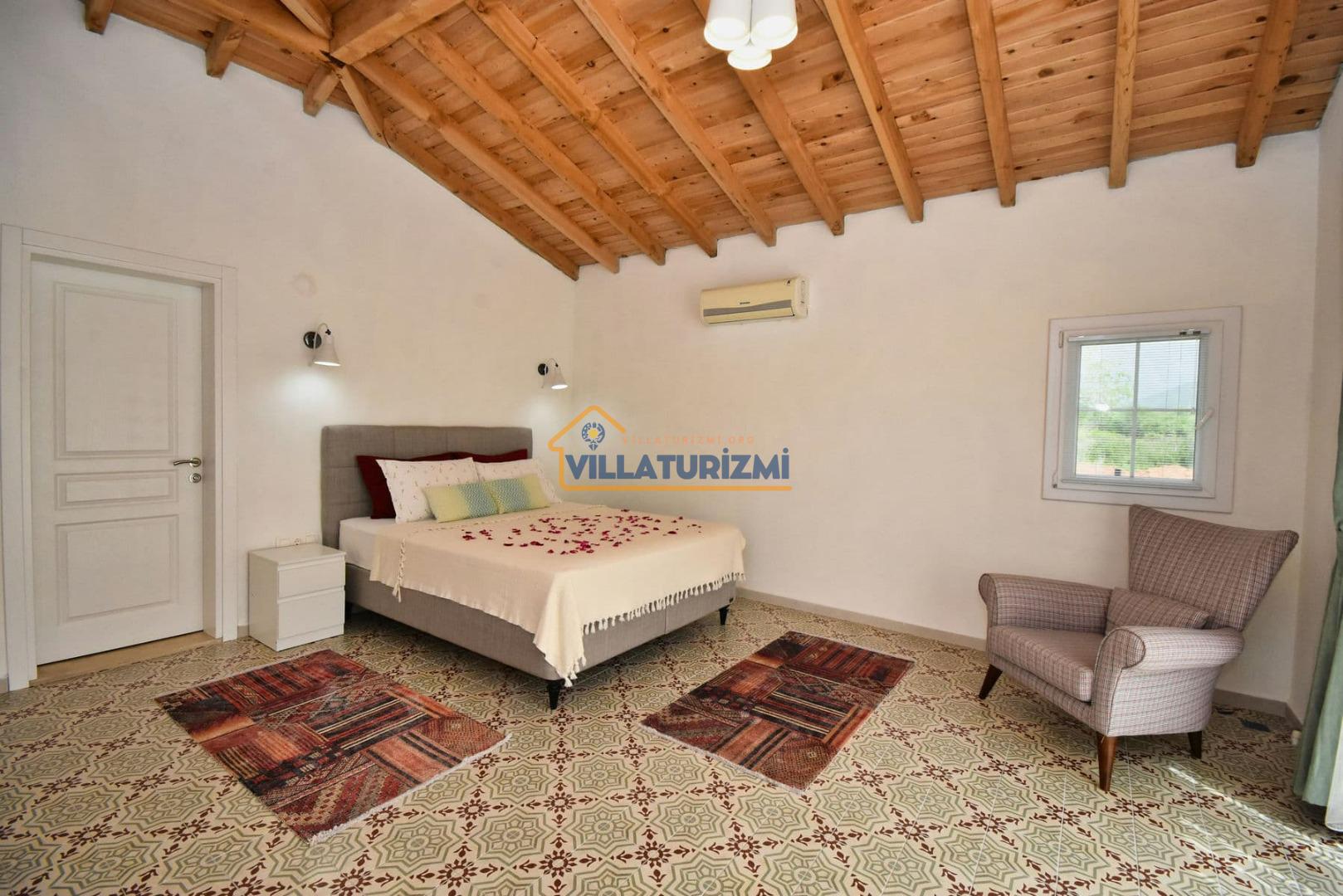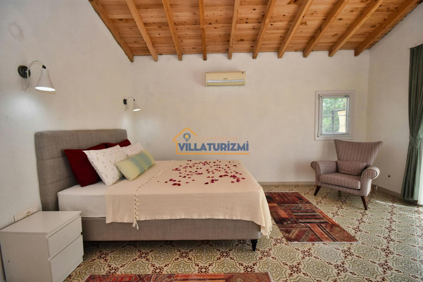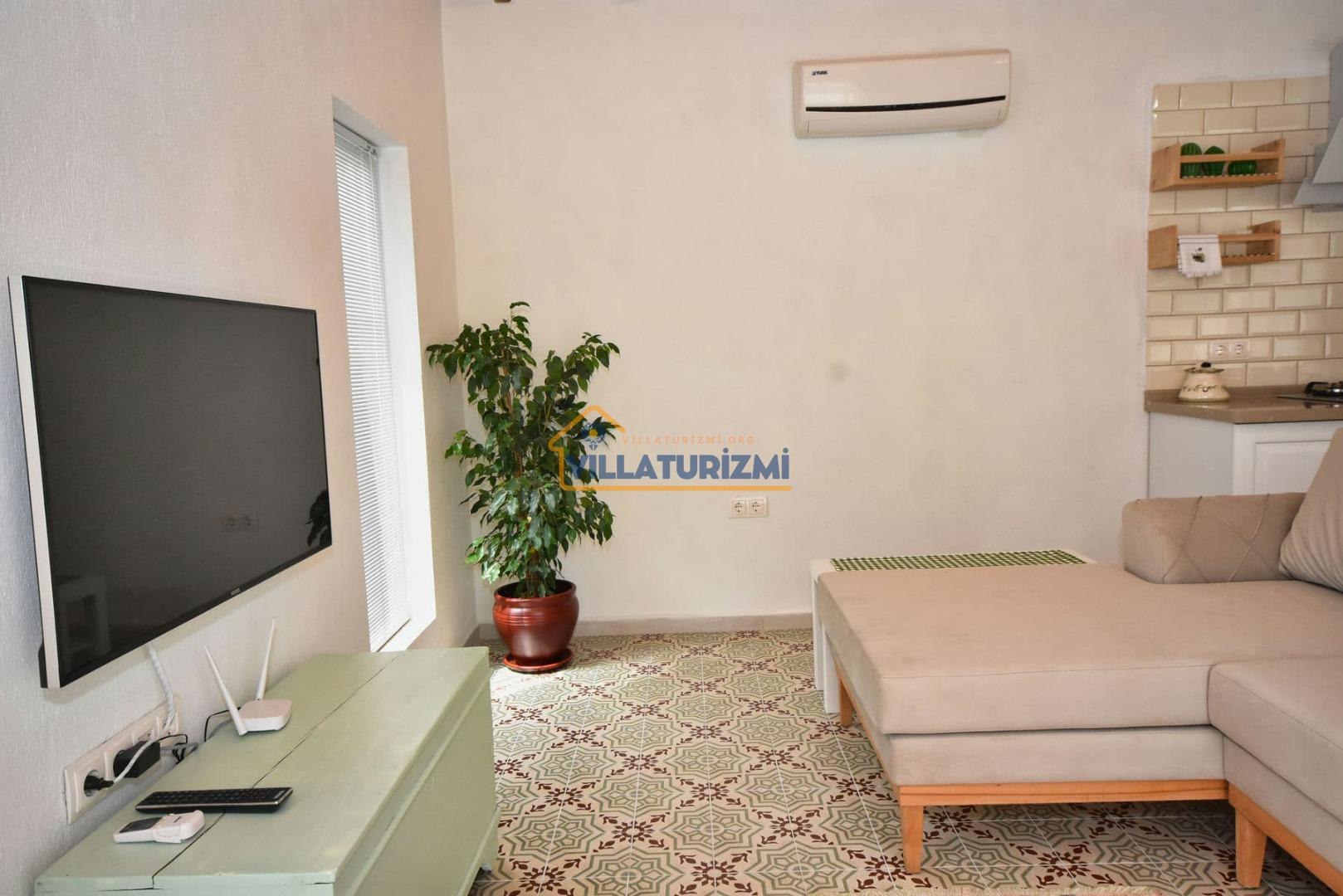 Villa Cansel'in 2 adet yatak odası ve yüzme havuzuna açılan açık mutfaklı oturma/yemek odasından oluşur. Mutfak kısmında bulunan yemek masası 6 kişi kapasitelidir.