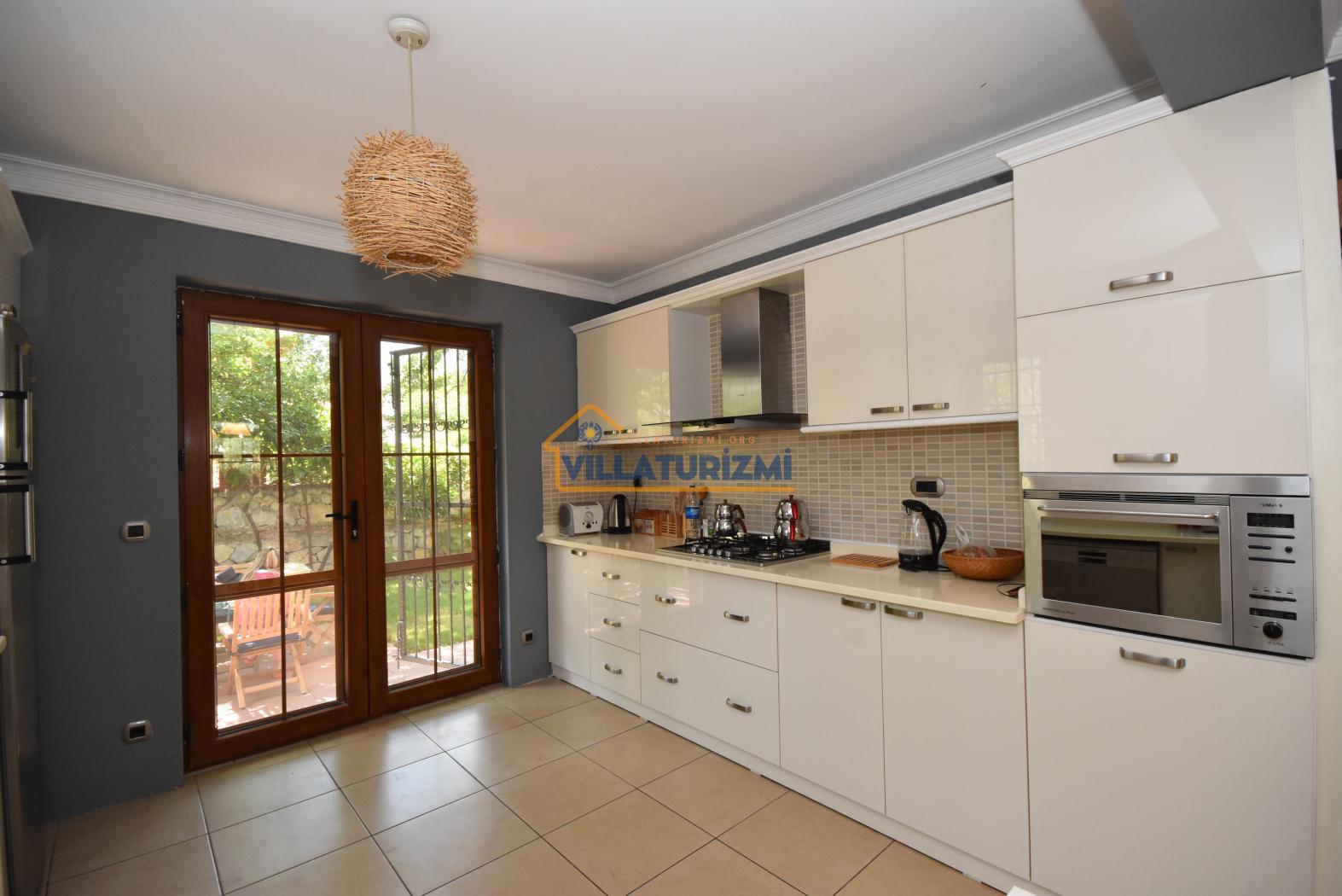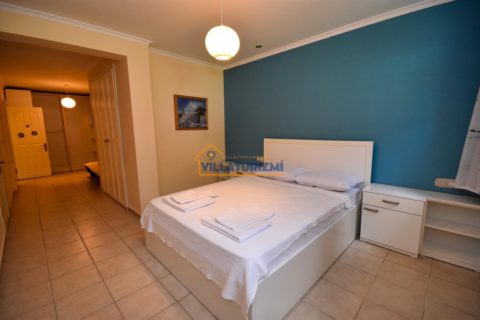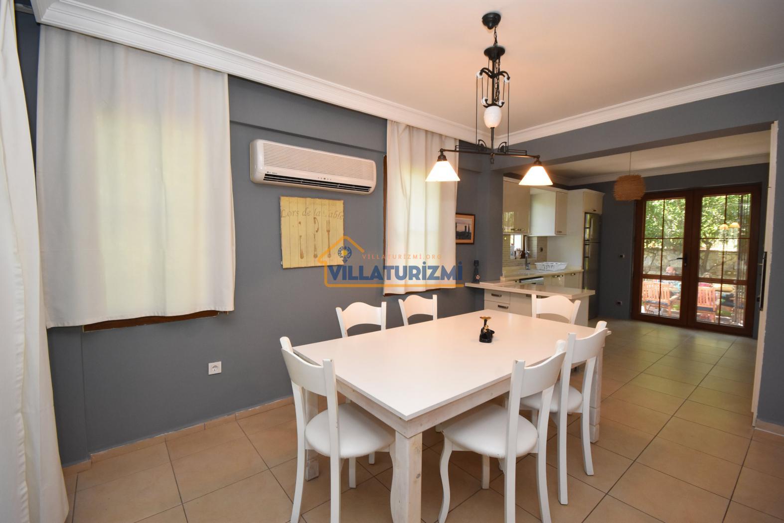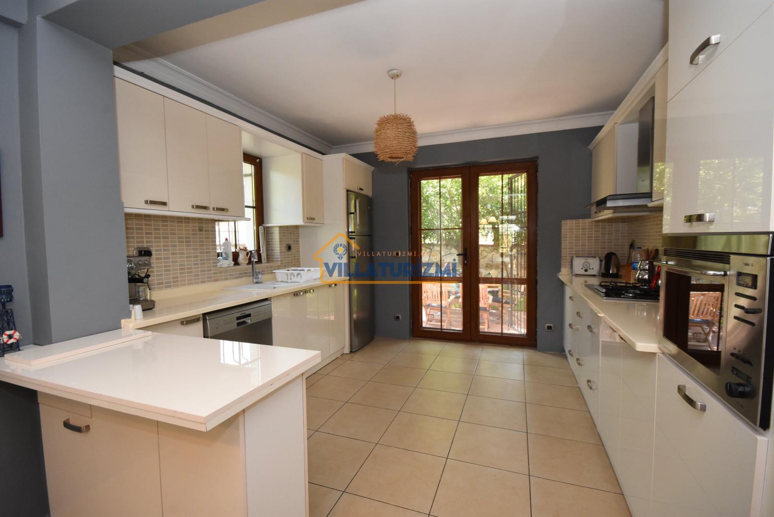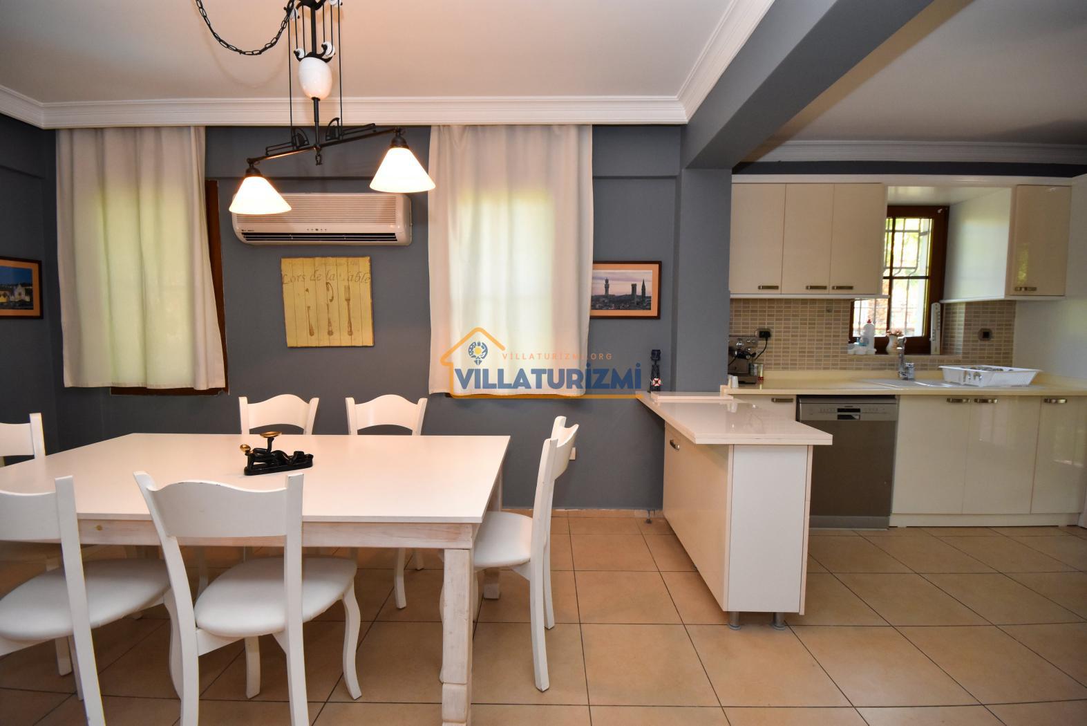 Villamız 6 yatak odası, 4 banyo ve yüzme havuzuna açılan açık mutfaklı oturma/yemek odasından oluşur. Mutfak kısmında bulunan yemek masası 10 kişi kapasitelidir.