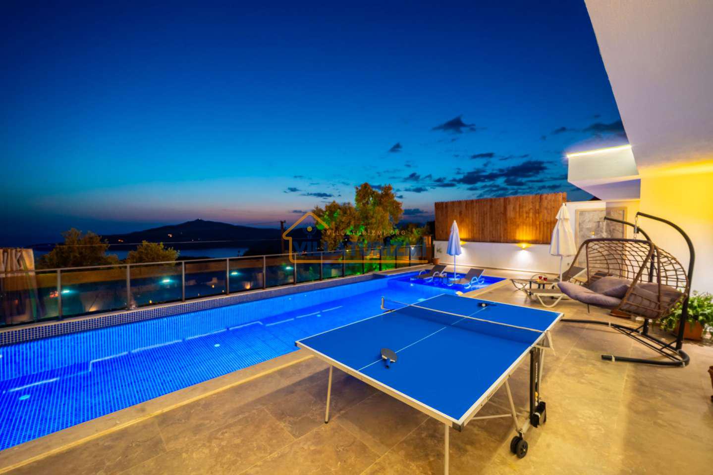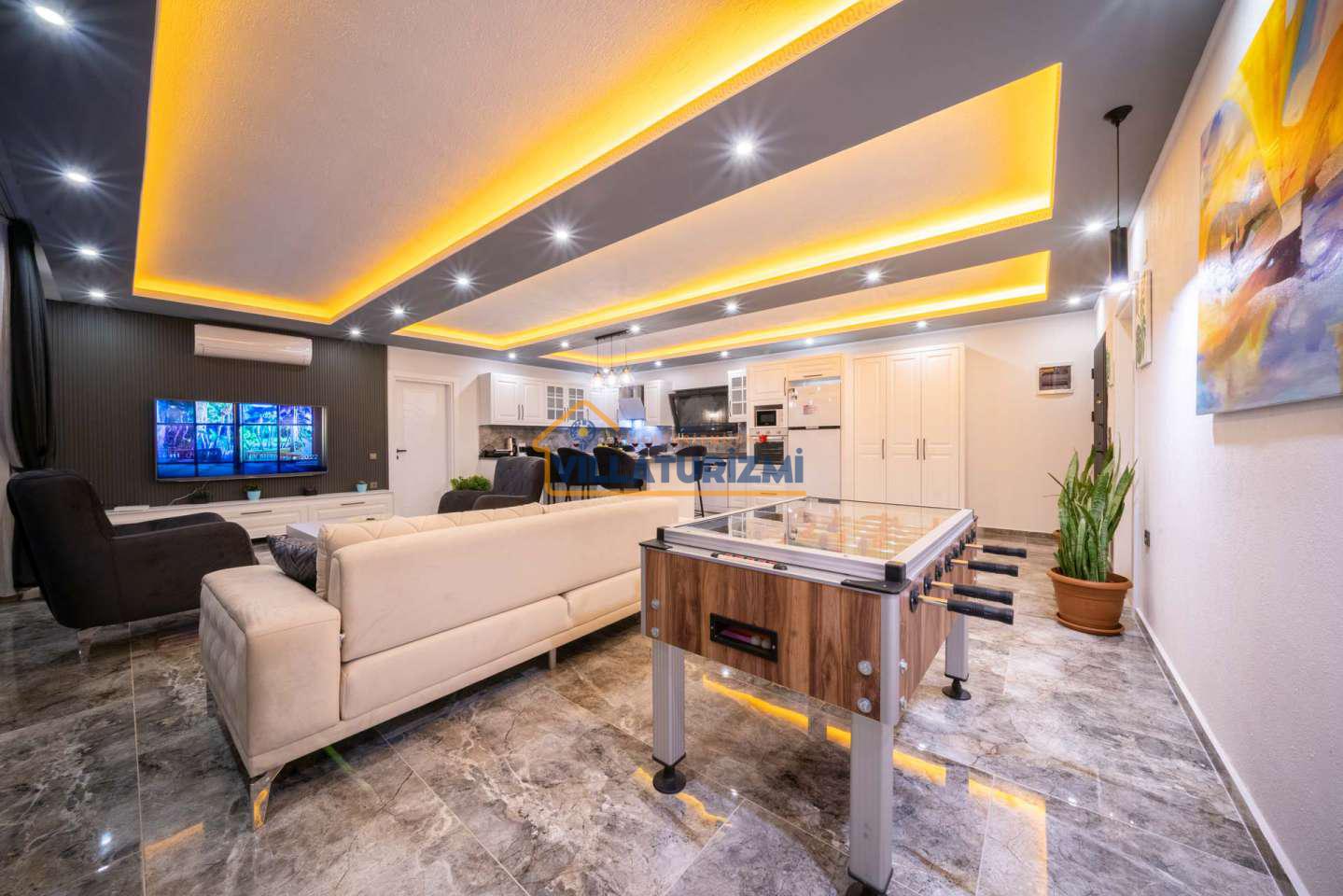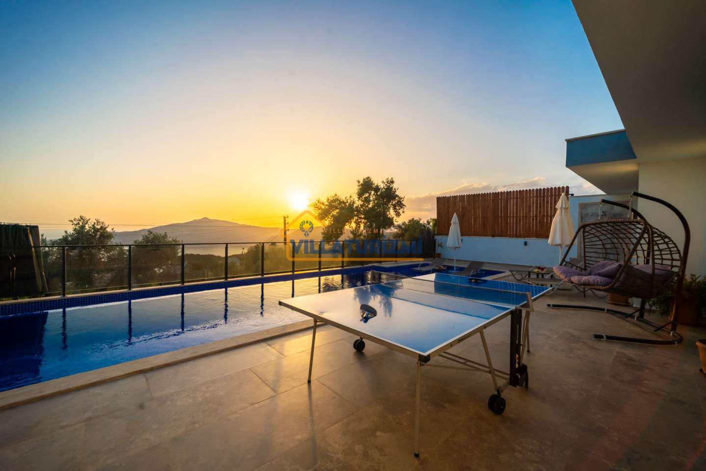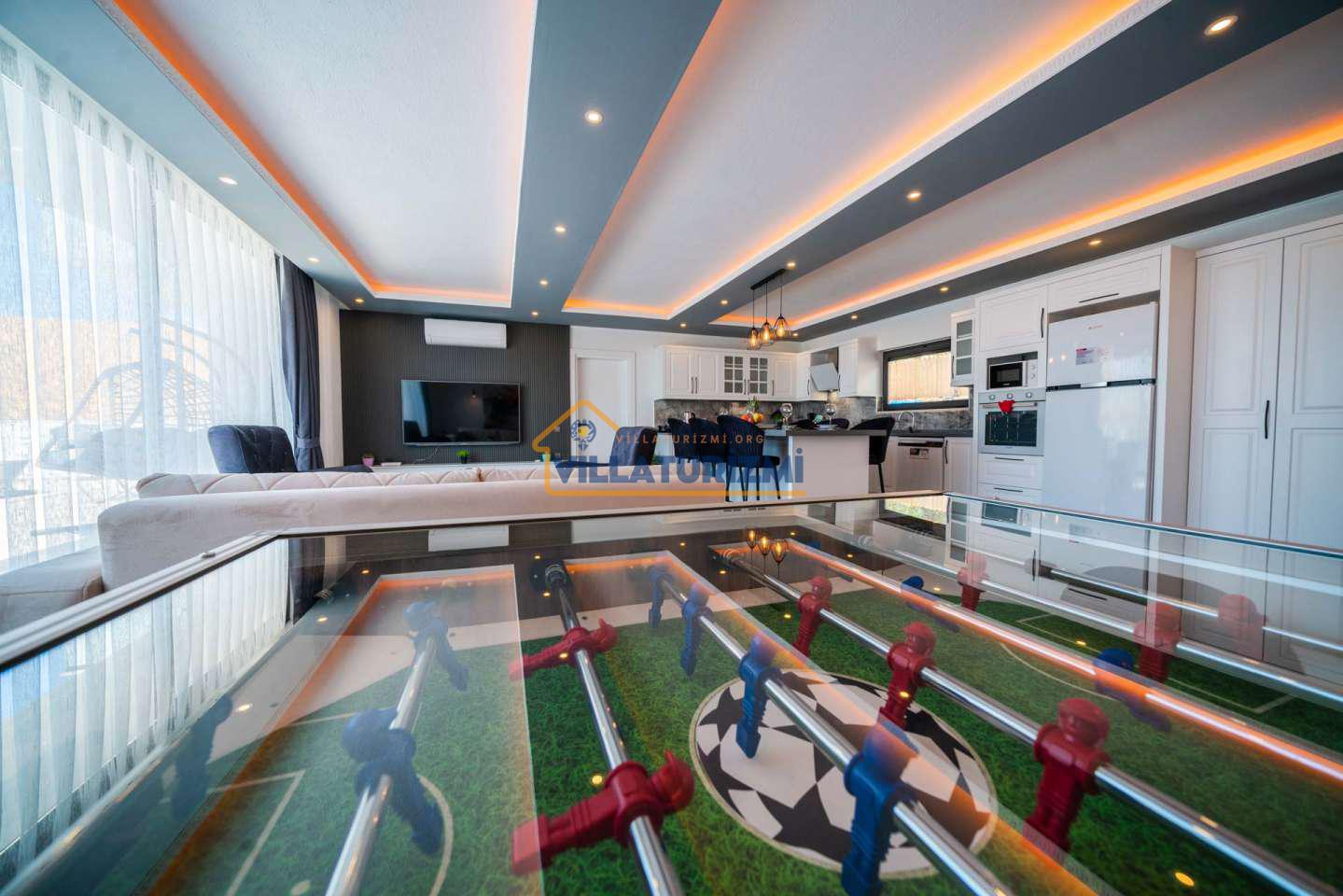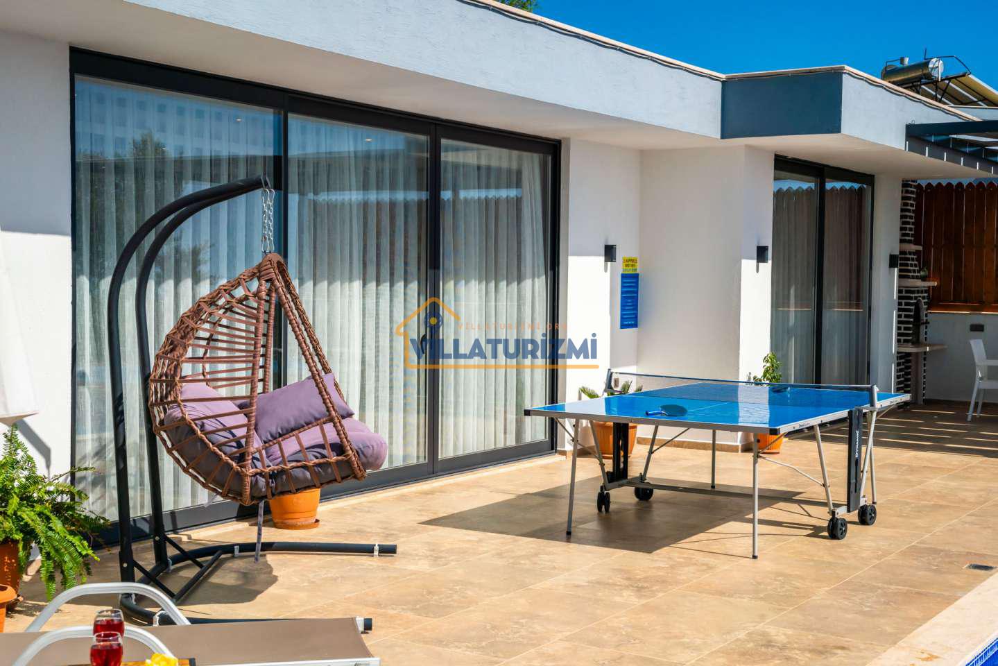 Arka bahçesinde yer alan mini oyun parkı, langırt ve masa tenisi gibi aktiviteler ise özellikle çocuklu aileler için mükemmel bir seçenek oluşturuyor. Aileler için ideal bir tatil konaklama deneyimi sunan bu villamız, balayı çiftleri için de romantik ve huzurlu bir ortam sunuyor.