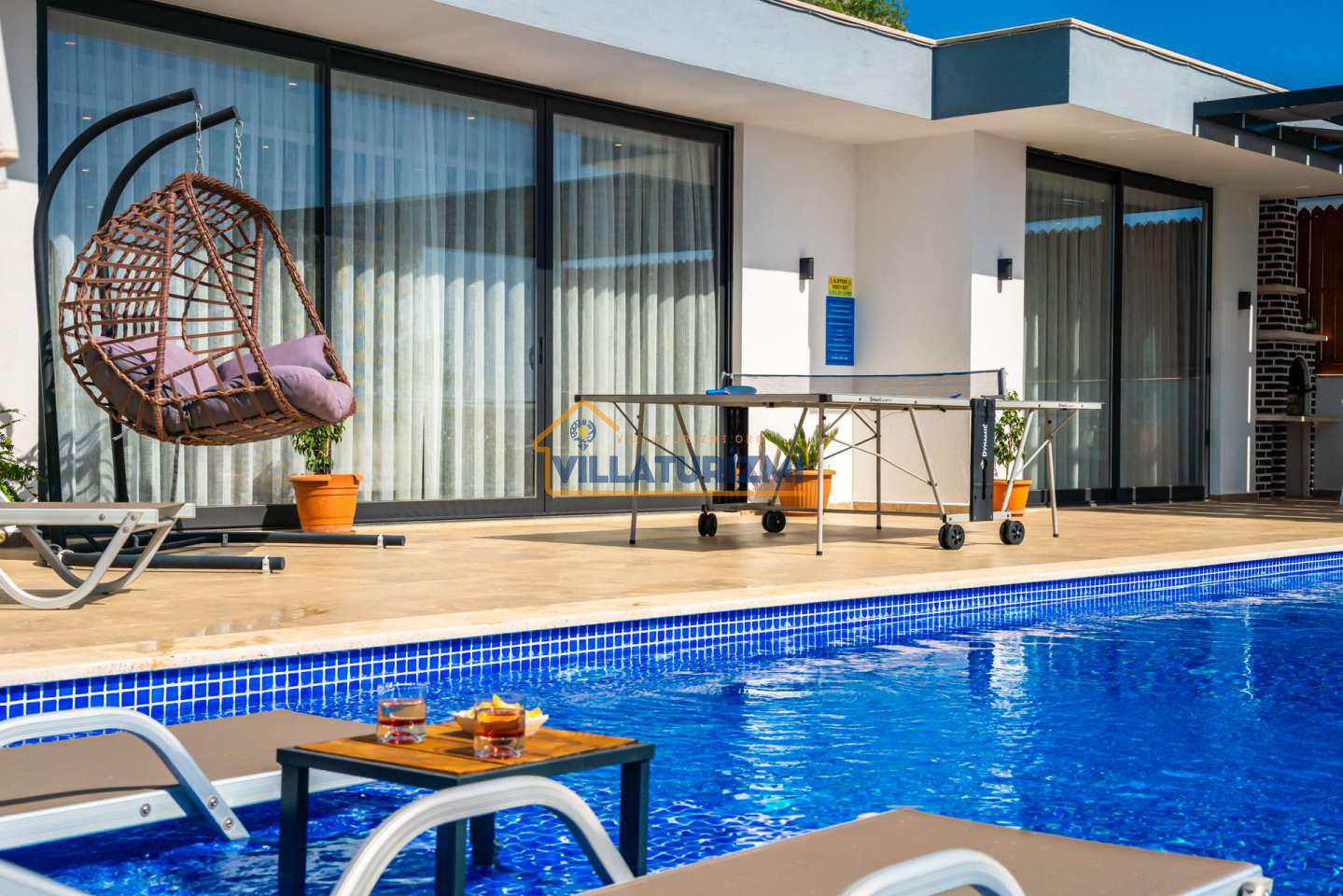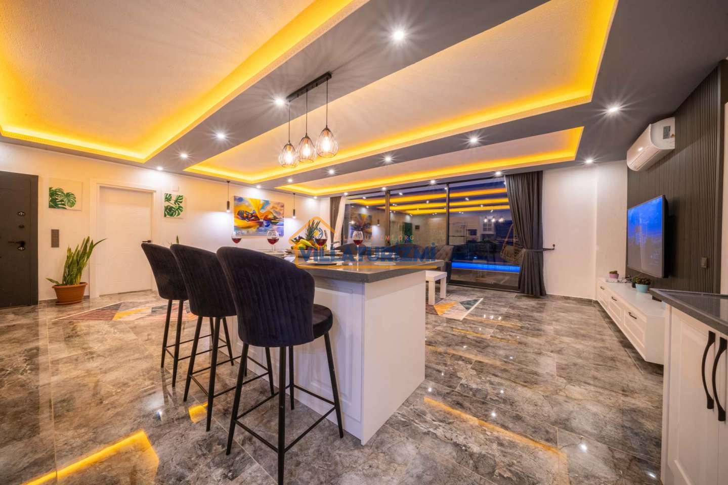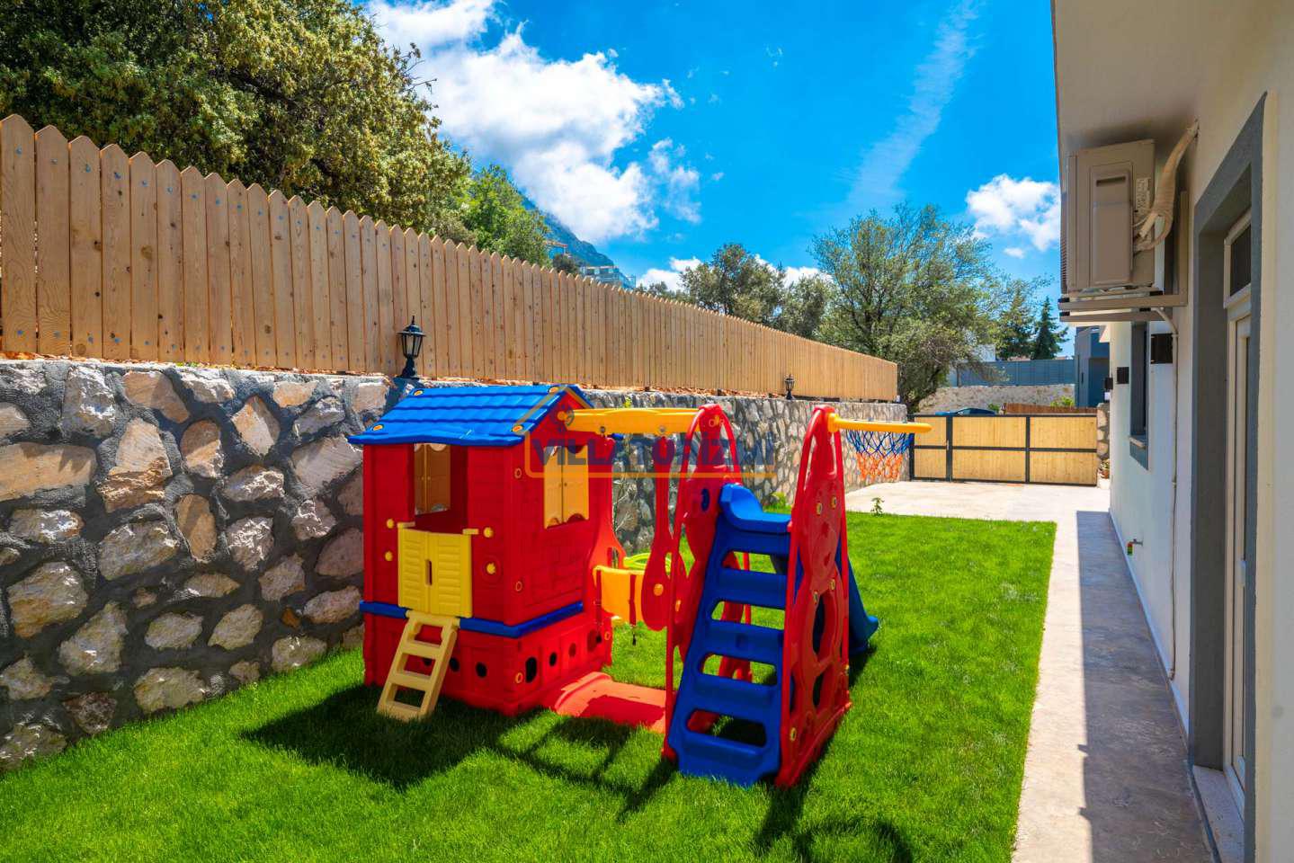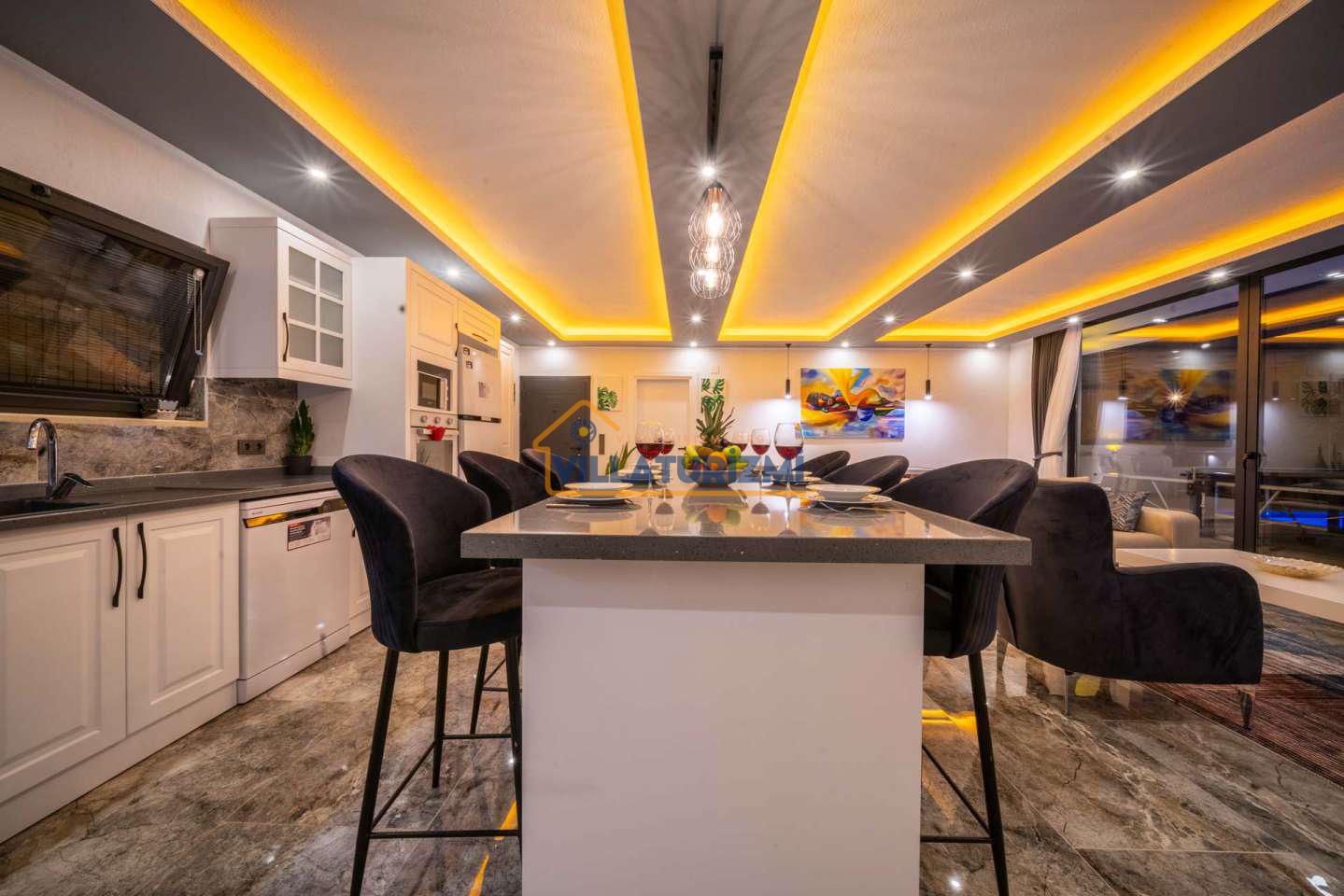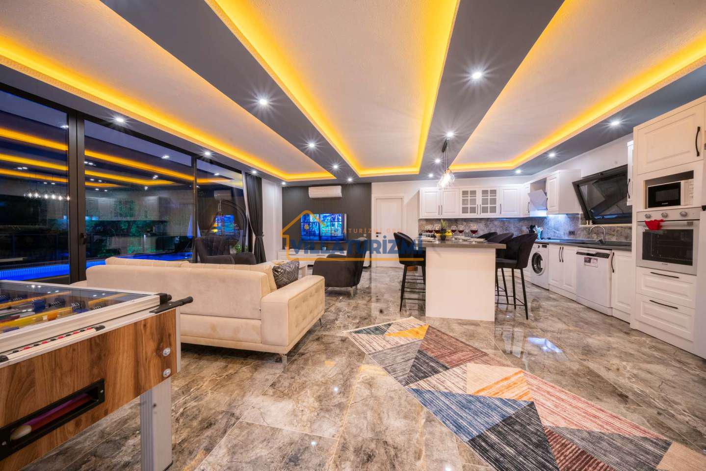 Arka bahçesinde yer alan mini oyun parkı, langırt ve masa tenisi gibi aktiviteler ise özellikle çocuklu aileler için mükemmel bir seçenek oluşturuyor. Aileler için ideal bir tatil konaklama deneyimi sunan bu villamız, balayı çiftleri için de romantik ve huzurlu bir ortam sunuyor.