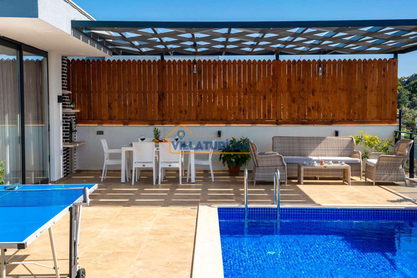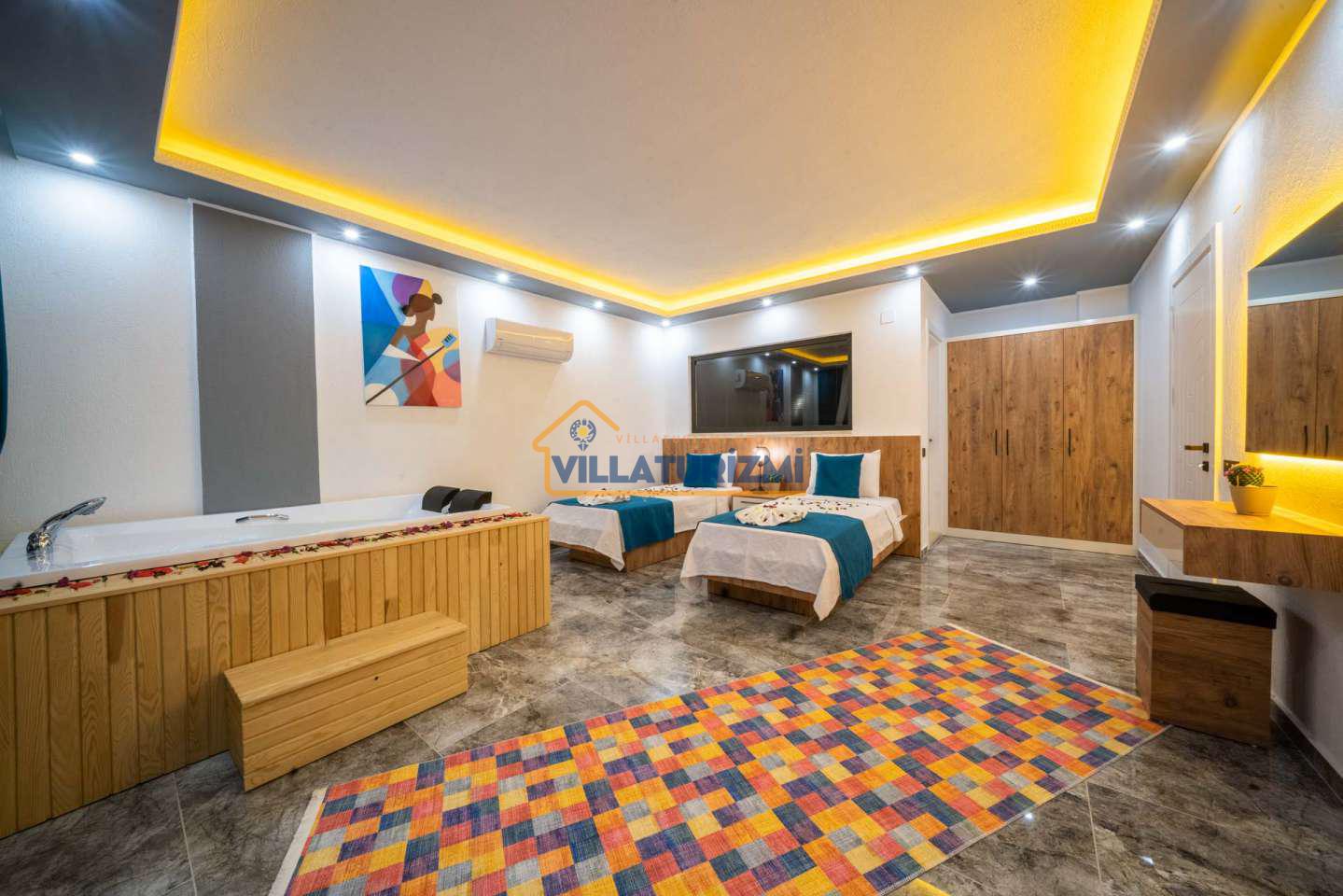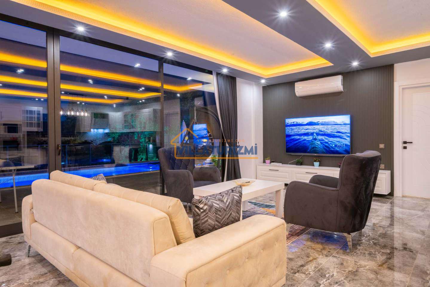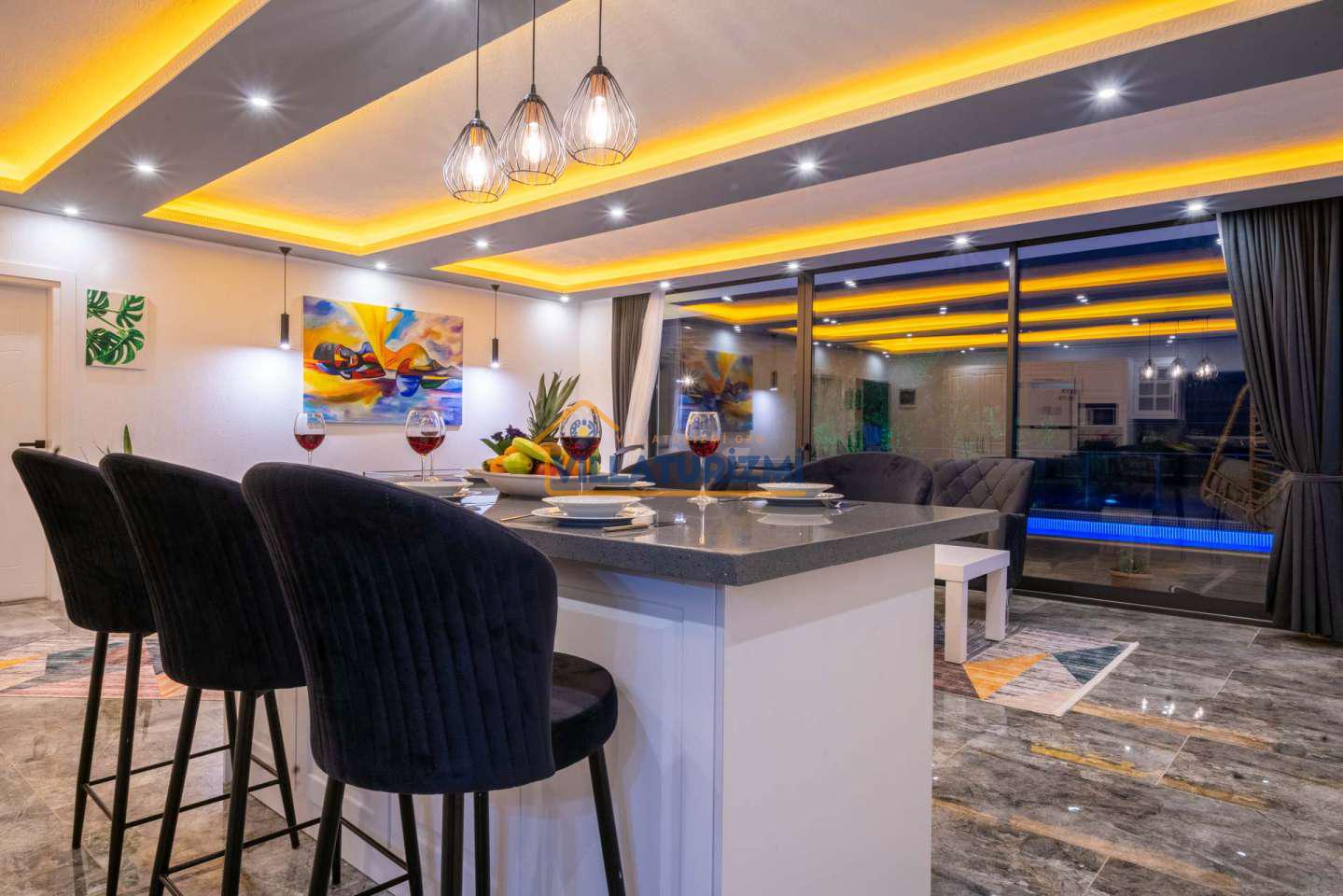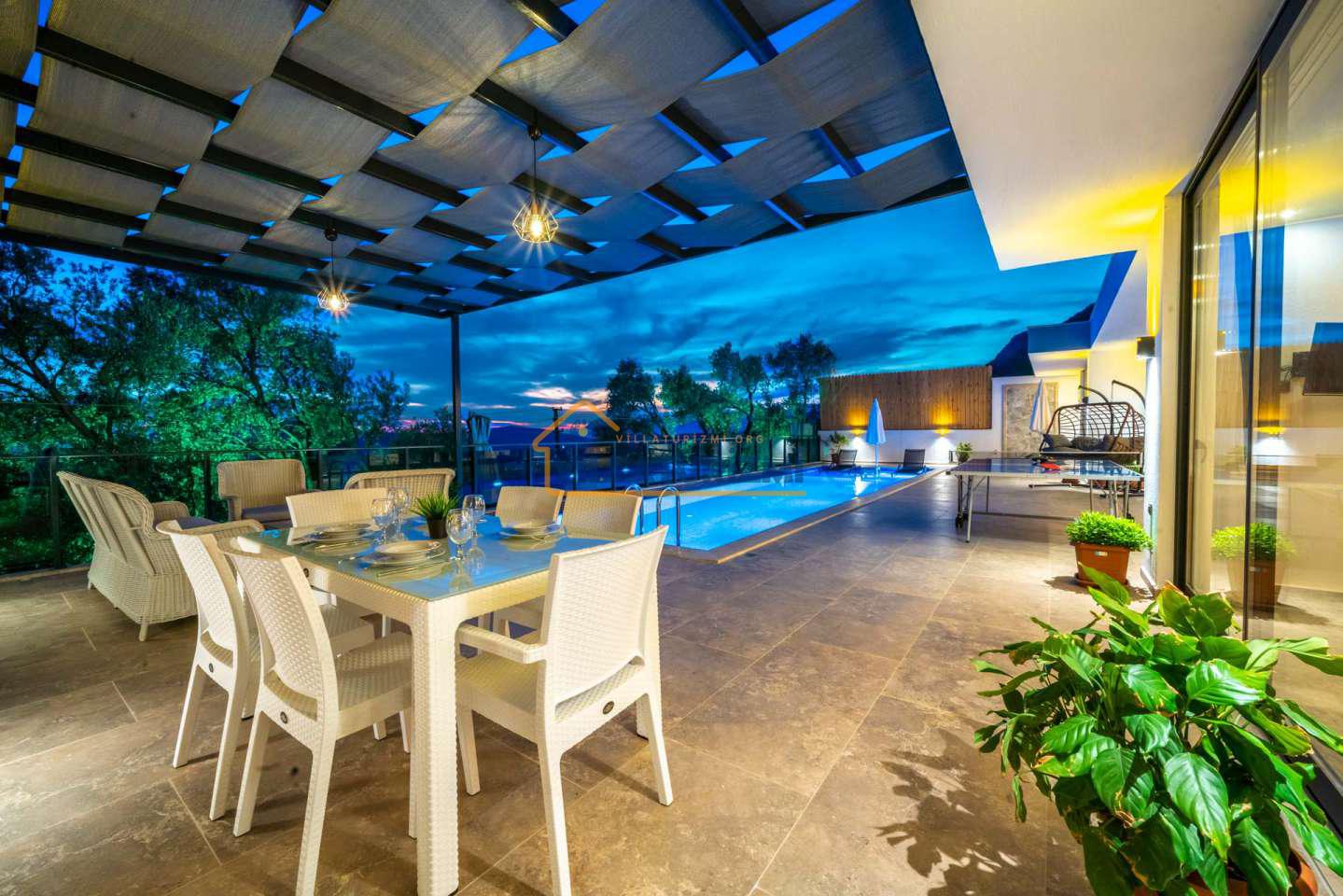 Arka bahçesinde yer alan mini oyun parkı, langırt ve masa tenisi gibi aktiviteler ise özellikle çocuklu aileler için mükemmel bir seçenek oluşturuyor. Aileler için ideal bir tatil konaklama deneyimi sunan bu villamız, balayı çiftleri için de romantik ve huzurlu bir ortam sunuyor.