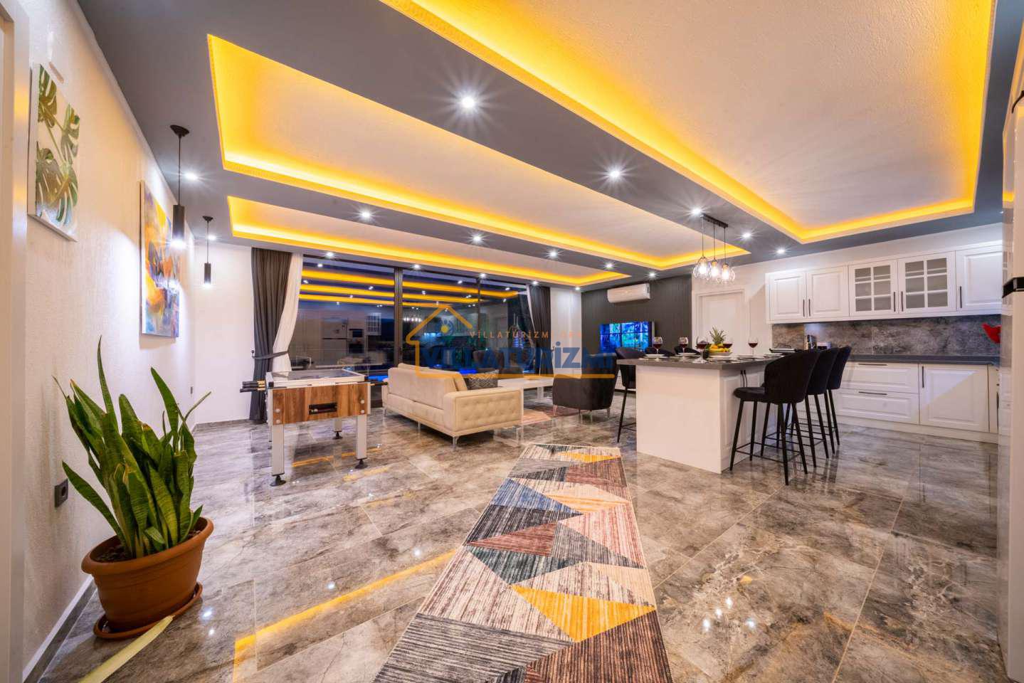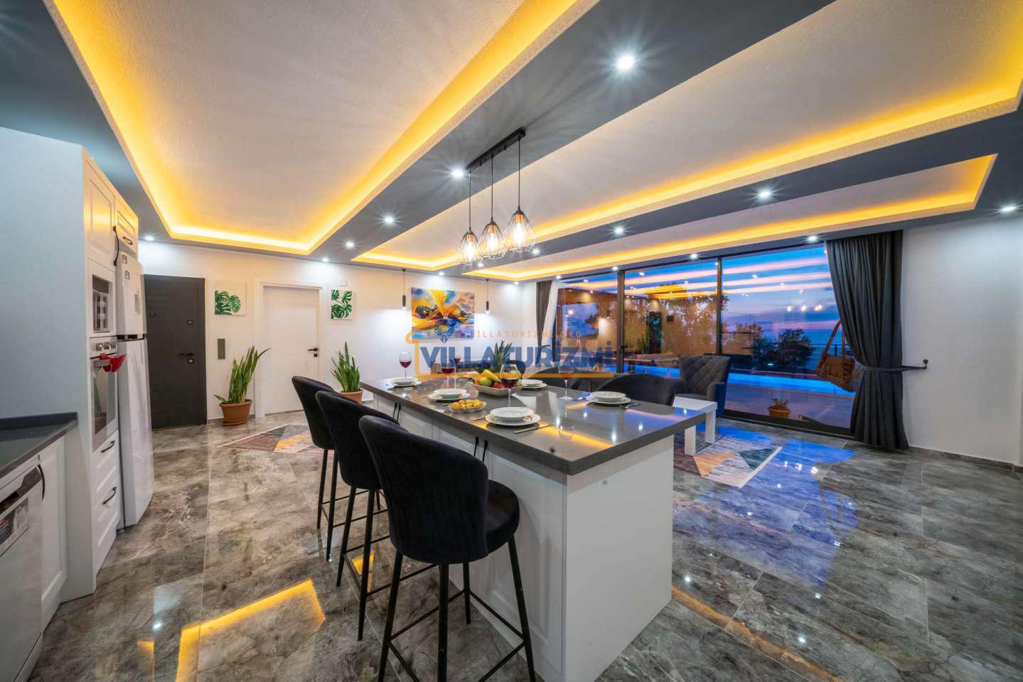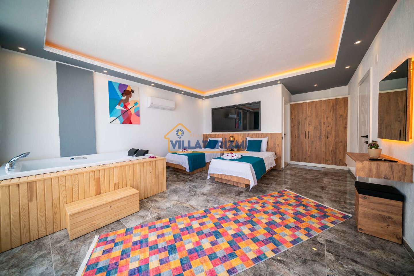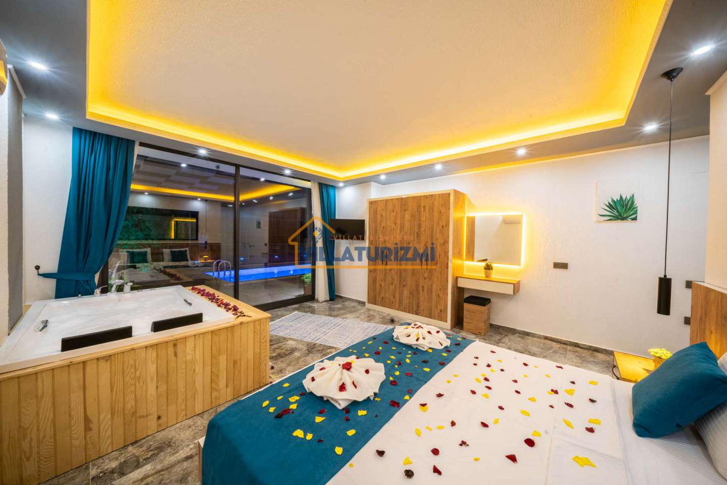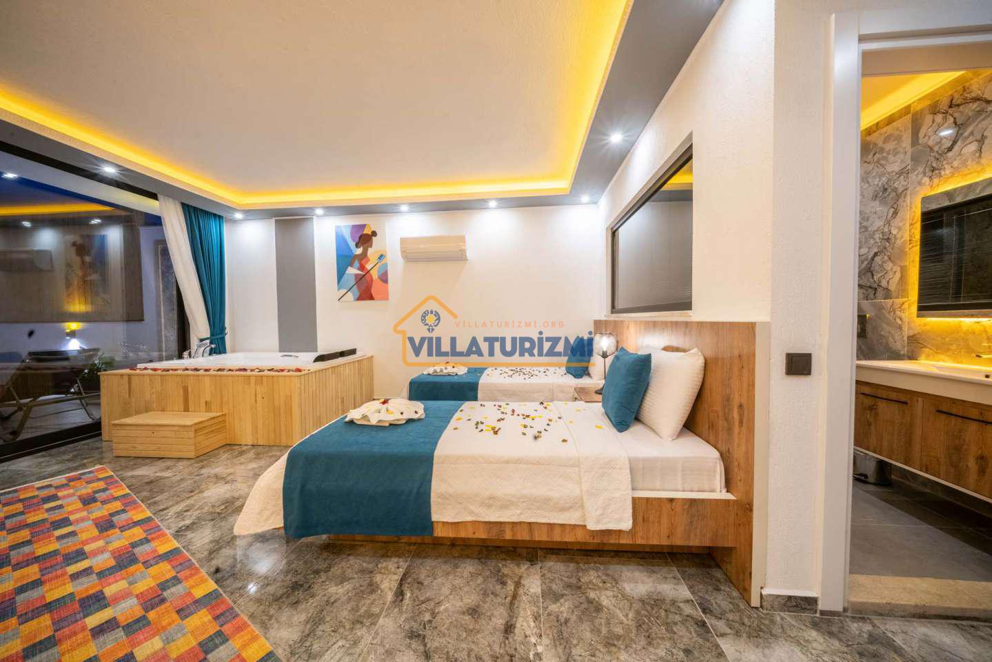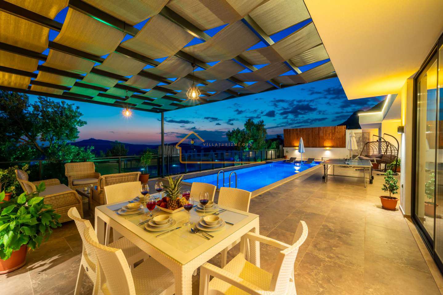 Arka bahçesinde yer alan mini oyun parkı, langırt ve masa tenisi gibi aktiviteler ise özellikle çocuklu aileler için mükemmel bir seçenek oluşturuyor. Aileler için ideal bir tatil konaklama deneyimi sunan bu villamız, balayı çiftleri için de romantik ve huzurlu bir ortam sunuyor.