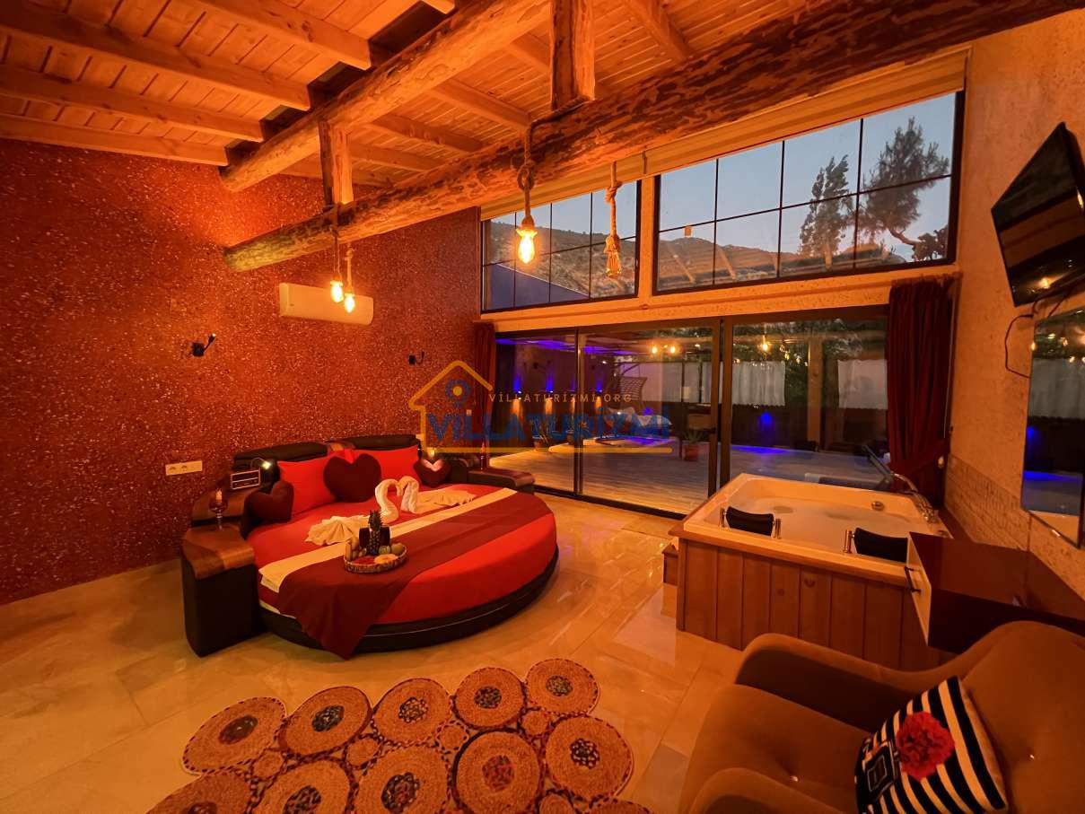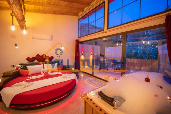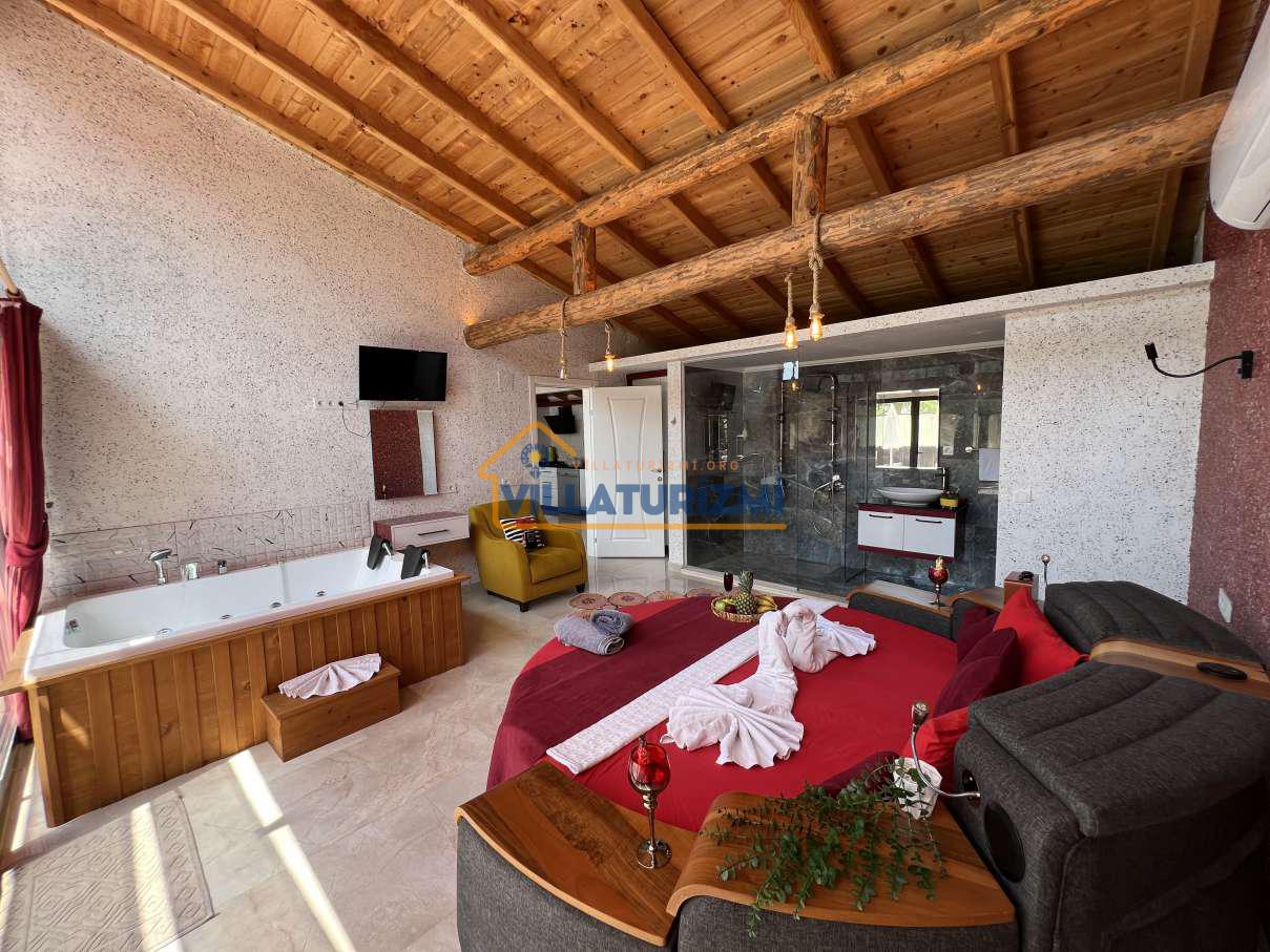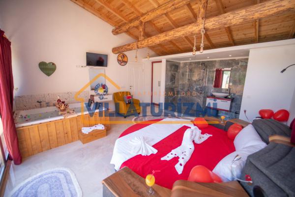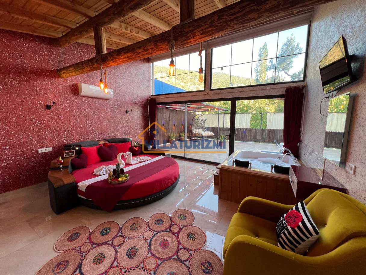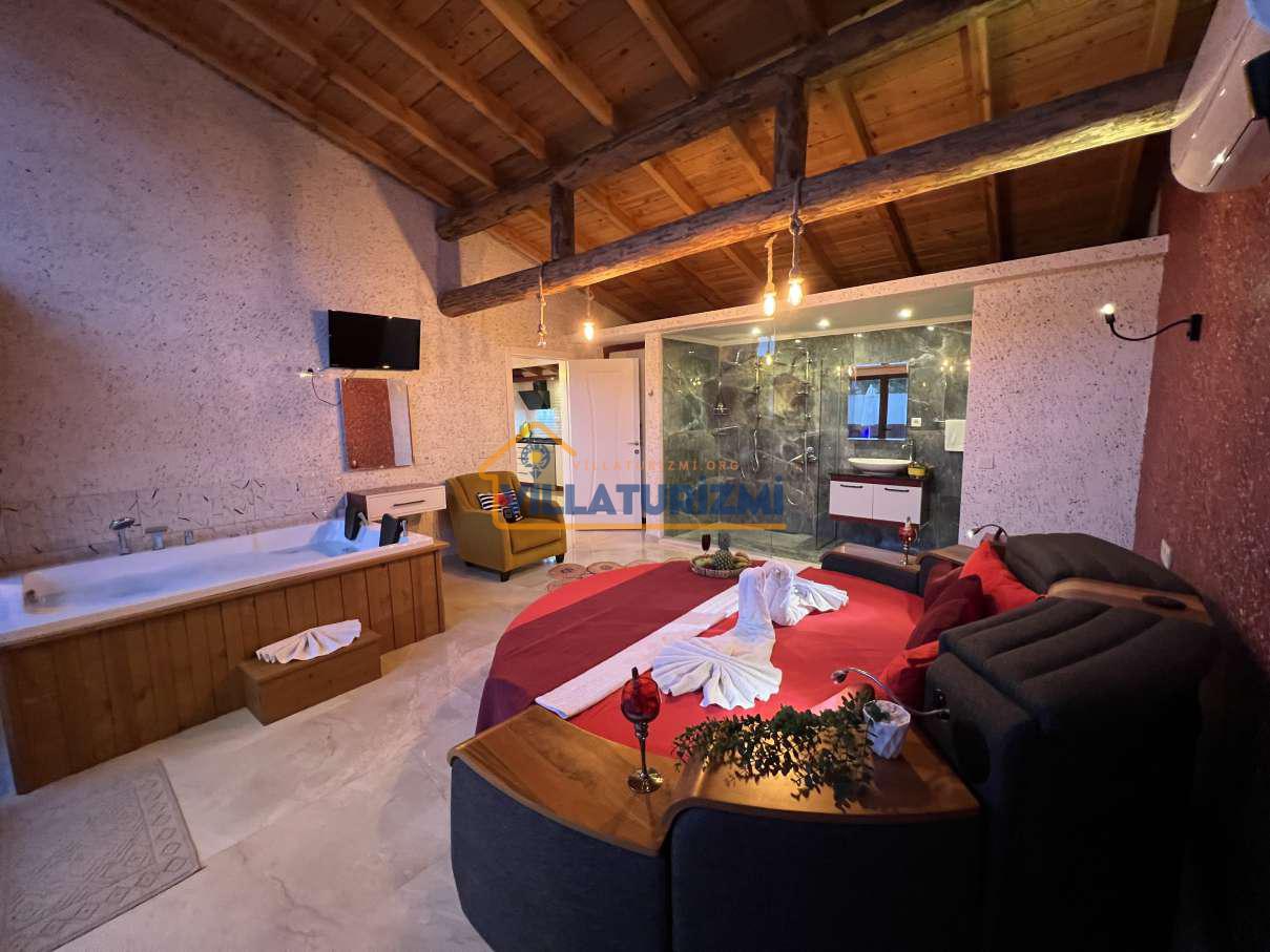 Yatak Odası;Çift kişilik yatak, komodin, klima, makyaj masası, gardırop, jakuzi, banyo ve tuvalet.