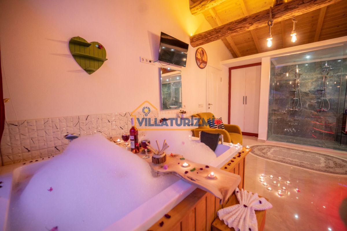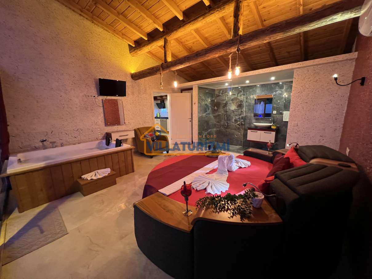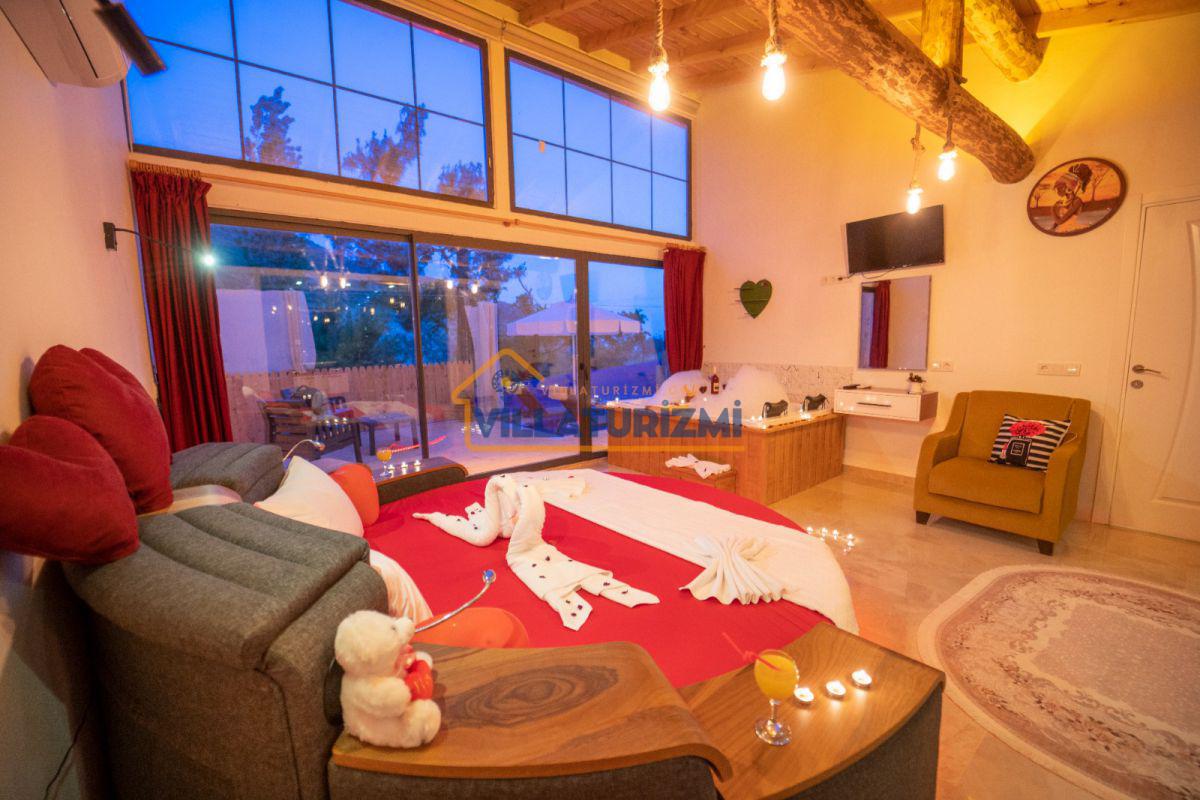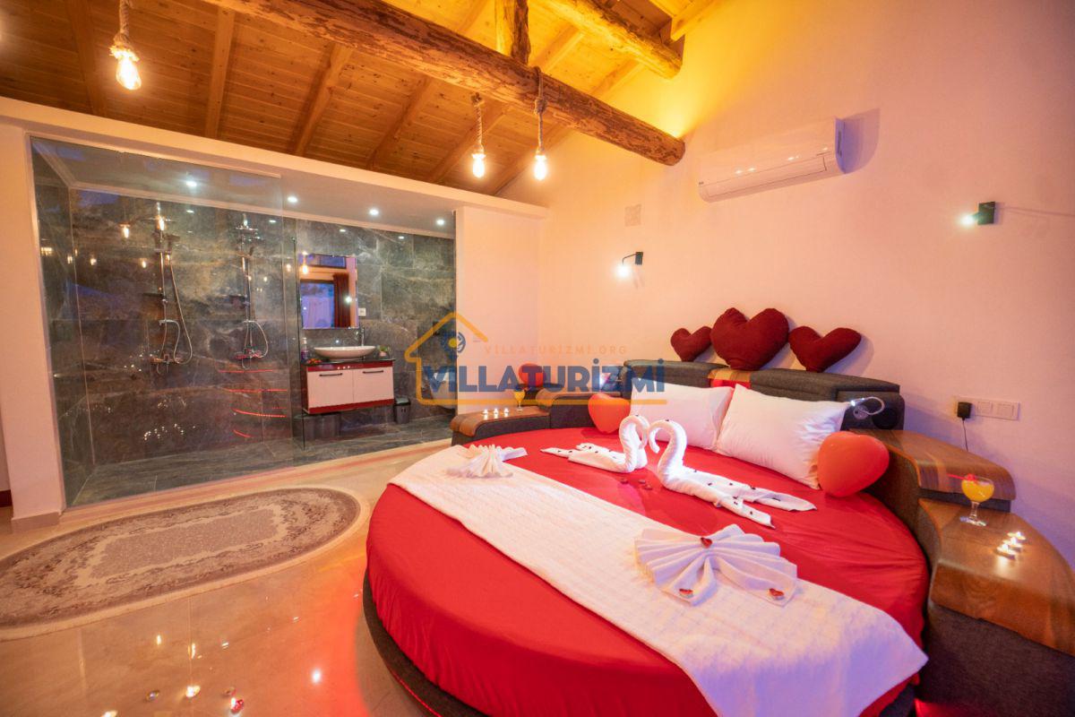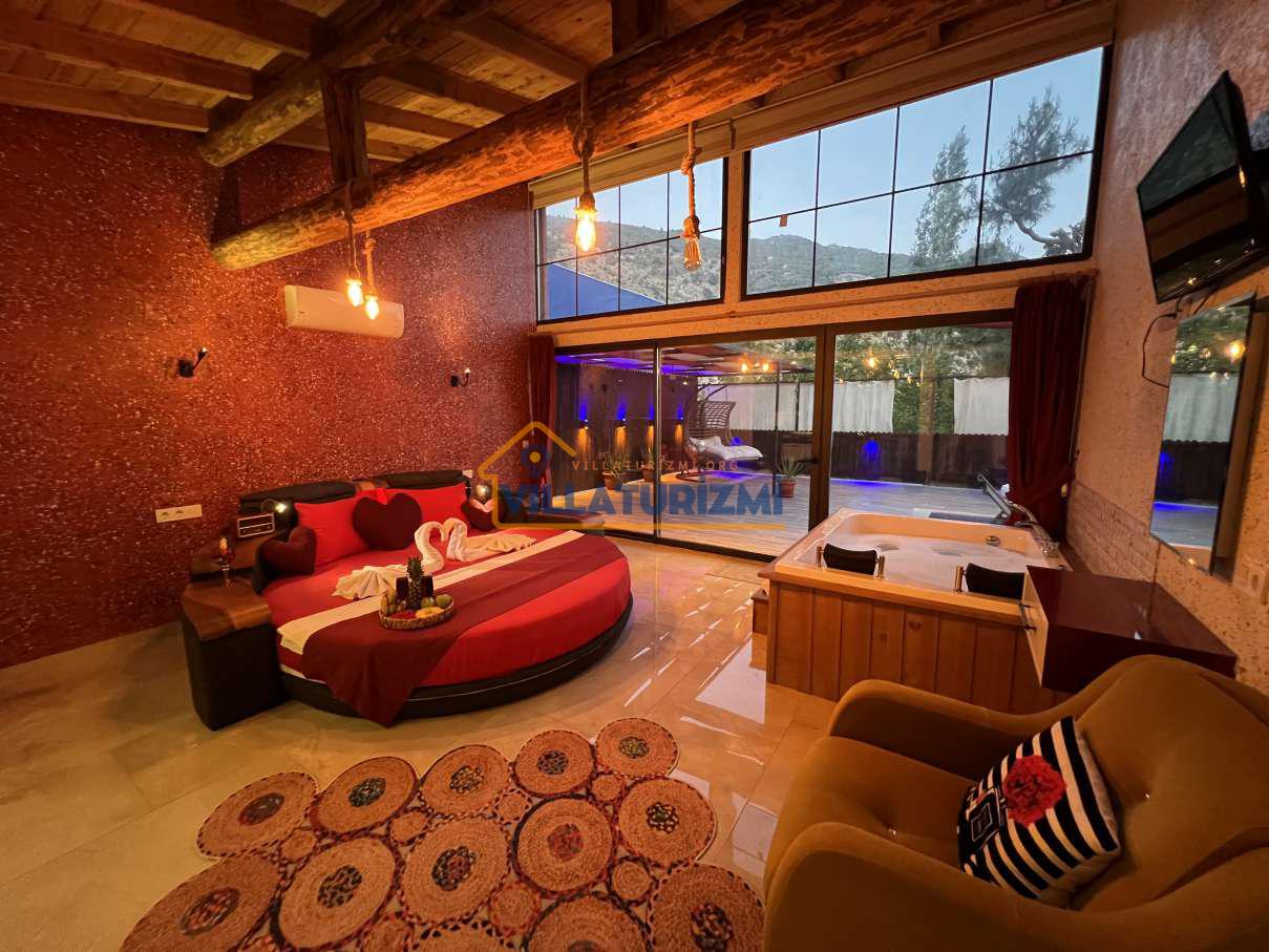 Yatak Odası;Çift kişilik yatak, komodin, klima, makyaj masası, gardırop, jakuzi, banyo ve tuvalet.