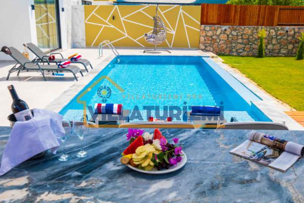 Havuz Terası: Geniş bahçemizde şezlong, güneş şemsiyesi, bahçe yemek masası, salıncak, barbekü bulunmaktadır.