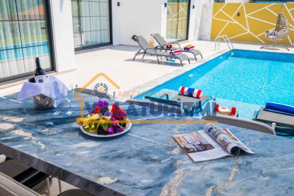 Villamızın iç tasarımı da oldukça modern ve konforlu. Ferah bir oturma alanı, doğal dokuyla uyum içerisinde tasarlanmış bir mutfak ve dinlenme alanları, tatiliniz süresince ihtiyacınız olan tüm olanakları sunuyor.