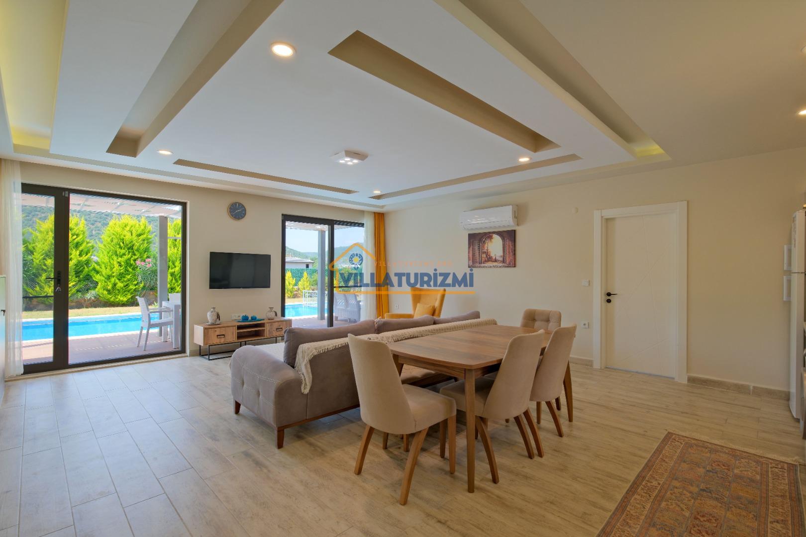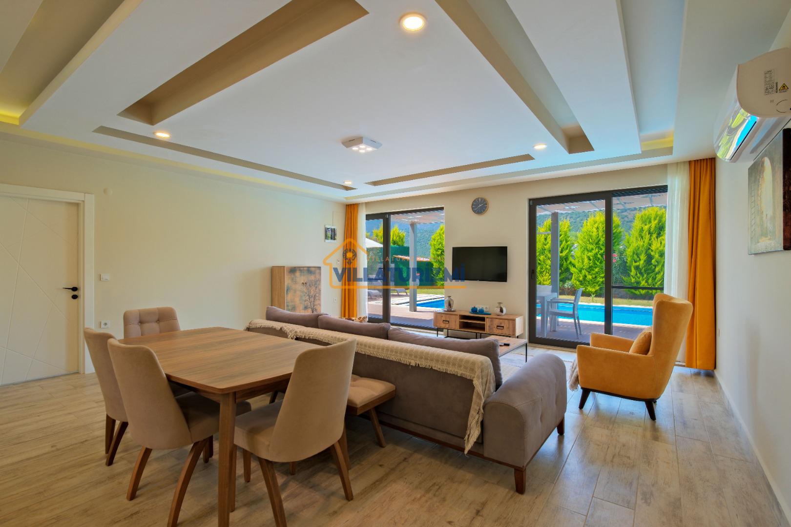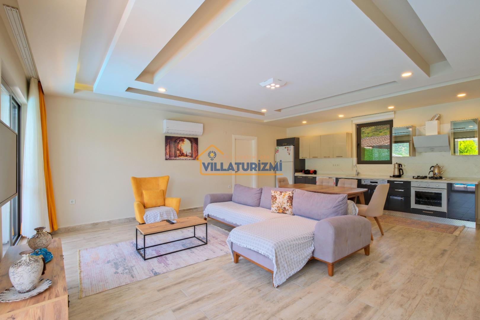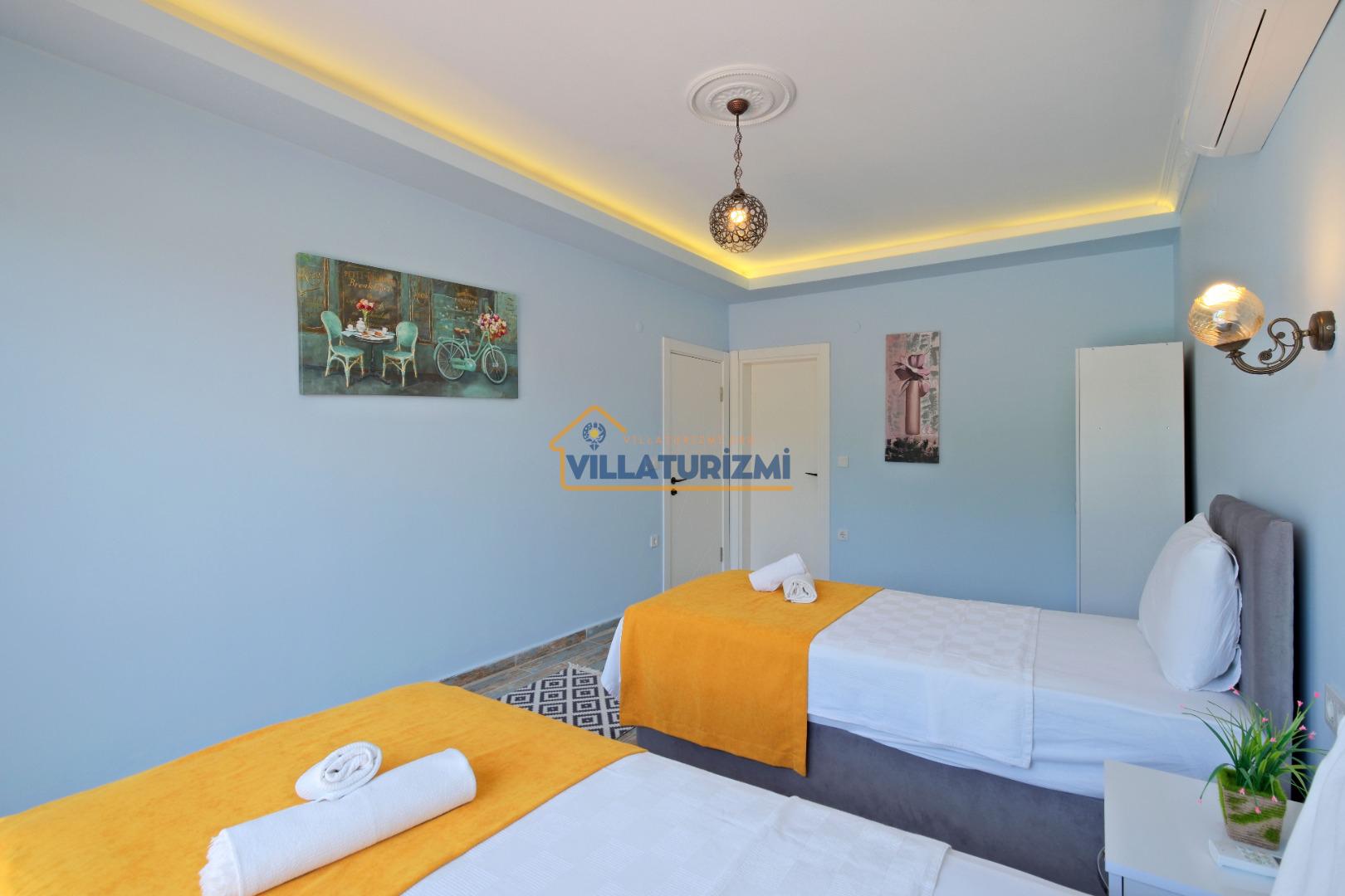 Villamız iki yatak odalıdır. Birinci yatak odasının içerisinde çift kişilik yatak, klima, jakuzi ve banyo bulunmaktadır. İkinci yatak odasında iki tek kişilik yatak, banyo ve klima yer almaktadır. Salon içerisinde mutfak, oturma grubu, televizyon ve klima bulunmaktadır.
