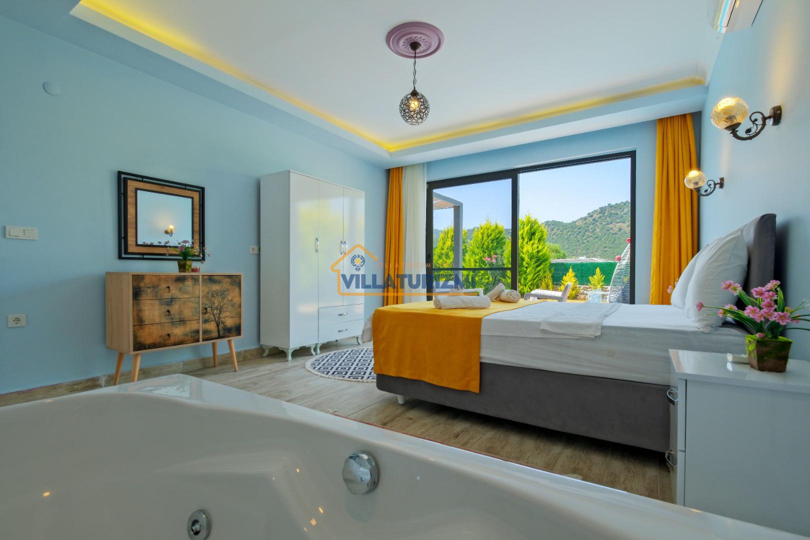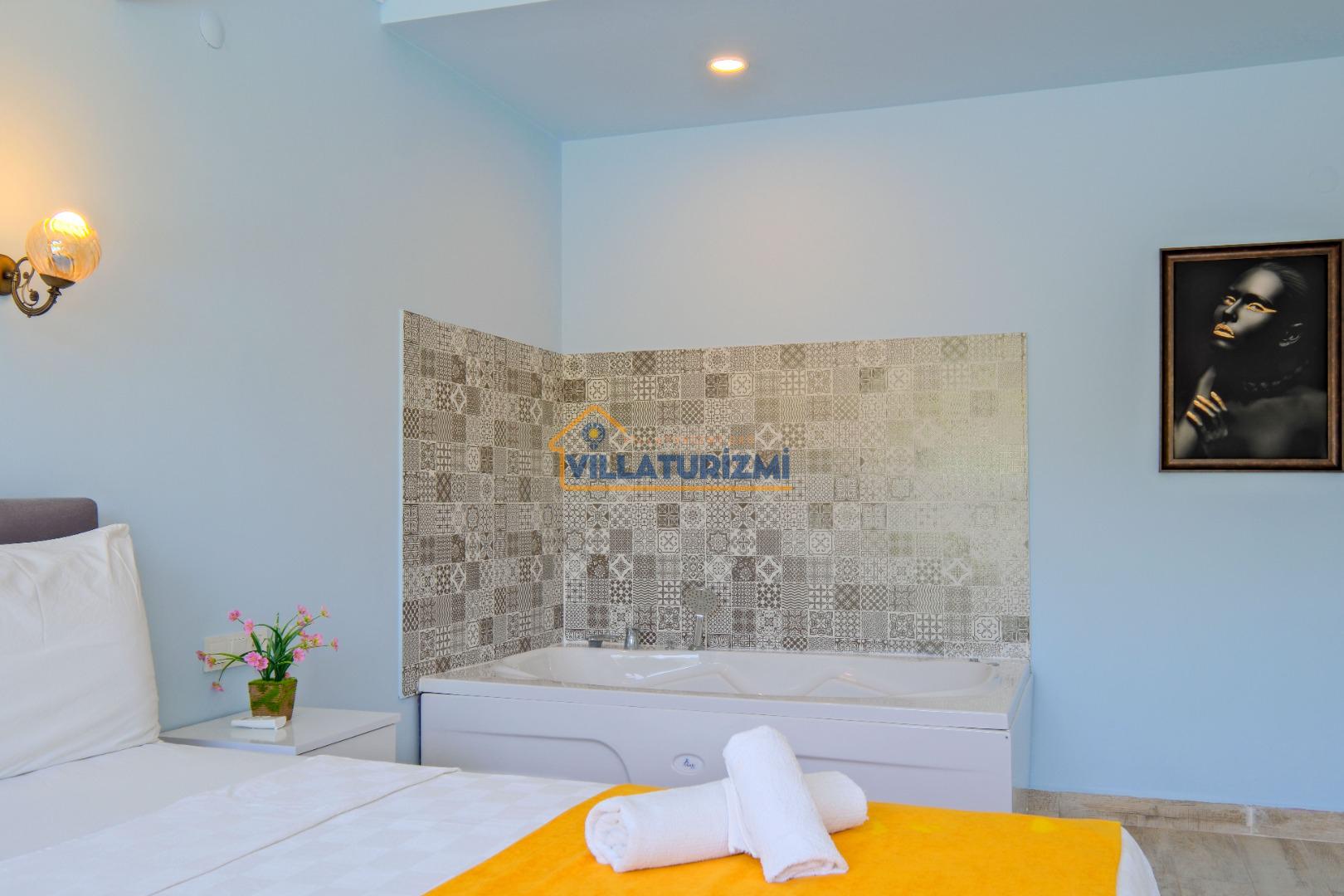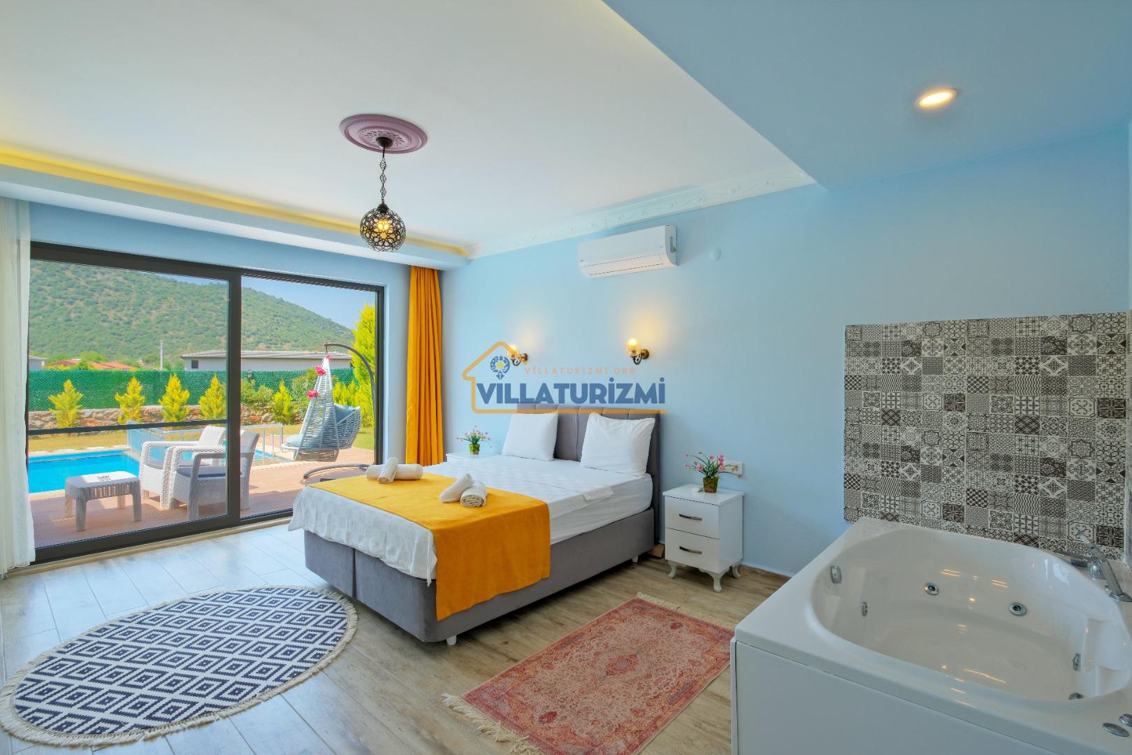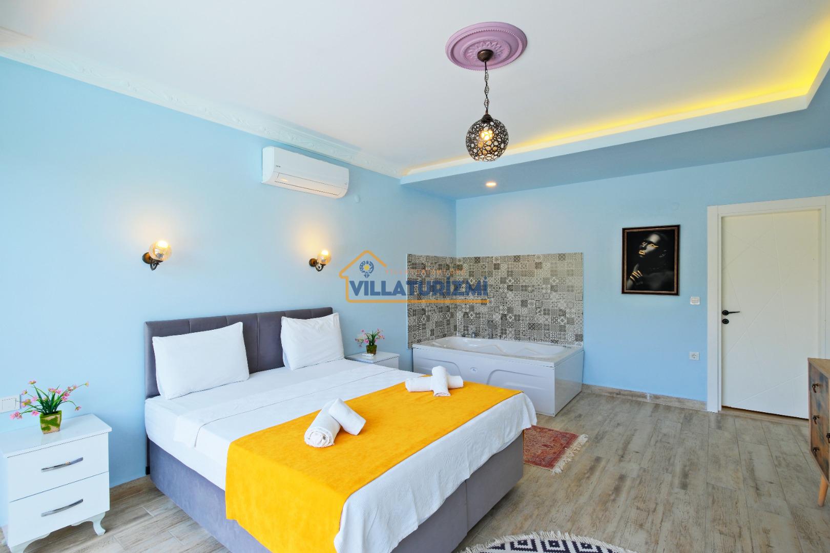 1. Yatak Odası: 1 çift kişilik yatak, klima, komodin, makyaj masası, elbise dolabı, jakuzi ve banyo tuvalet bulunmaktadır.