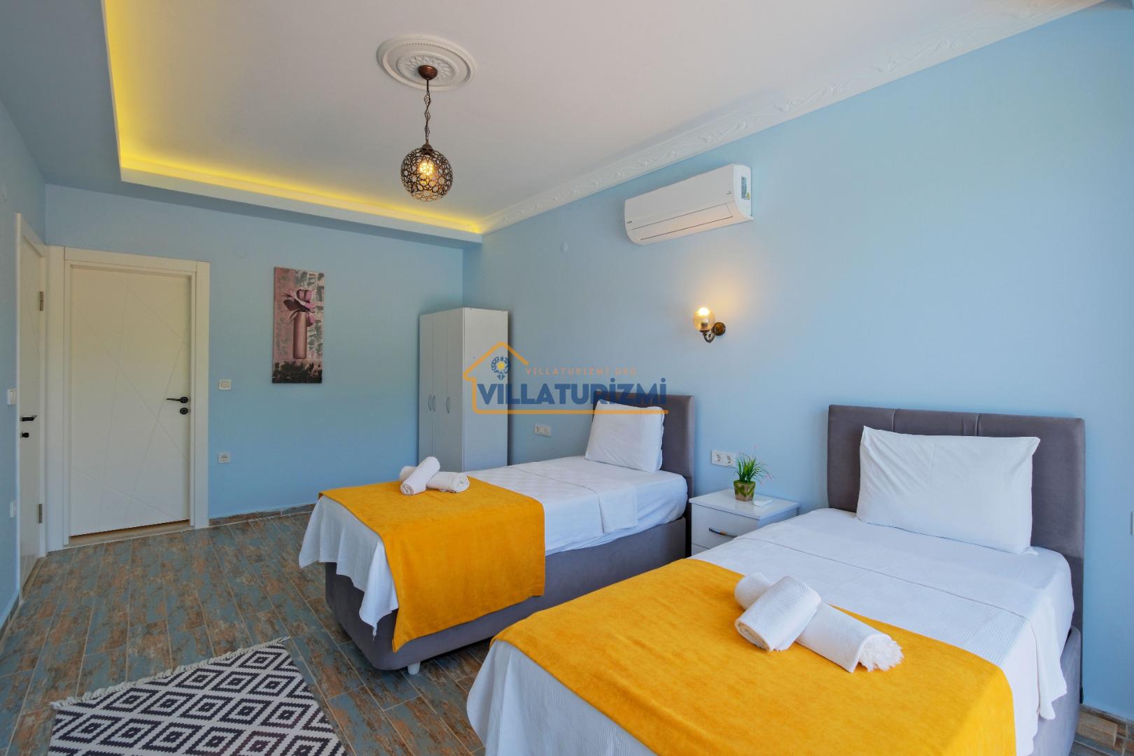 2. Yatak Odası: 2 tek kişilik yatak, klima, komodin, makyaj masası, elbise dolabı, banyo tuvalet bulunmaktadır.