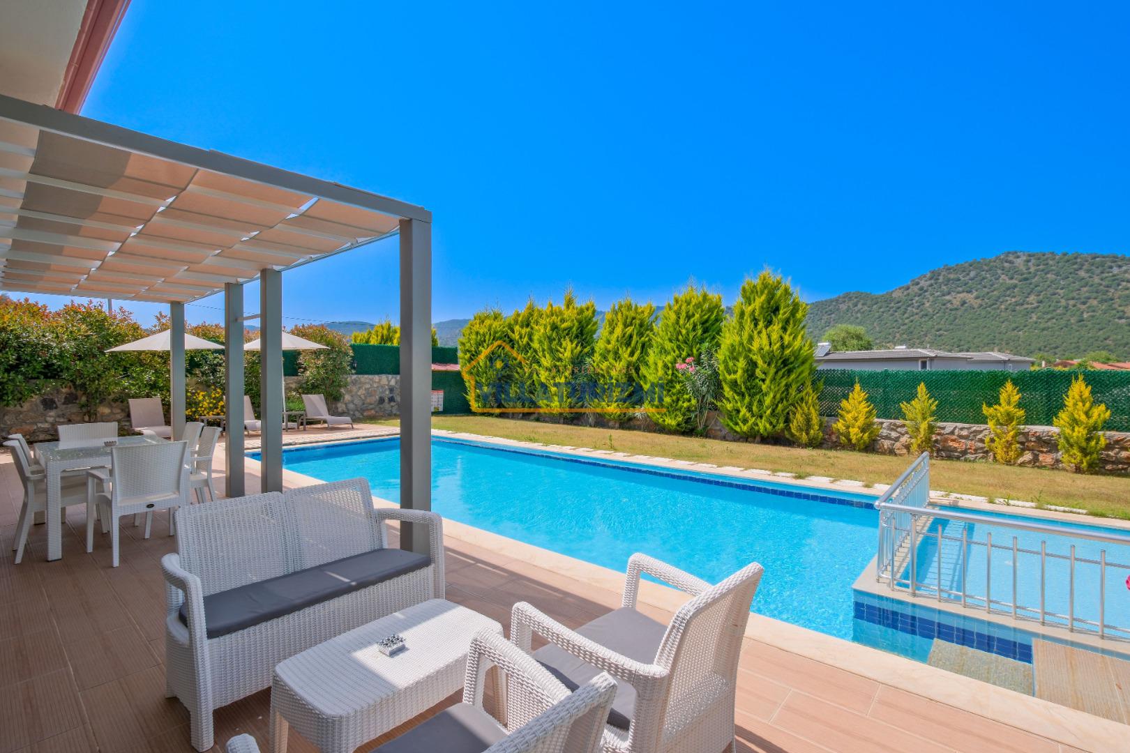 Özellikler: Özel açık yüzme havuzu, güneşlenme alanı, şezlonglar, özel bahçe, özel park yeri ve mangal alanı.
