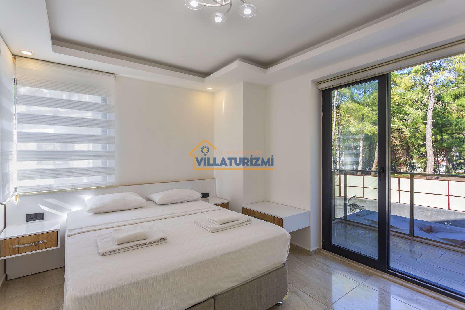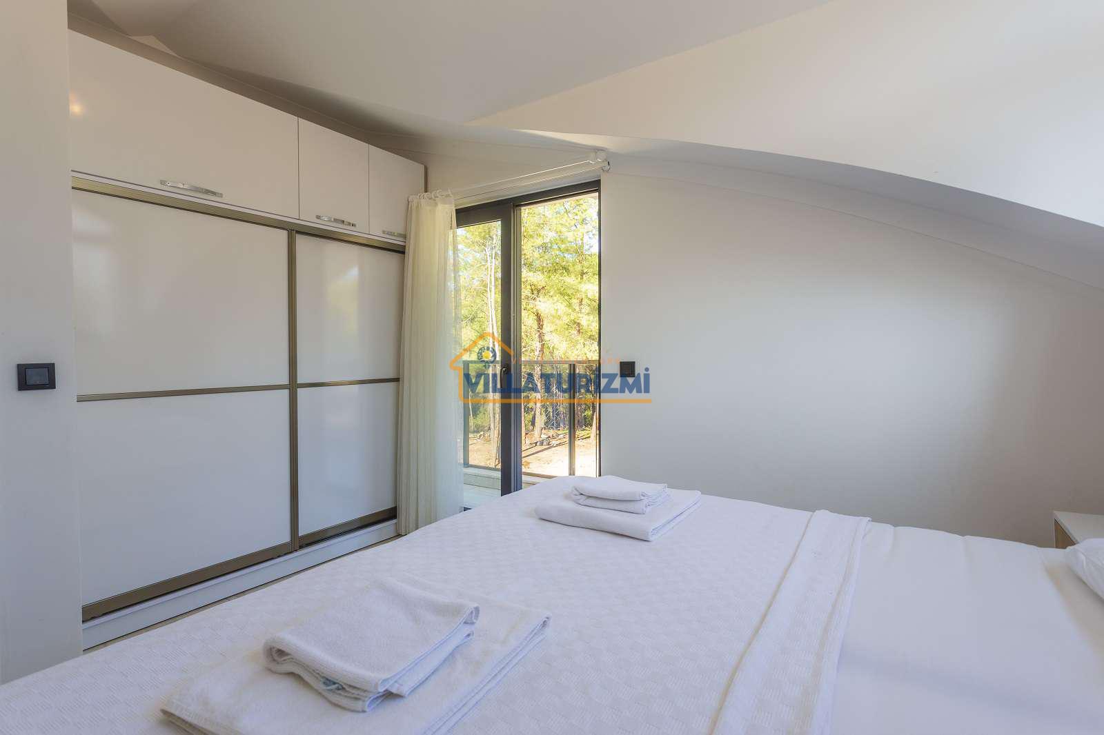 1. Yatak Odası:Master süit yatak odası 1 adet çift kişilik yatak, elbise dolabı, makyaj masası, balkon, klima, banyo ve tuvalet bulunmaktadır.