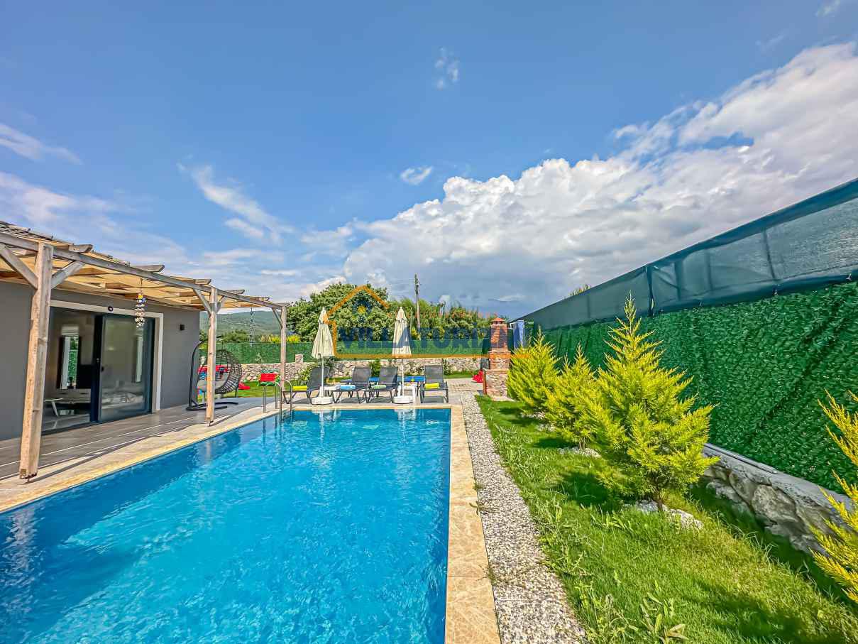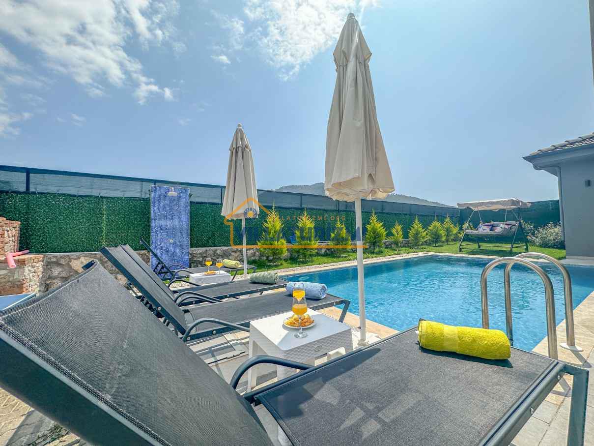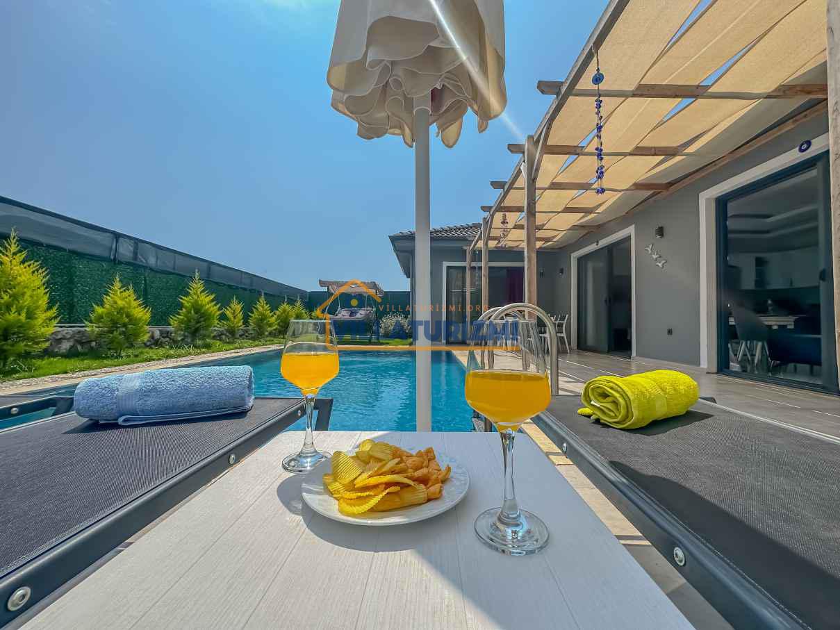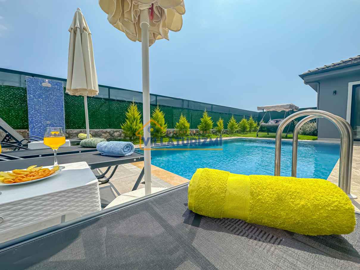 Özellikler: Özel açık yüzme havuzu, güneşlenme alanı, şezlonglar, özel bahçe, özel park yeri ve mangal alanı.