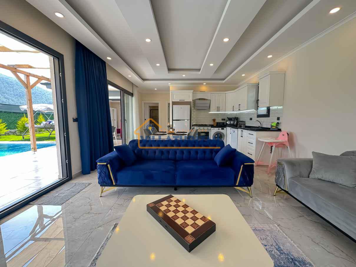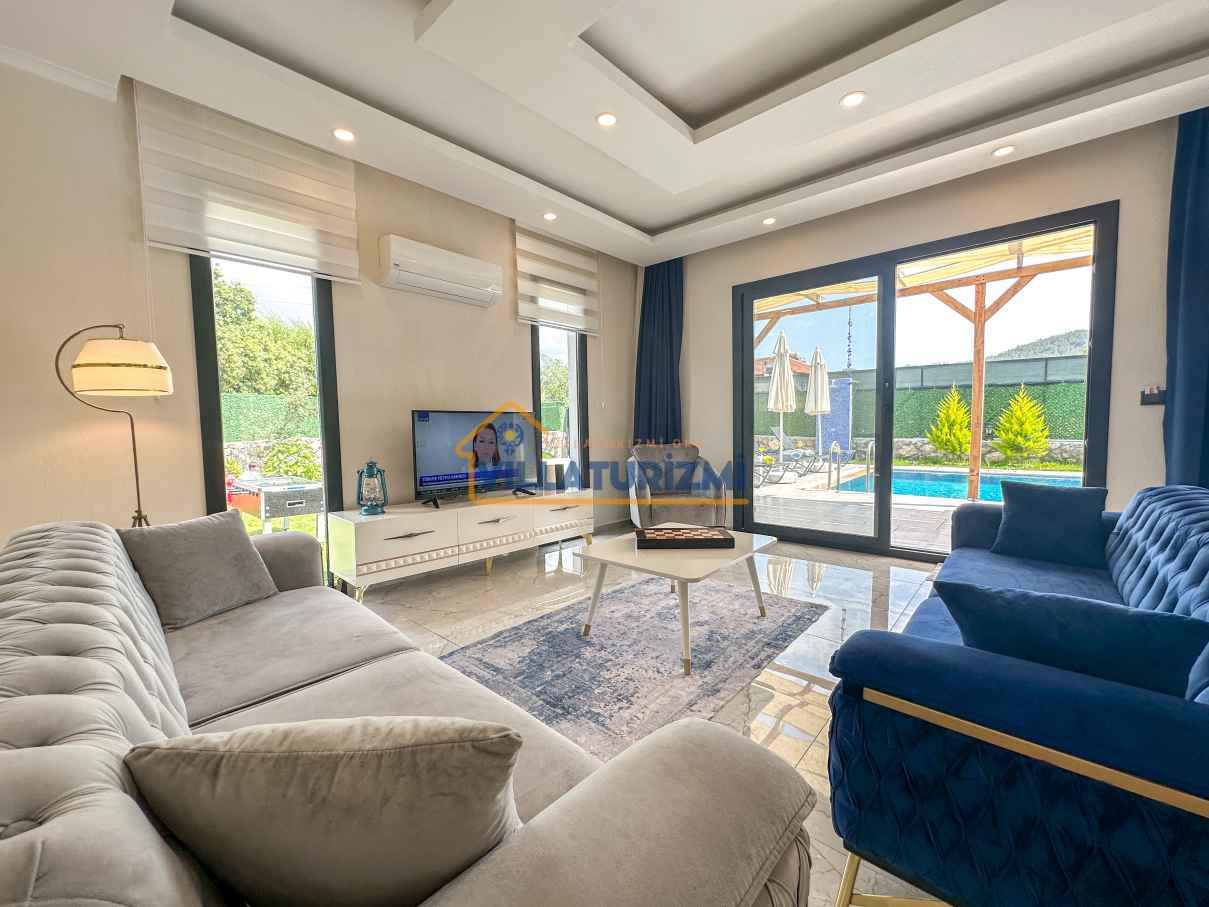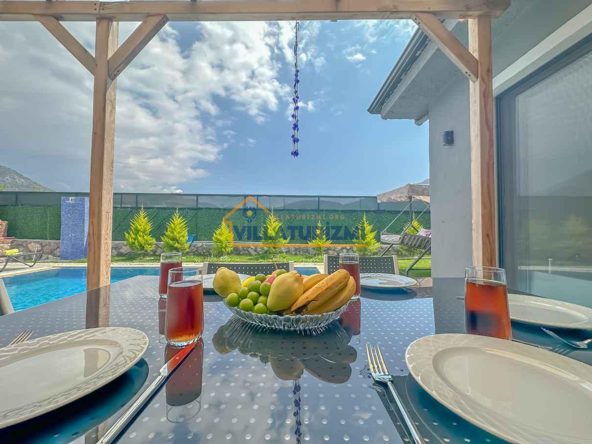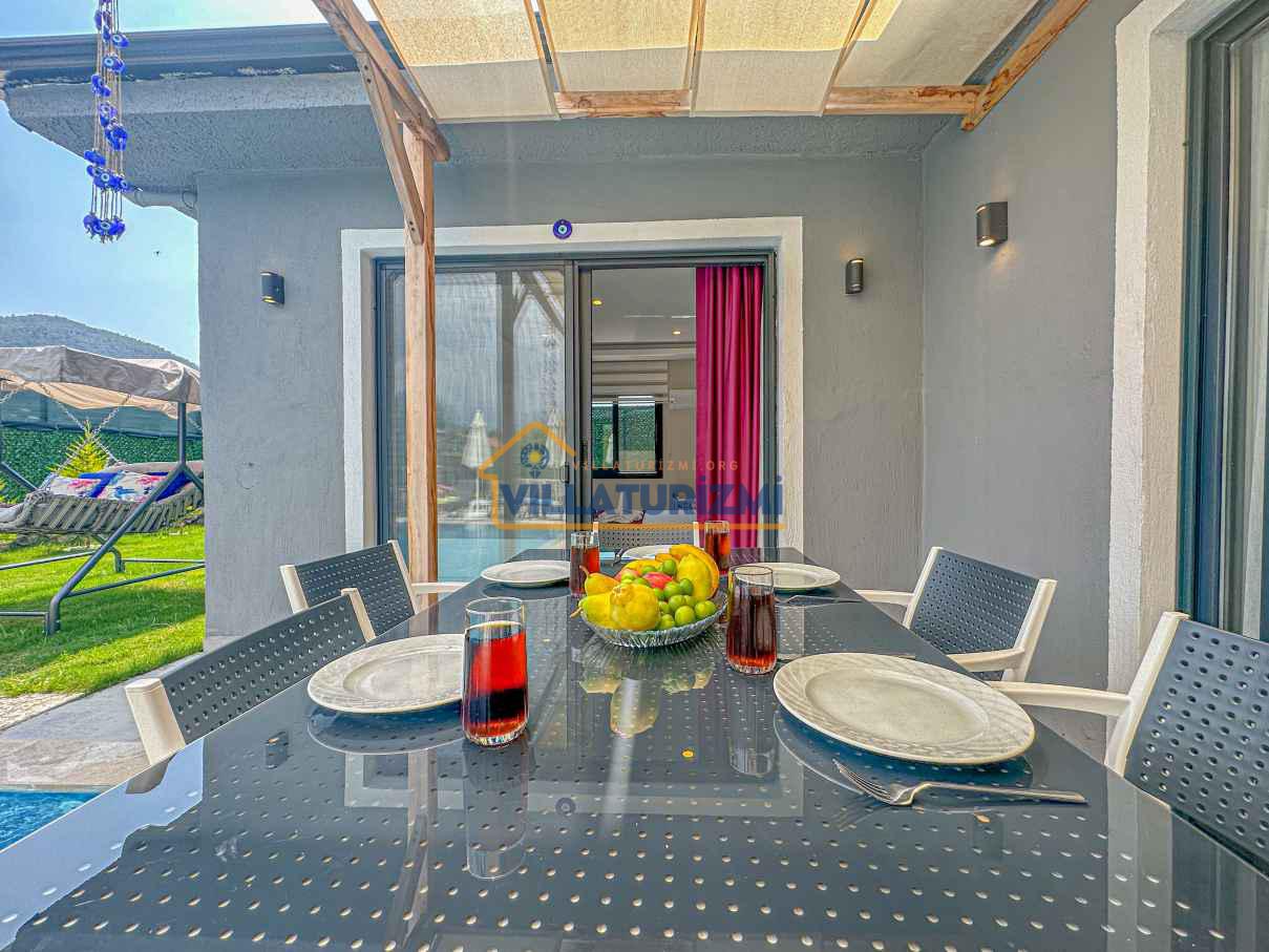 Villa İzgi'nin 2 adet yatak odası ve yüzme havuzuna açılan açık mutfaklı oturma/yemek odasından oluşur. Mutfak kısmında bulunan yemek masası 6 kişi kapasitelidir.