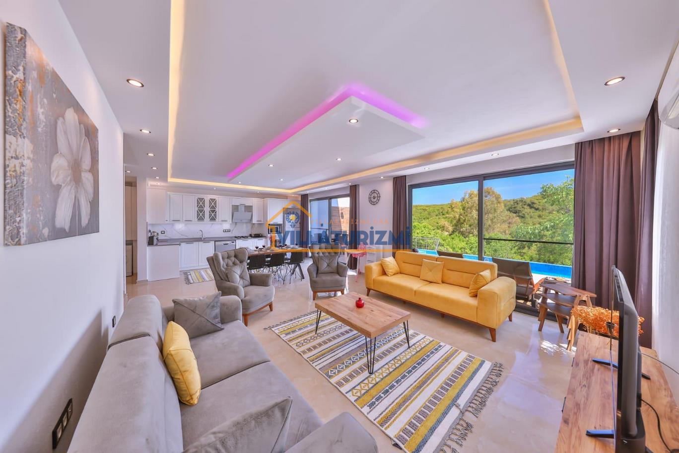 Salonumuzda rahat, lüks oturma gurubu, şömine, tv ve uydu alıcısı, ütü masası, limitsiz kablosuz internet, havuz kıyısına ve bahçeye çıkış vardır.