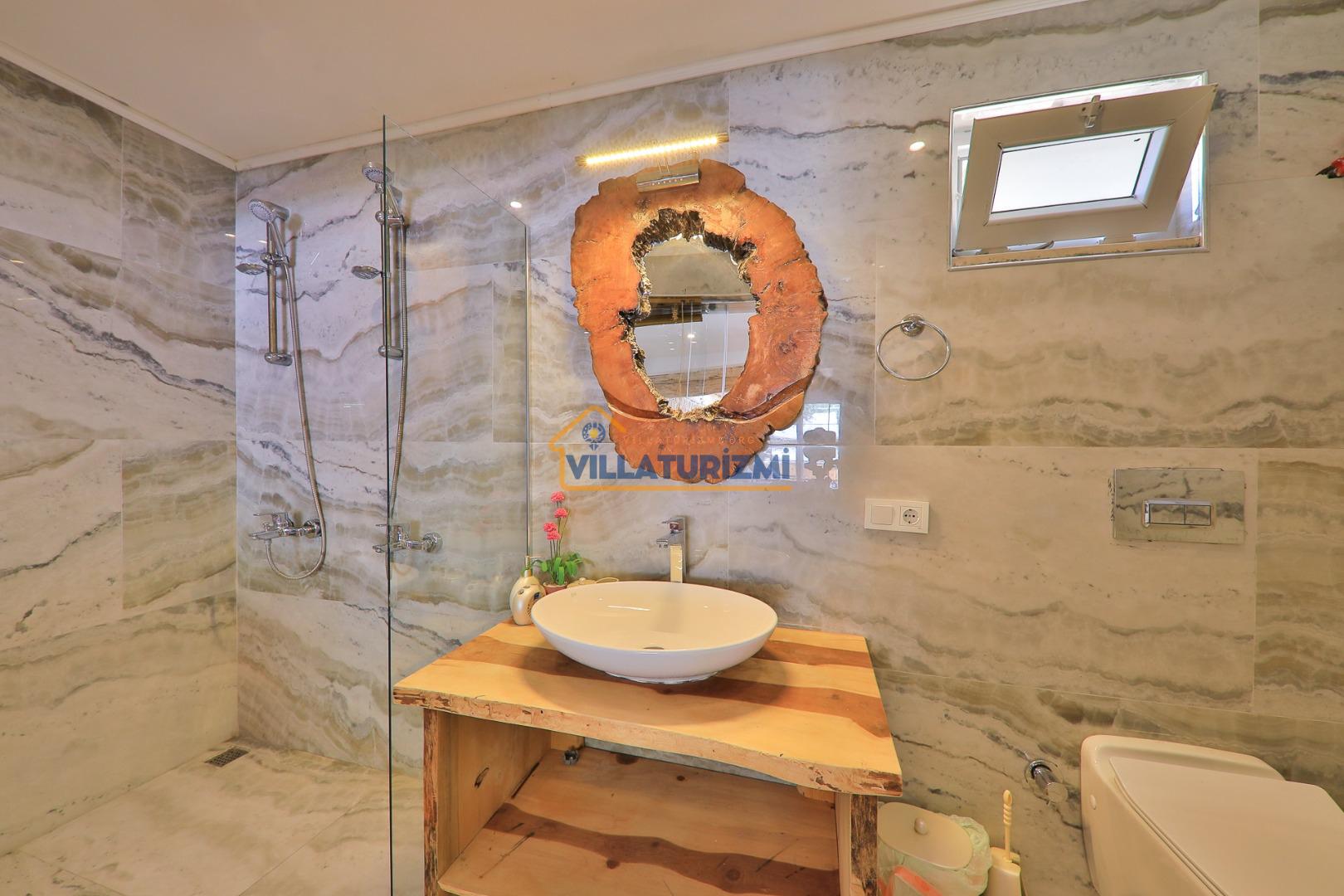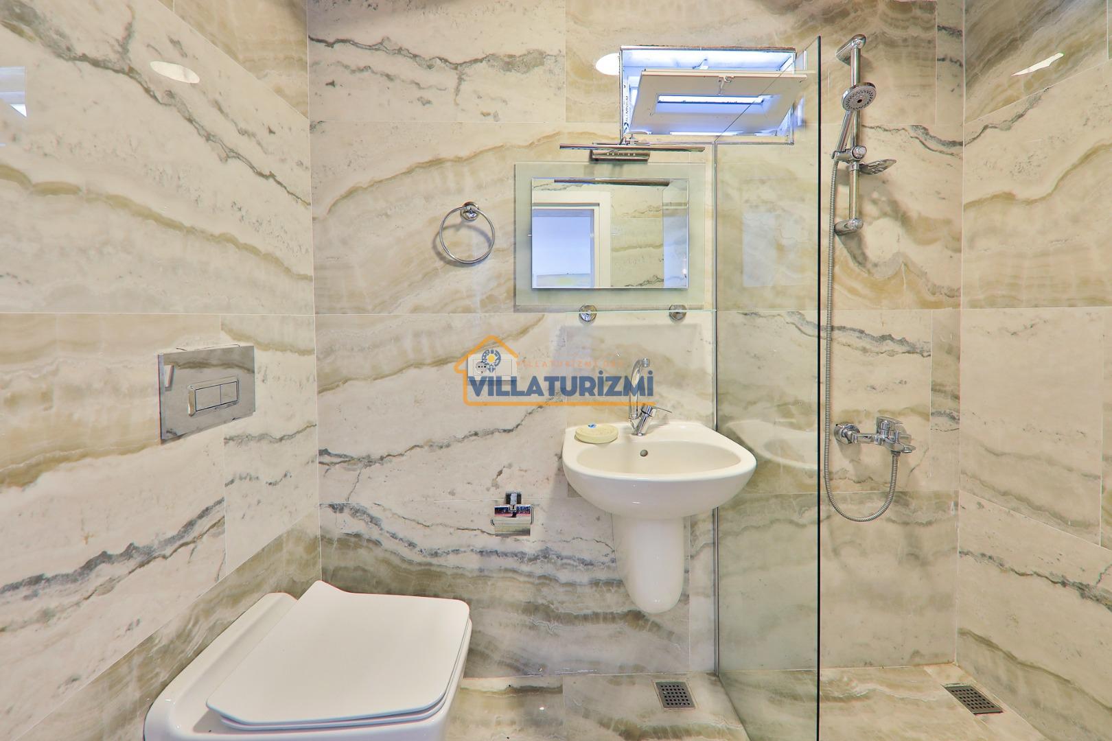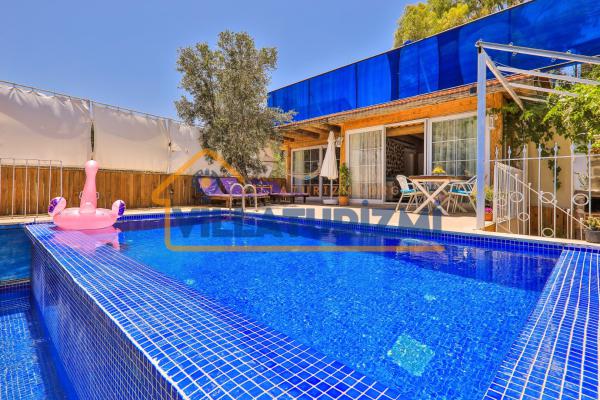 Salon : Şık dekore edilmiş salonda, oturma grubu, TV, uydu alıcı ve klima yer almaktadır. Ayrıca salondan havuz terasına çıkışta bulunmaktadır.