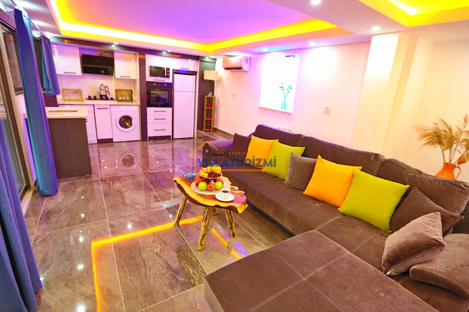 Salon:Salonumuzda rahat, kaliteli, lüks oturma grubu, klima, tv ve uydu alıcısı, sınırsız kablosuz internet, banyo ve tuvalet, sauna, havuz başına ve bahçeye çıkış vardır.