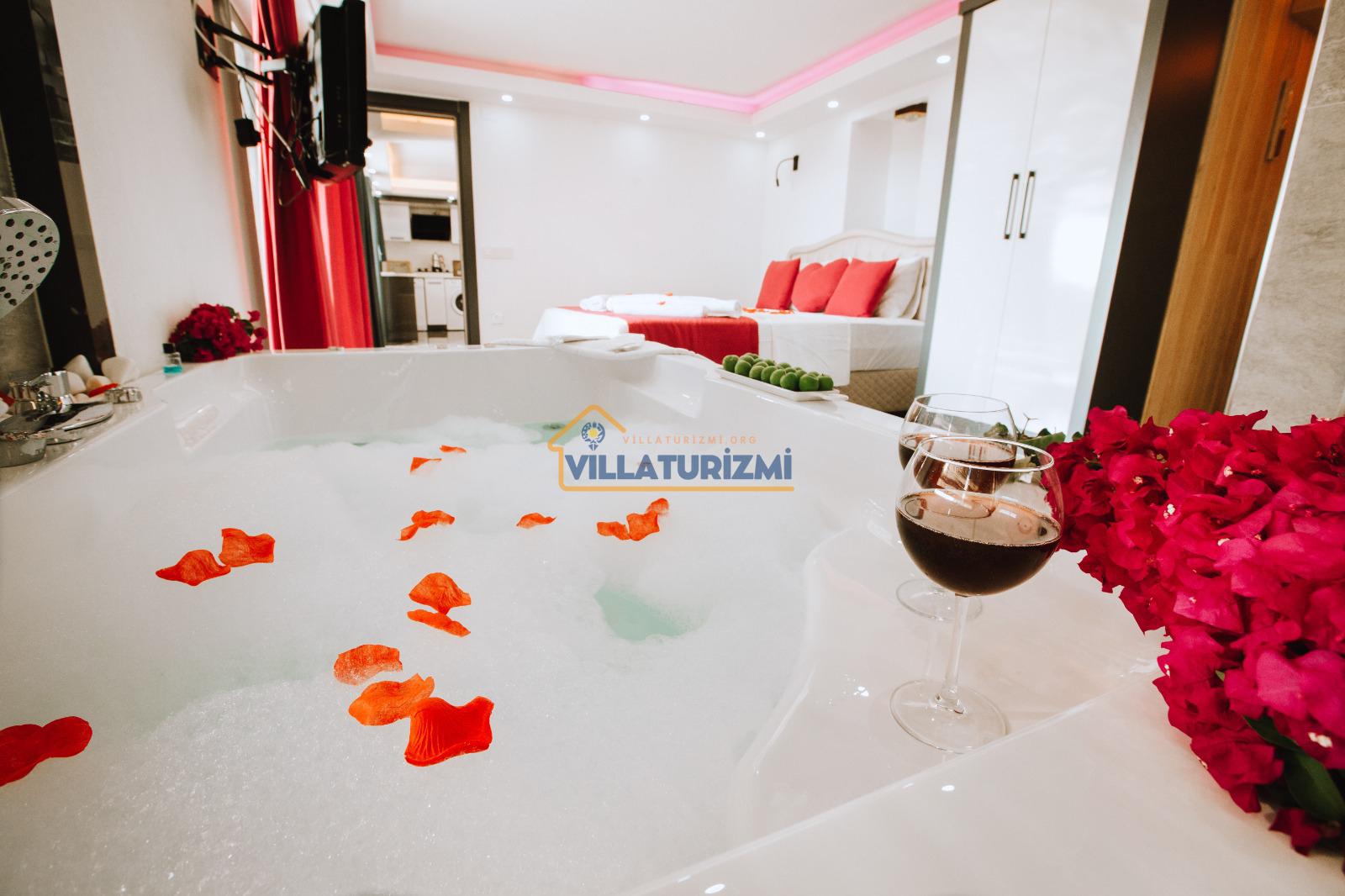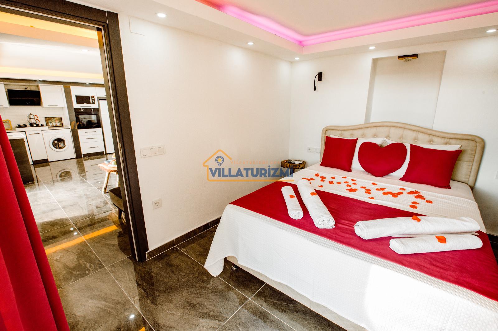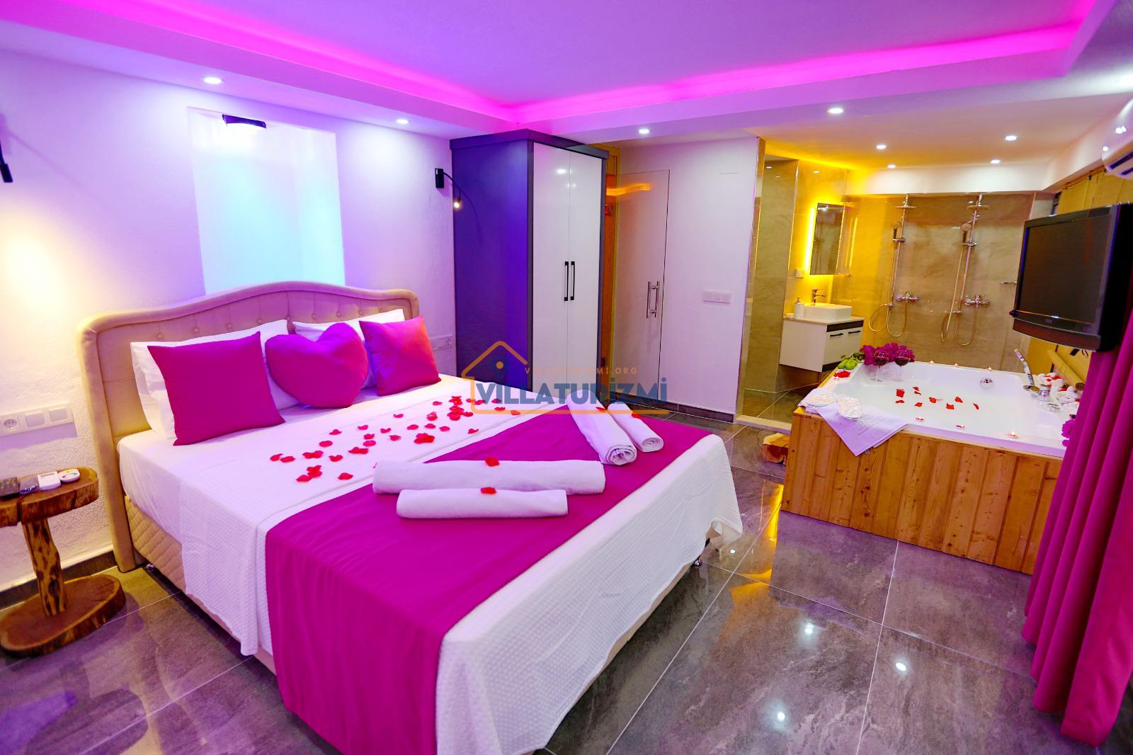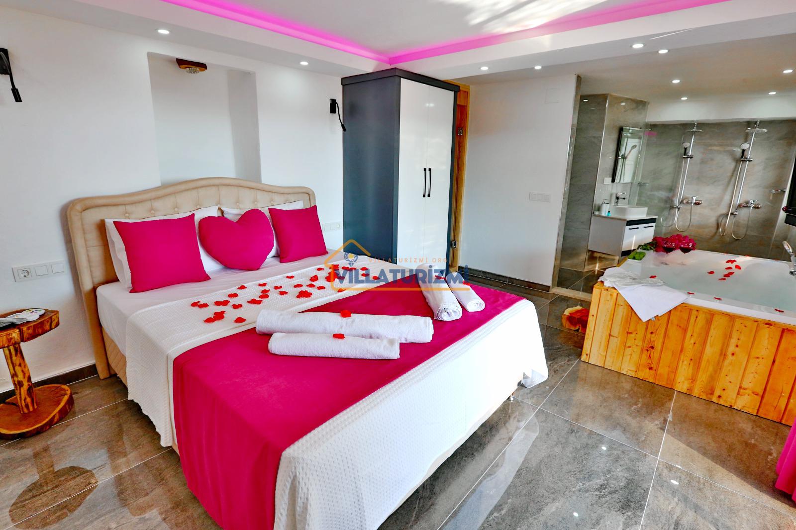 Yatak odası: 1 adet çift kişilik yatak, elbise dolabı, saç kurutma makinası ve klima mevcuttur. Ayrıca bu odamızda özel jakuzide bulunmaktadır.