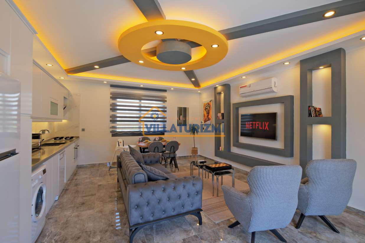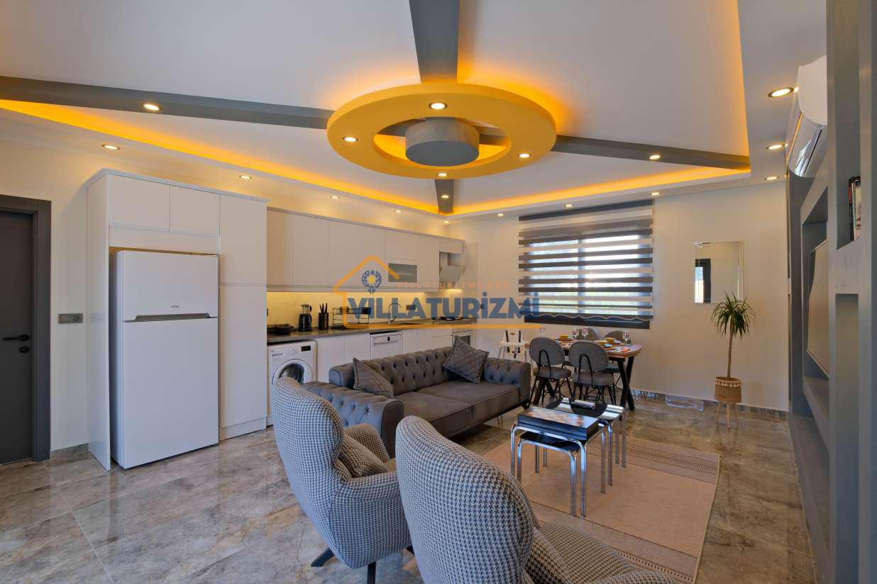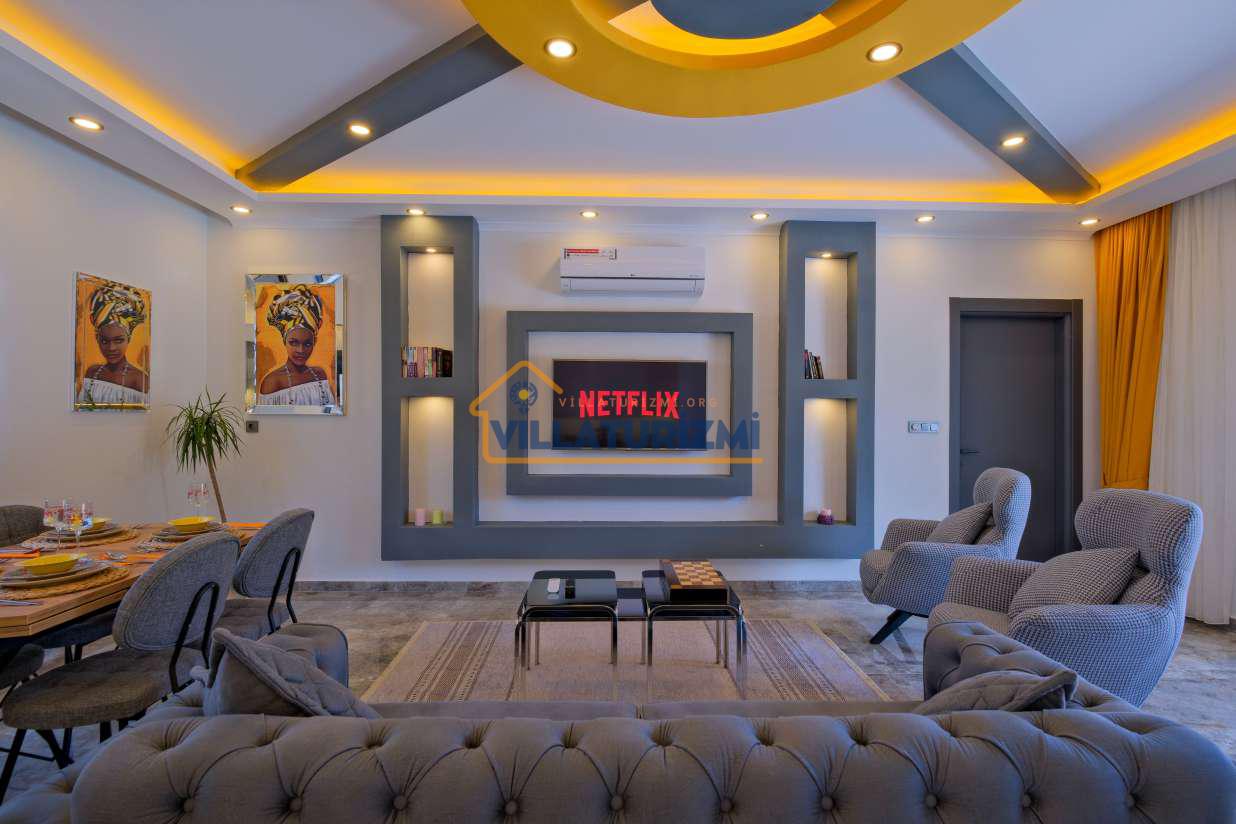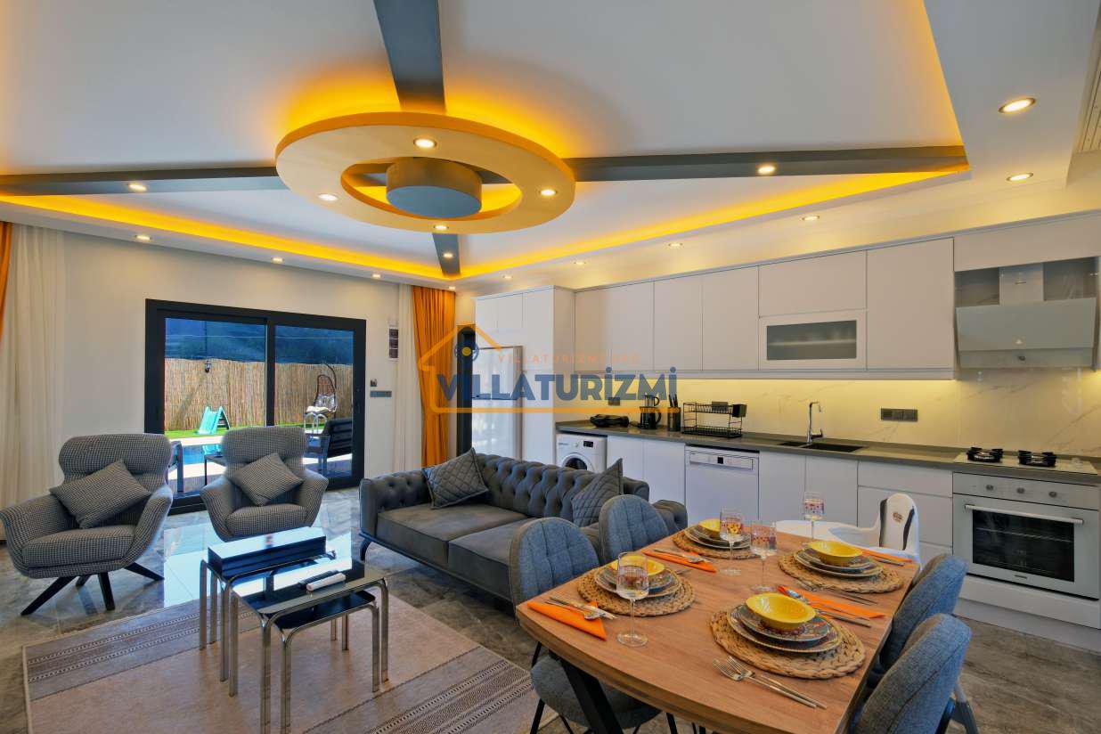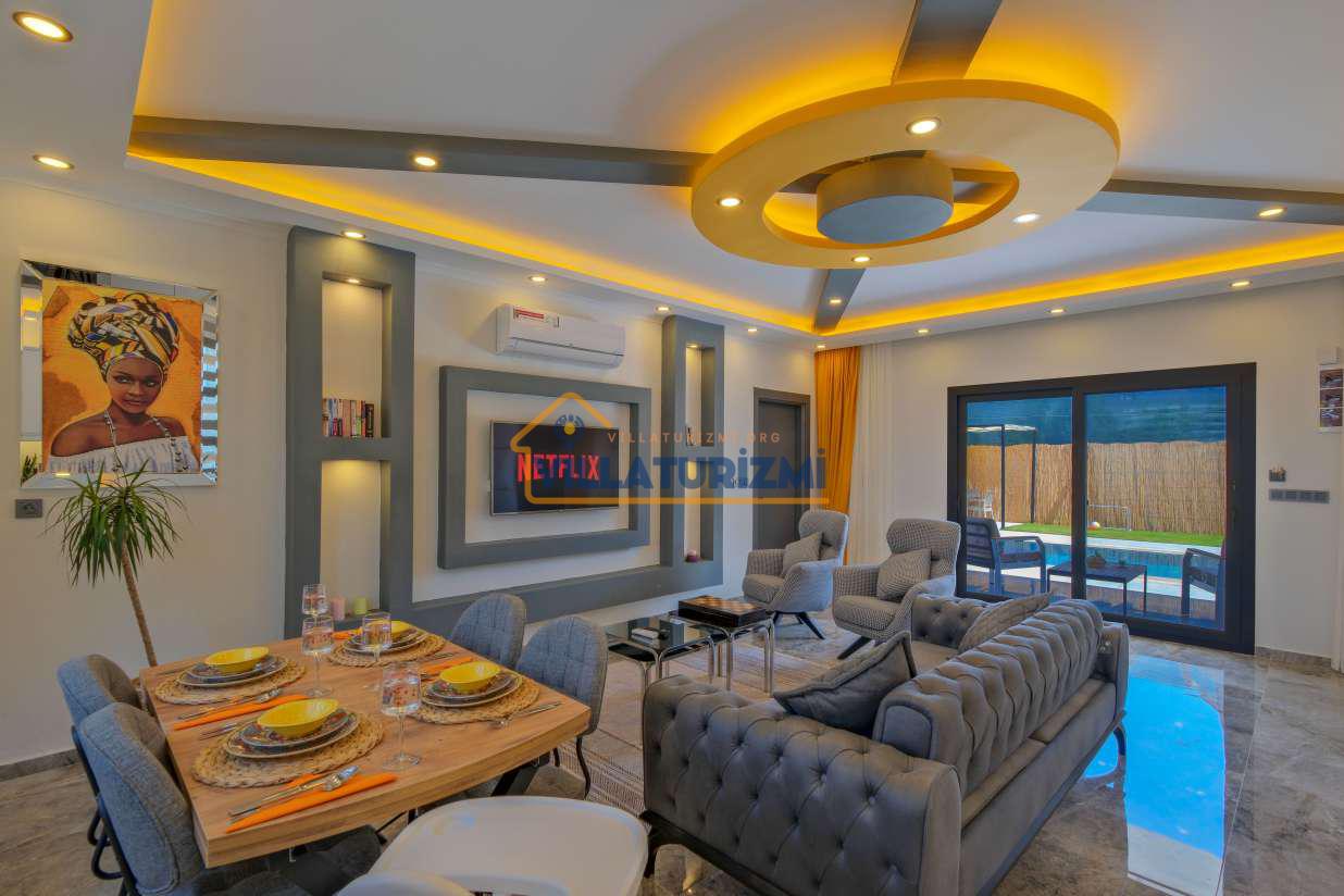 Salon:Villamızın salonunda; oturma grubu, TV, uydu alıcısı, klima, sehpa ve kablosuz modem yer almaktadır.