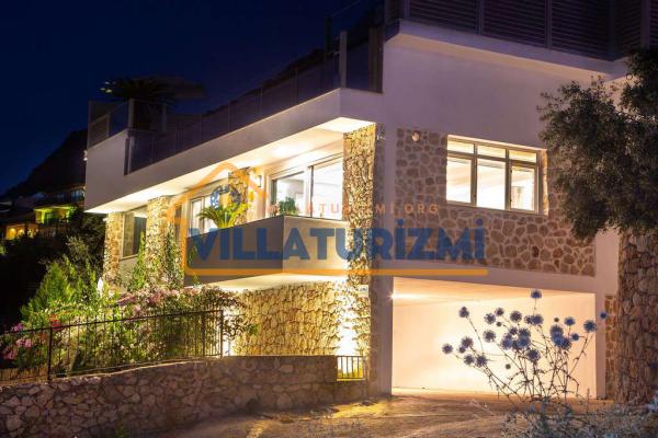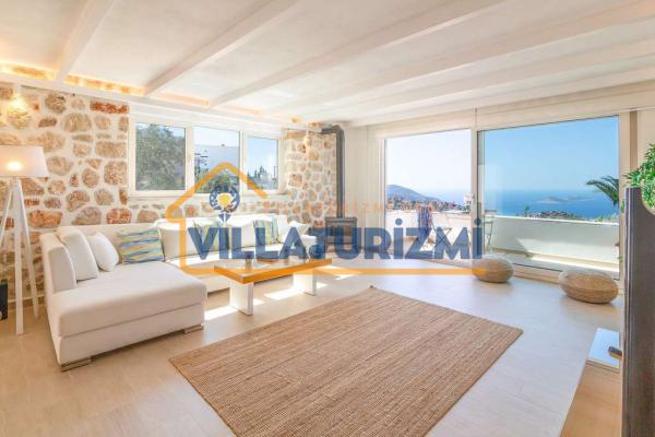 Salon ve Mutfak:Lambri ahşap tavanlı geniş ve modern bir salon, mutfak ve yemek alanı toplam 50 m2’dir. Salonda bolca oturma alanı ve İngilizce/Almanca/Rusça/Türkçe kanallar gösteren 49” Smart TV, DVD oynatıcı ve müzik sistemi mevcuttur. Salonda odun şöminesi bulunur. Tam donanımlı çimstone tezgahlı mutfakta elektrikli fırın, mikrodalga fırını, ocak, buzdolabı ve bulaşık makinası bulunur. Yemek masası dört kişiliktir. Salonun önündeki balkonda dört kişilik yemek masası bulunur ve Kalkan manzaralıdır.