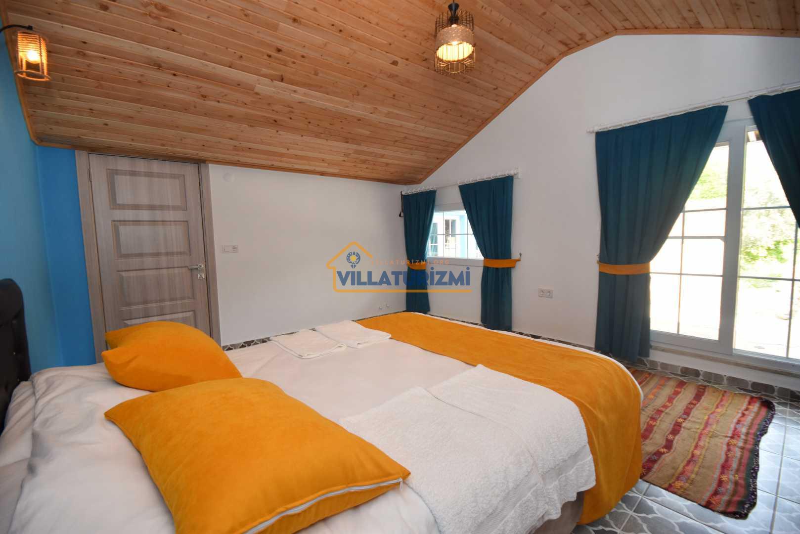 Villa Teo 3, günlük kiralık tatil villamız,1 adet yatak odasına ve 1 banyoya sahip olup 2 kişi konaklama kapasitesine sahiptir. Yatak odasında 1 çift kişilik bulunmaktadır. Açık plan oturma/yemek odası ve mutfak bölümünden, yüzme havuzu ve mangal/veranda alanına geçilir.