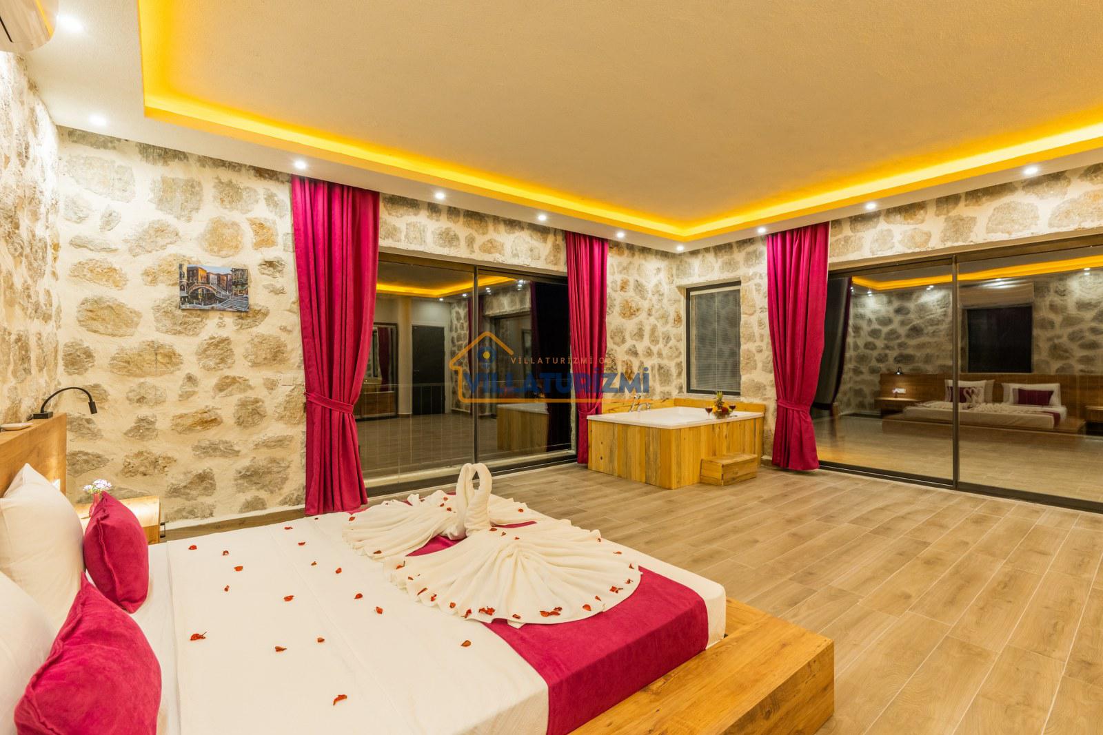 1. Yatak Odası: 1 çift kişilik yatak, klima, komodin, makyaj masası, elbise dolabı, jakuzi ve banyo tuvalet bulunmaktadır.