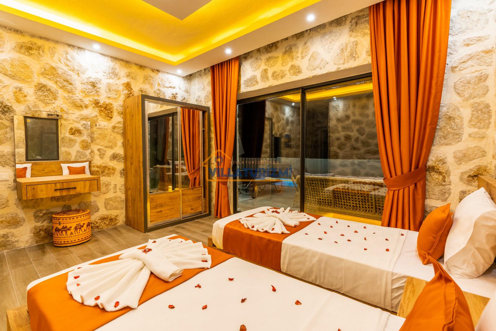 2. Yatak Odası: 2 tek kişilik yatak, klima, komodin, makyaj masası, elbise dolabı, banyo tuvalet bulunmaktadır.