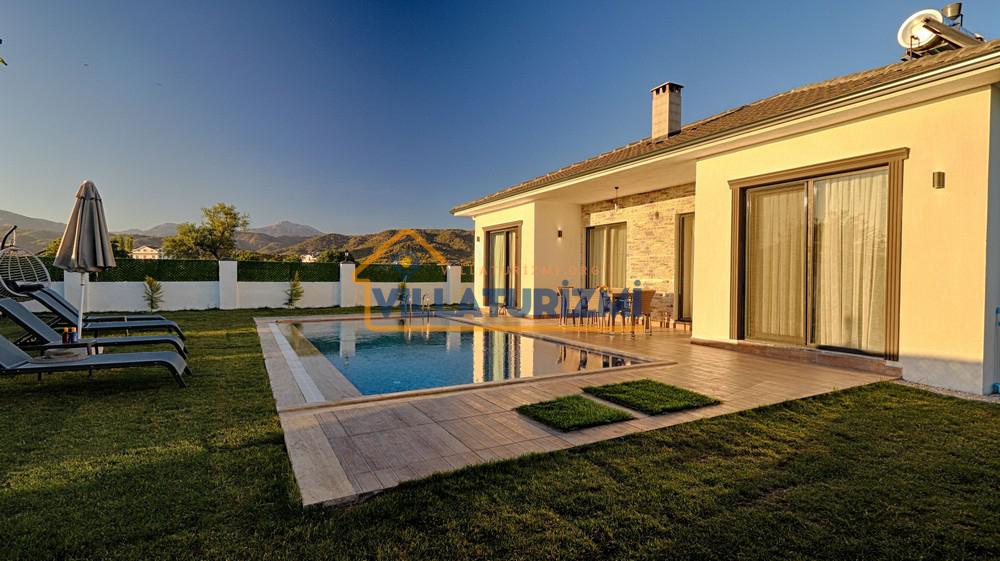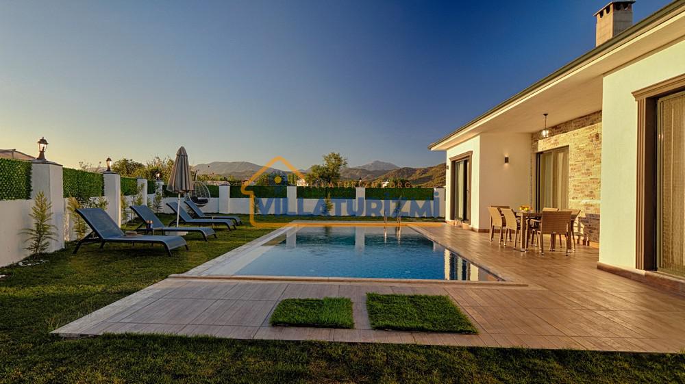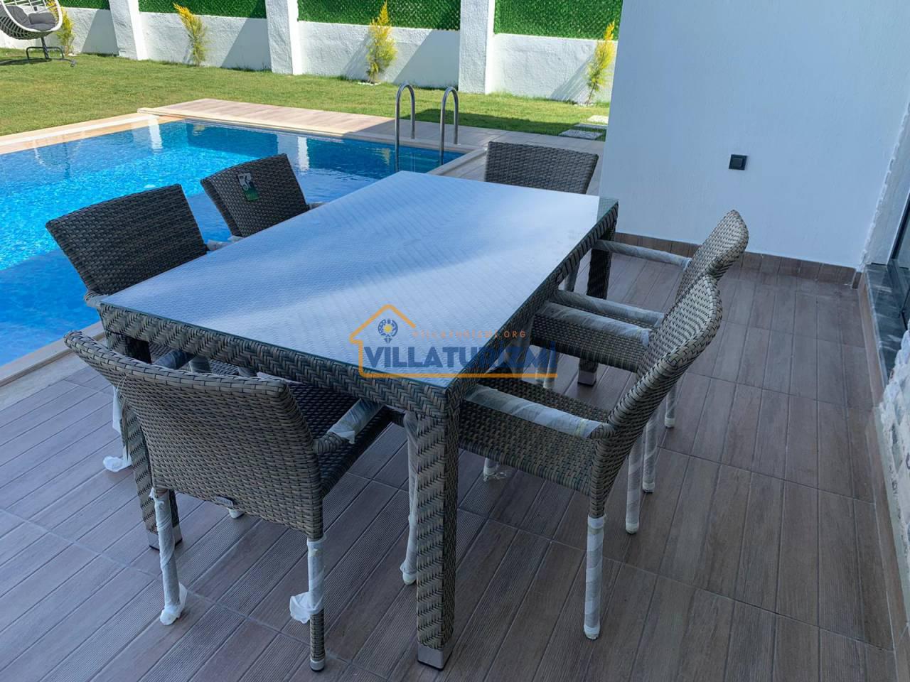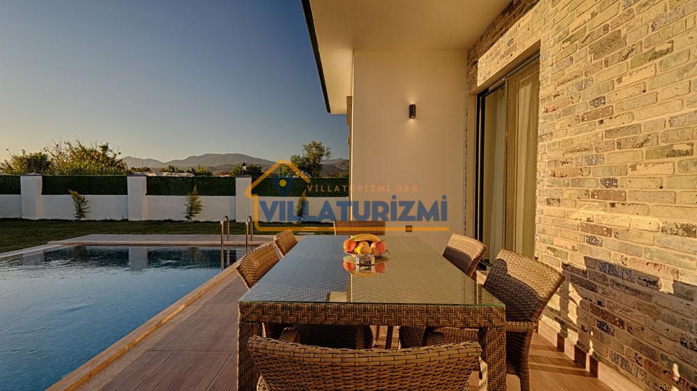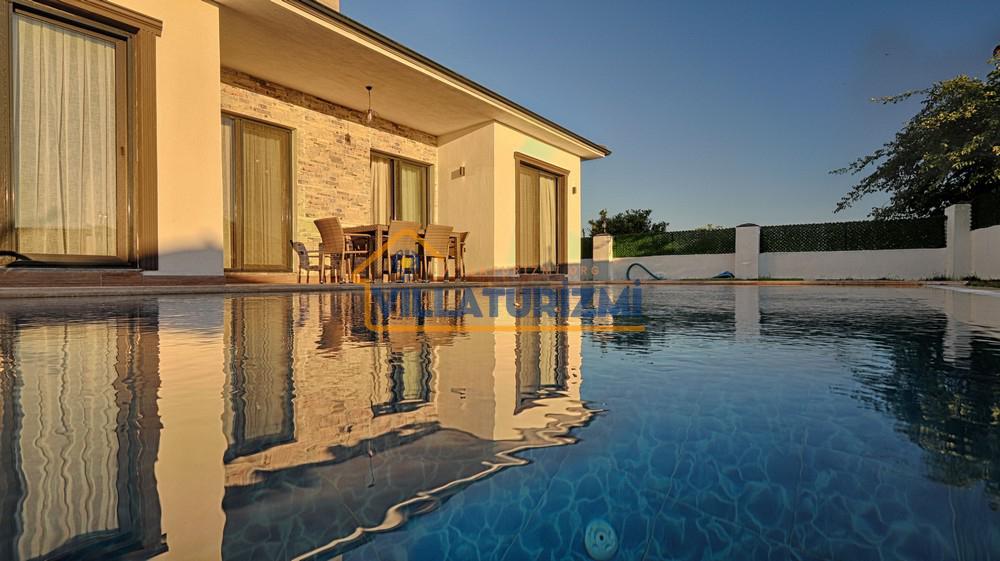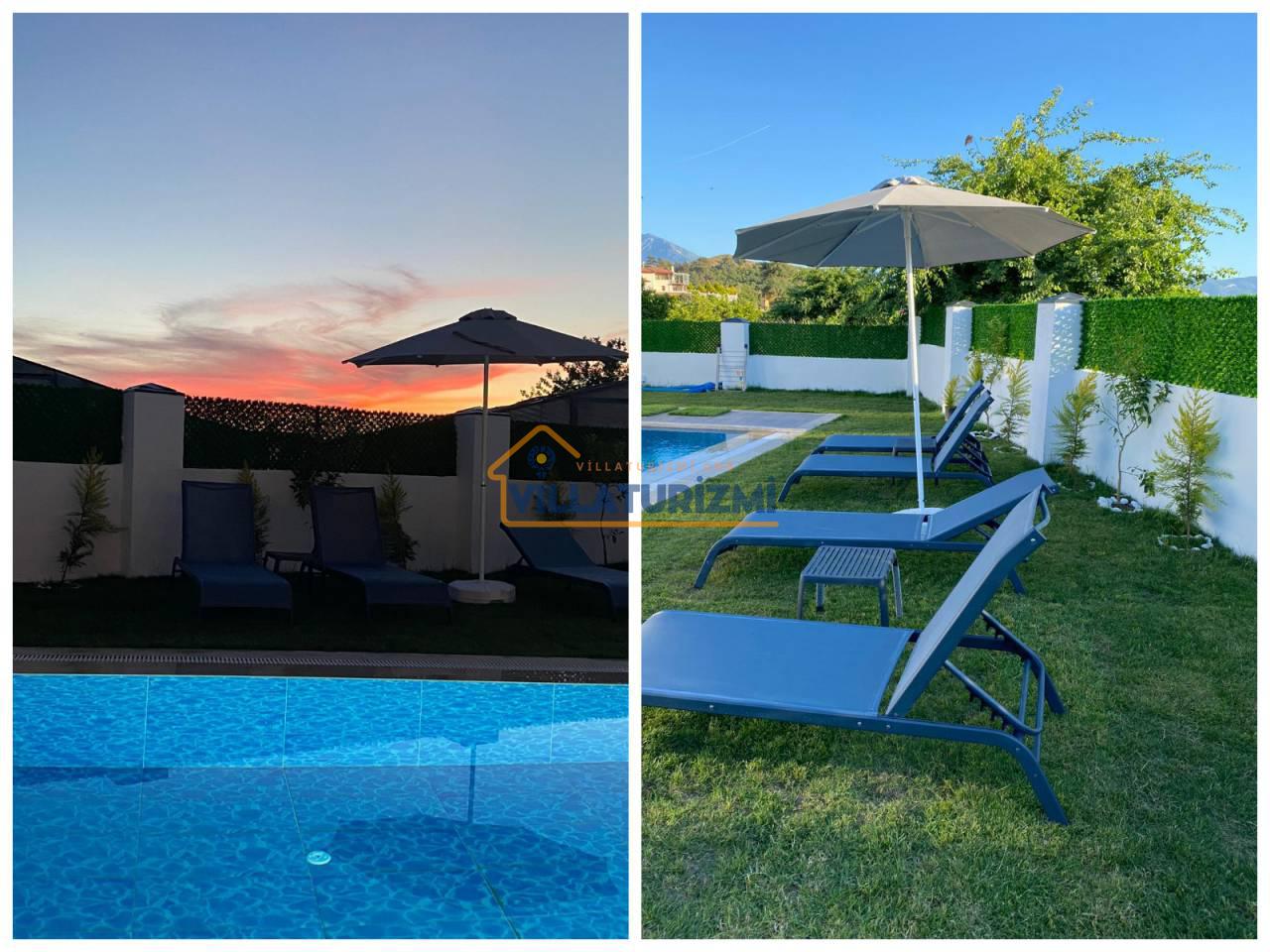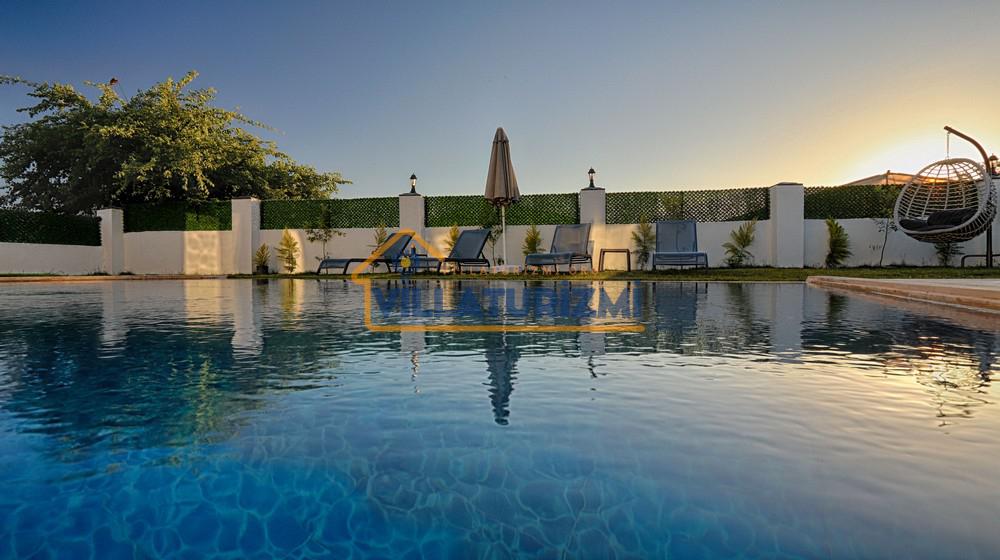 Havuz kenarında güneş şemsiyesi ve şezlonglar, yemek masası, salıncak, barbekü yer almaktadır.