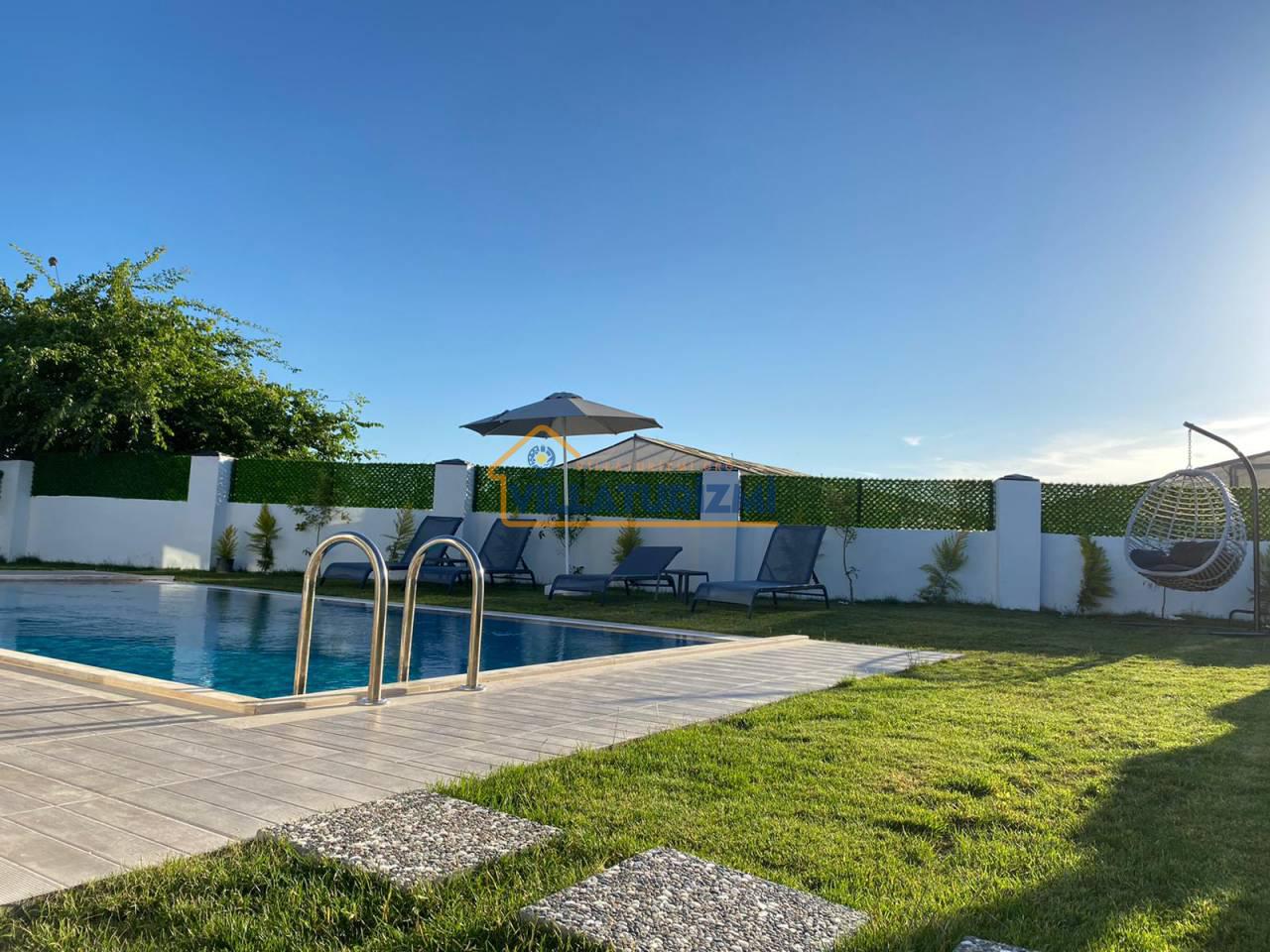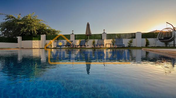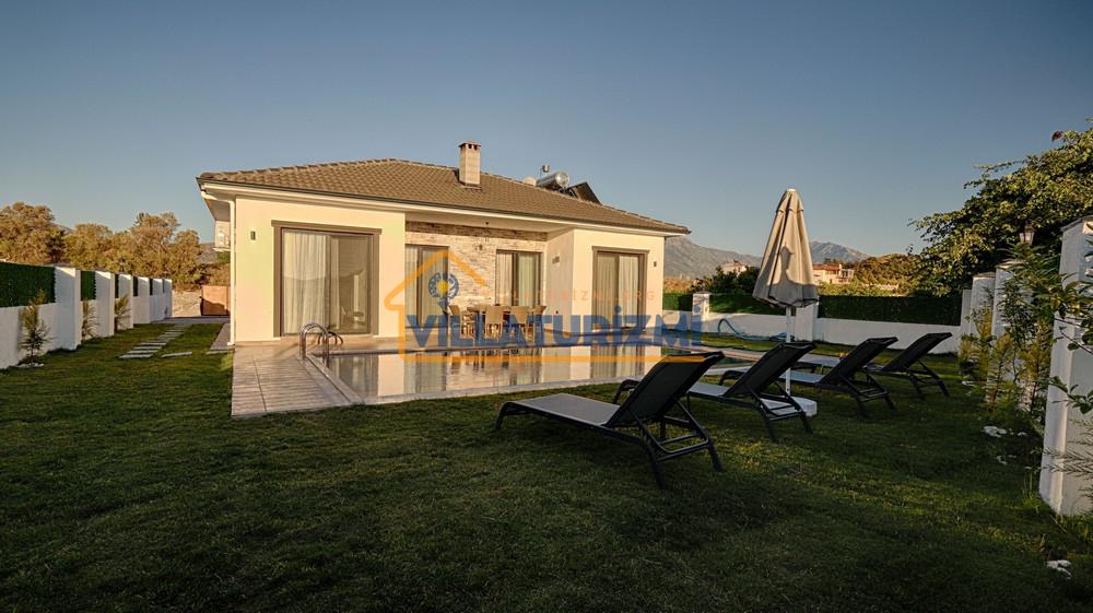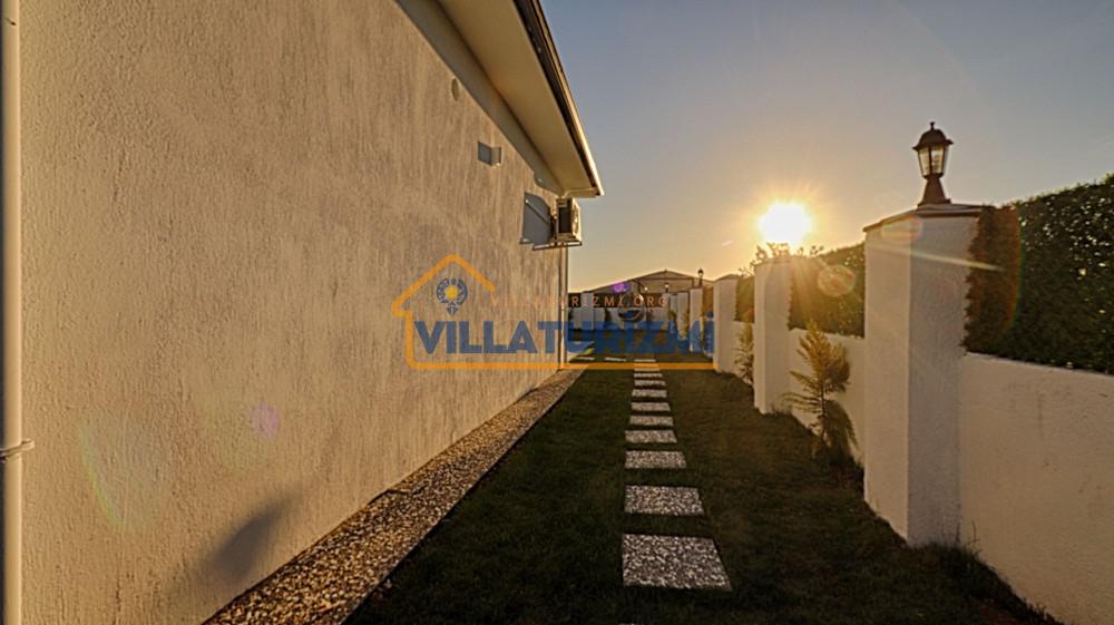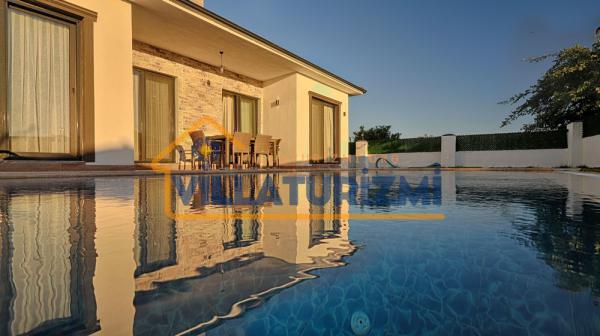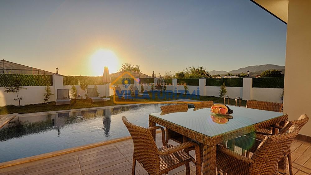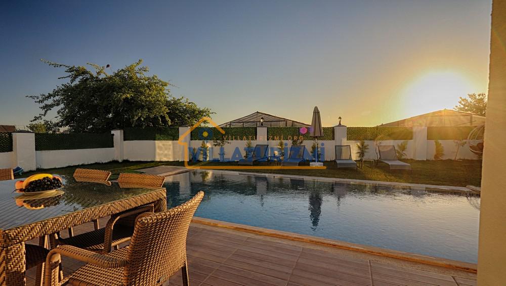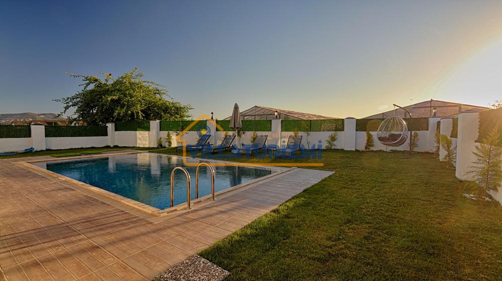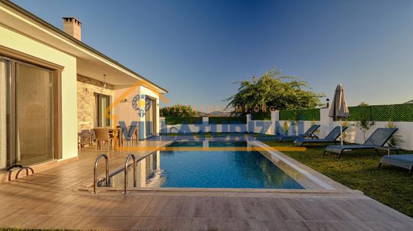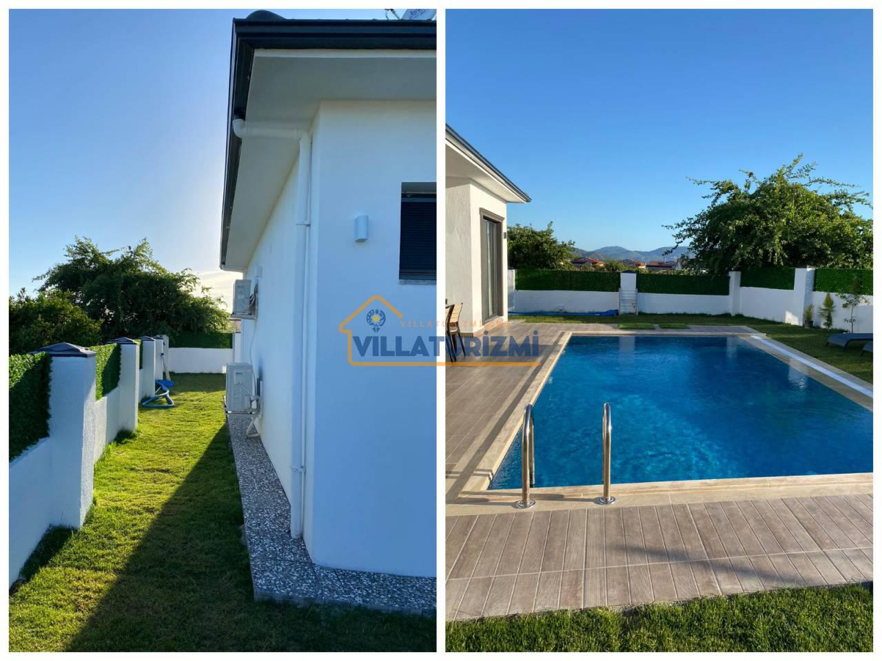 Havuz kenarında güneş şemsiyesi ve şezlonglar, yemek masası, salıncak, barbekü yer almaktadır.