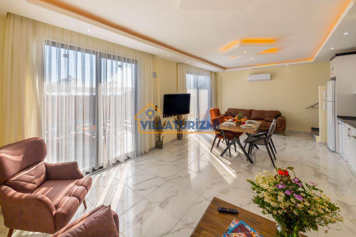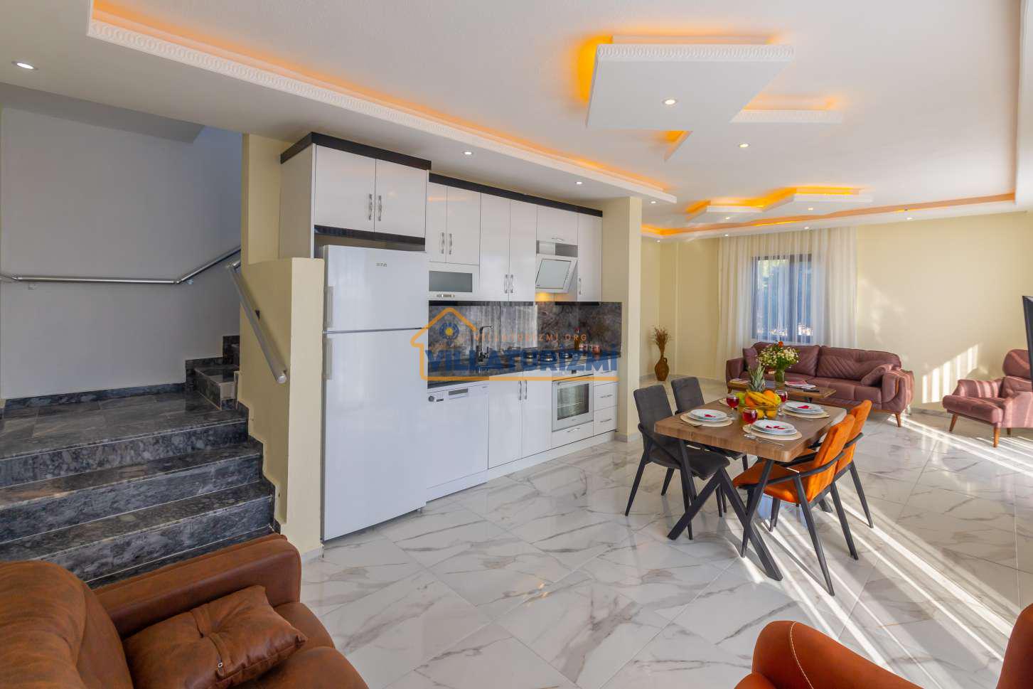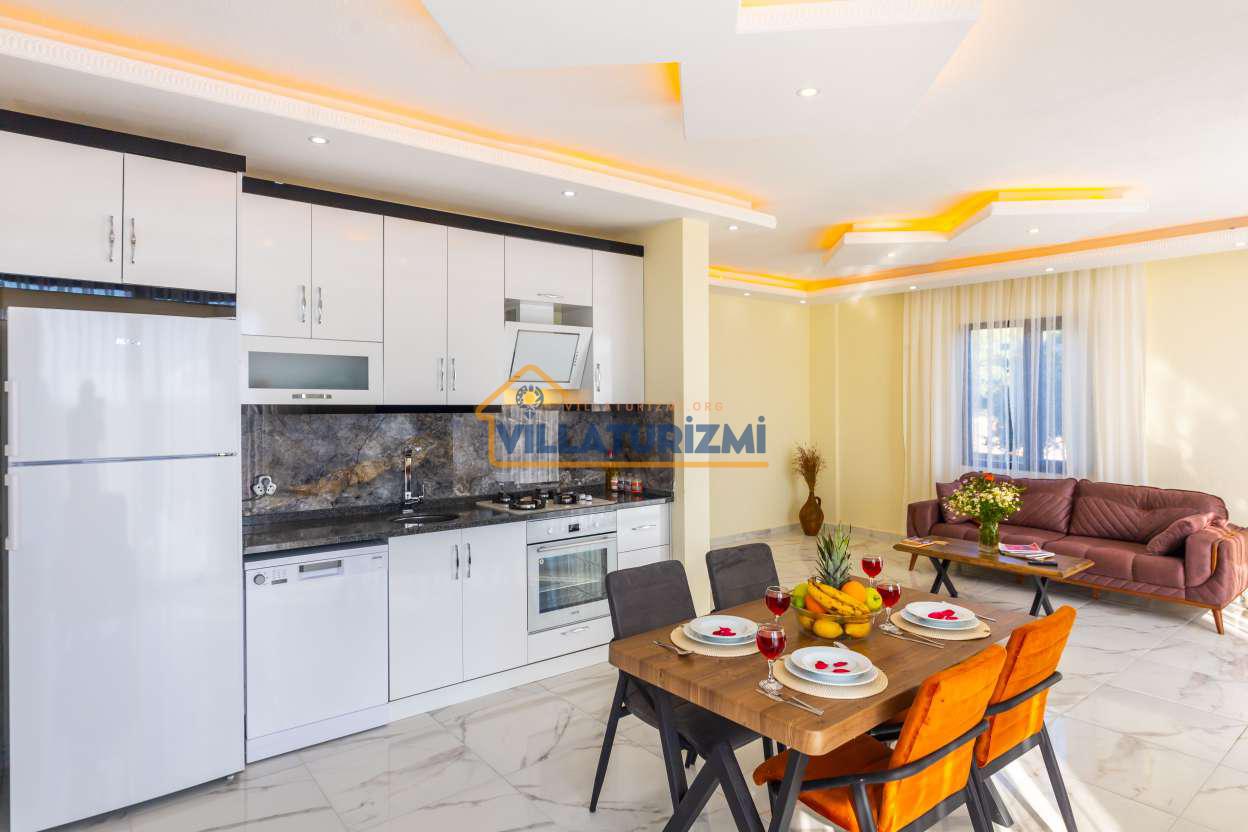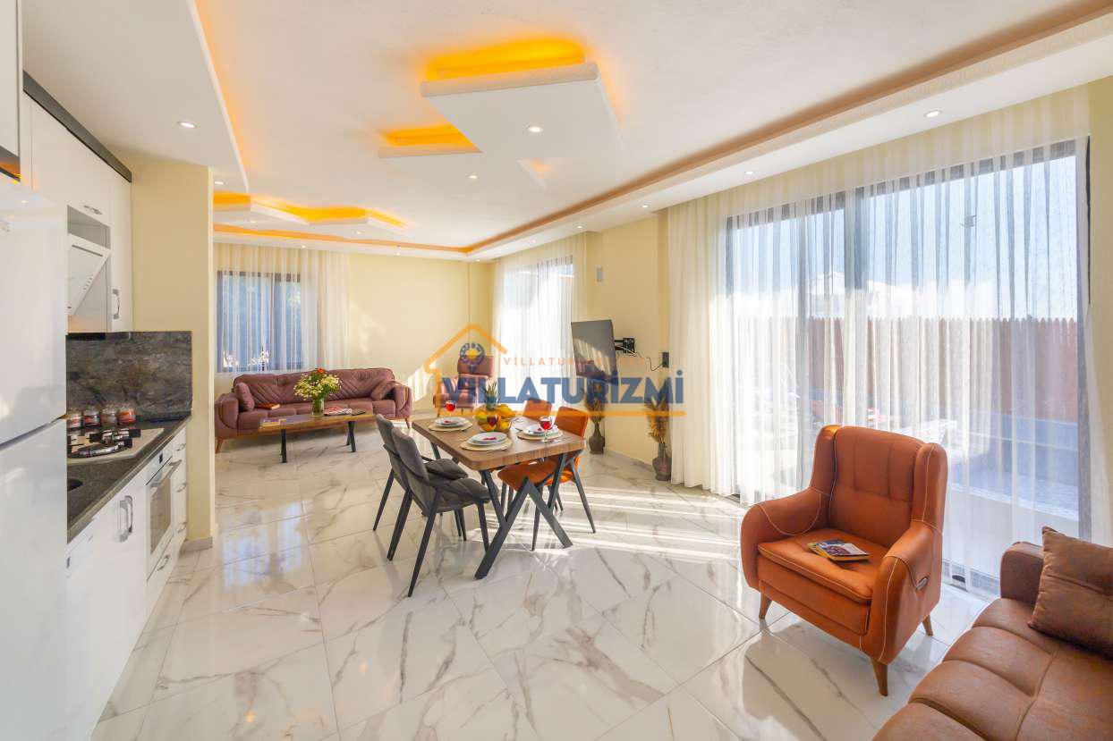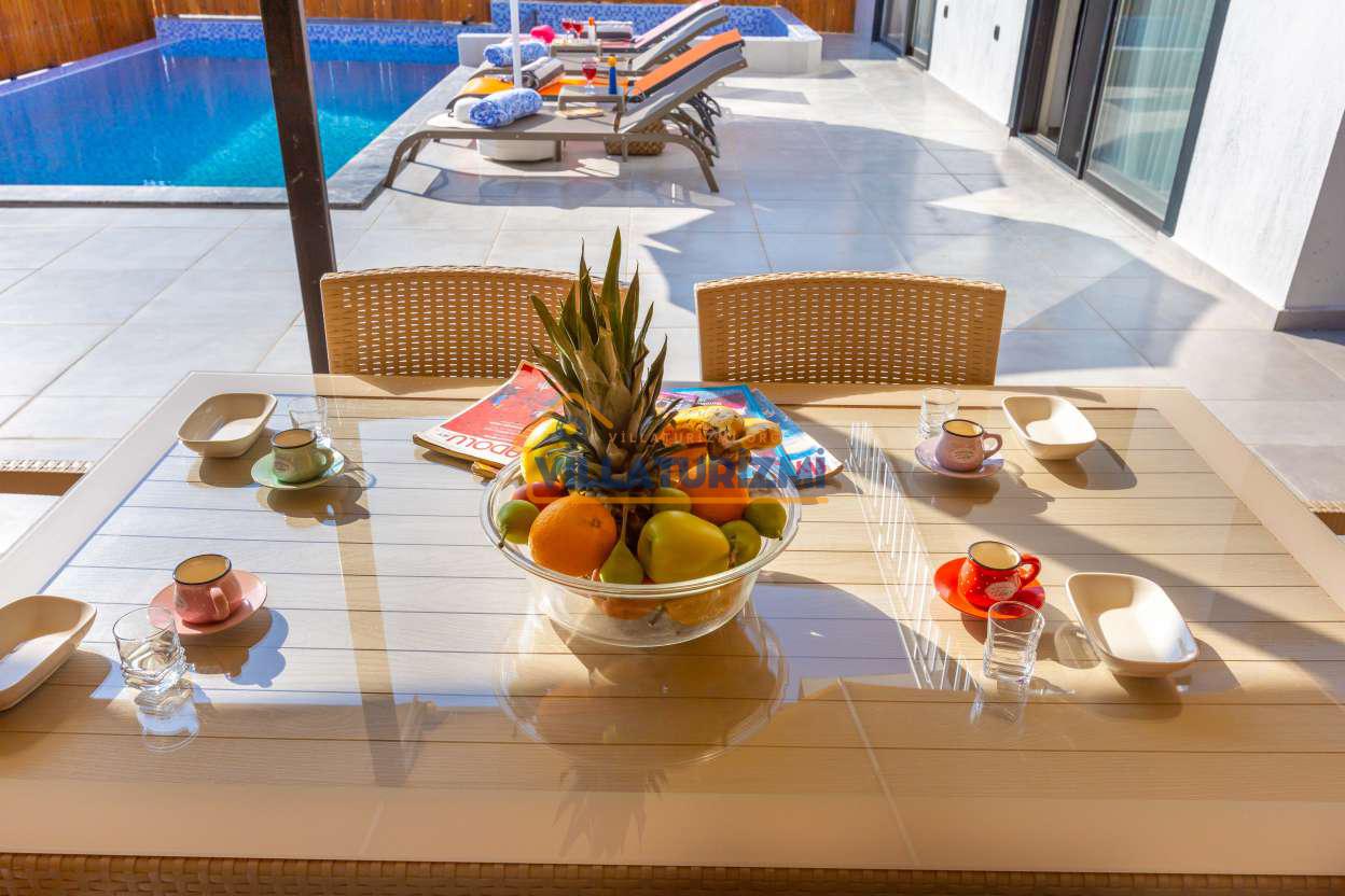 Villamız 2 yatak odası ve yüzme havuzuna açılan açık mutfaklı oturma/yemek odasından oluşur. Mutfak kısmında bulunan yemek masası 4 kişi kapasitelidir.