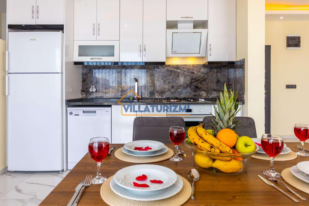 Mutfak : Modern Amerikan mutfakta buzdolabı, bulaşık makinesi, çamaşır makinesi, ankastre fırın, mikrodalga fırın, ankastre 4’lü ocak, elektrikli su ısıtıcısı, tost makinesi, ekmek kızartma makinesi, yemek takımı, tava, tencereler ve çatal bıçak takımı mevcuttur.