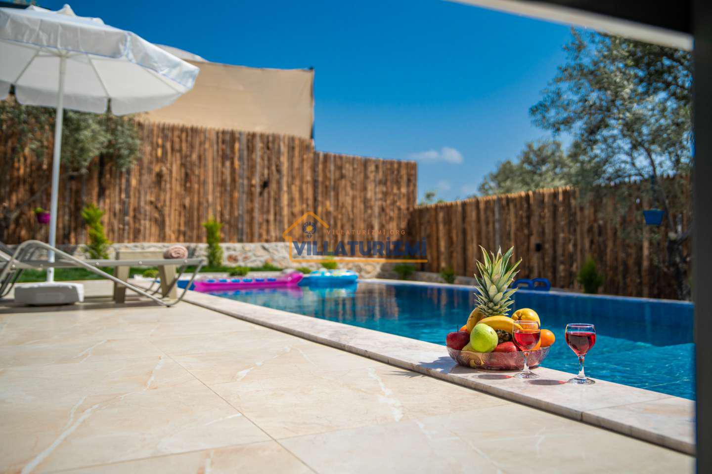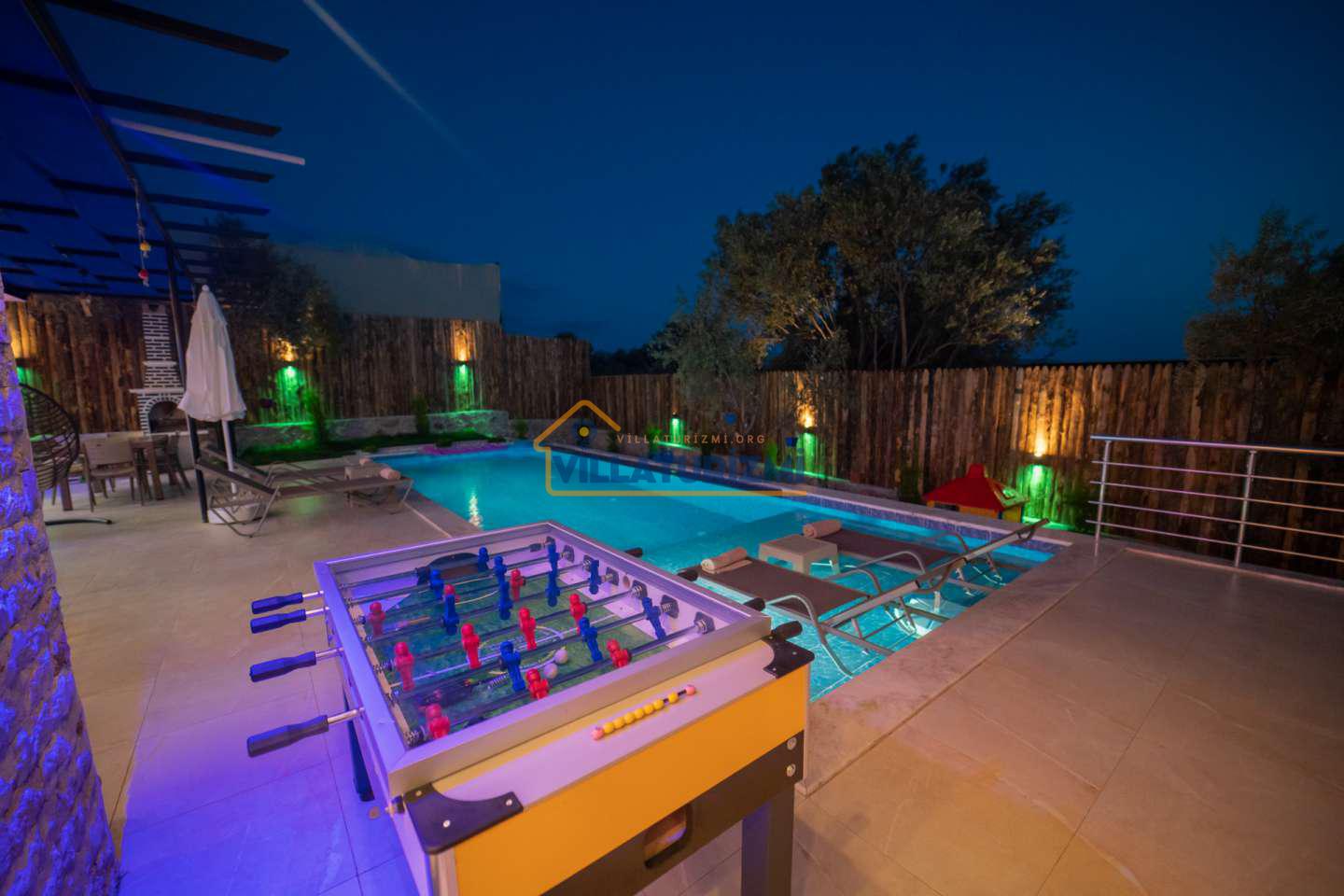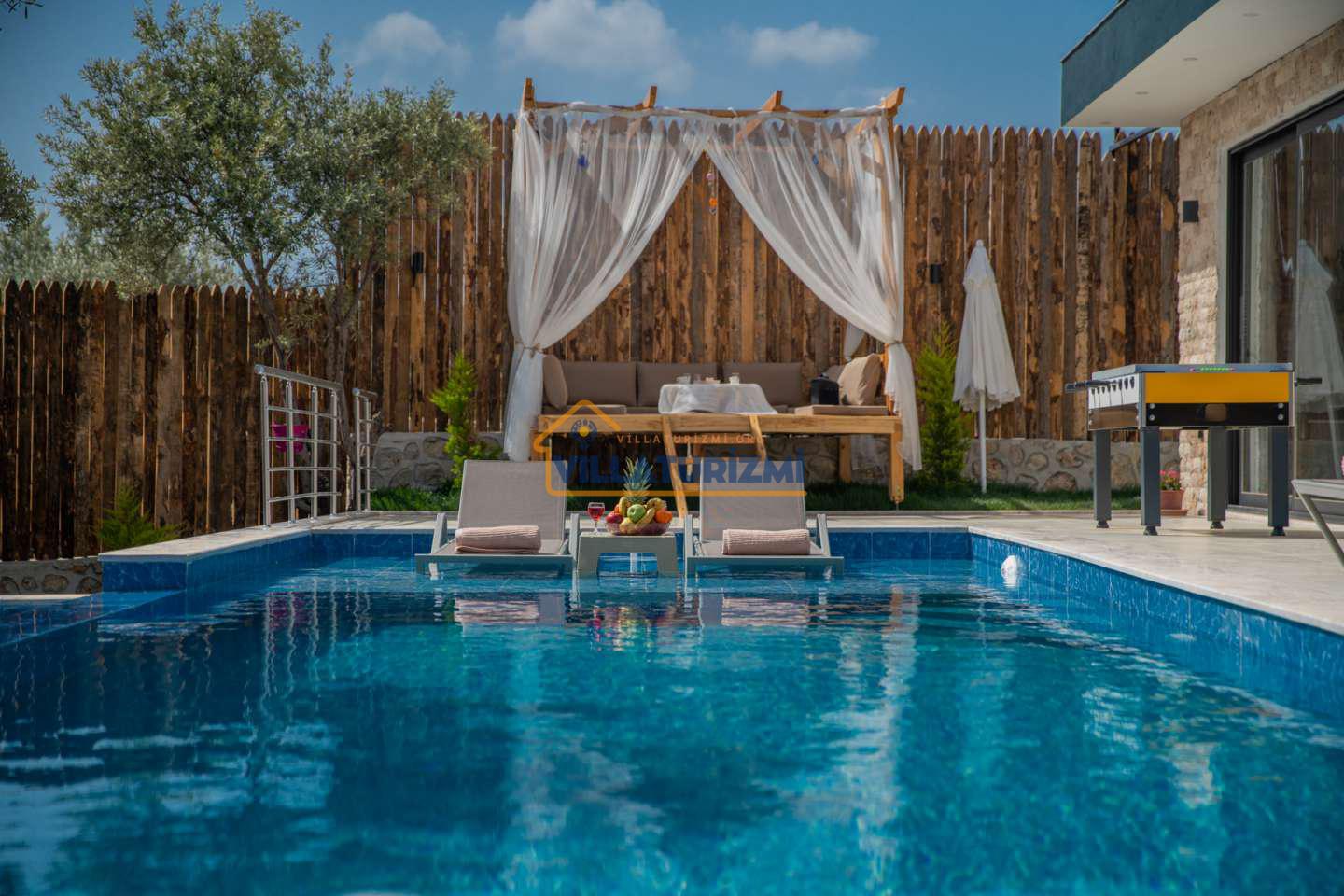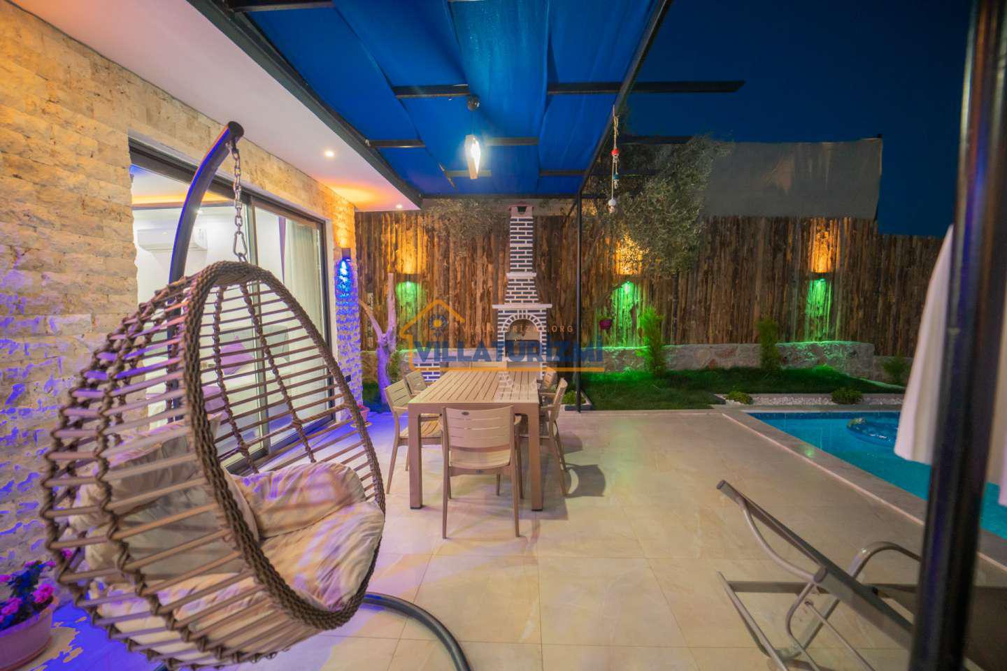 Kiralık villanın özel korunaklı havuzu, dış dünyadan izole, mahremiyetin ön planda tutulduğu bir ortamda serinleme ve dinlenme imkanı sunmaktadır. Bu özellik, özellikle gözlerden uzak bir tatil geçirmek isteyen aileler ve çiftler için büyük bir avantaj sağlamaktadır. Geniş bahçe alanı ise, çocukların güvenle oyun oynayabileceği, yetişkinlerin ise doğayla iç içe vakit geçirebileceği ferah bir yaşam alanı sunmaktadır. Çocuk oyun alanı, minik misafirlerin eğlenceli ve keyifli bir tatil geçirmesini sağlarken, ebeveynlerin de rahat bir nefes almasına olanak tanımaktadır.