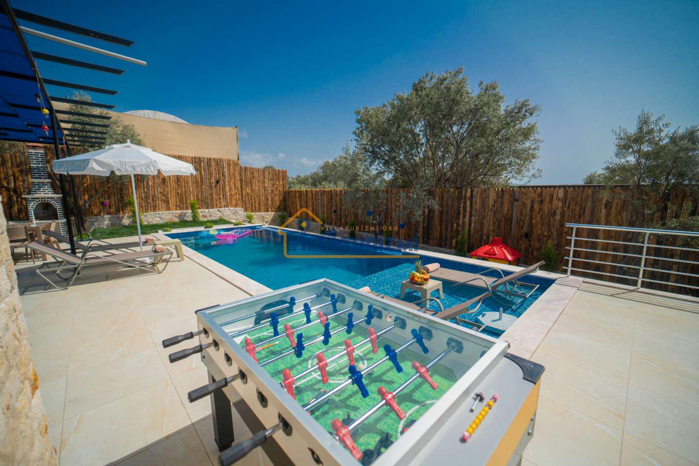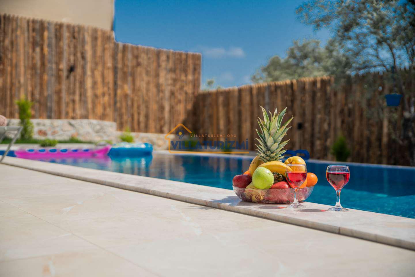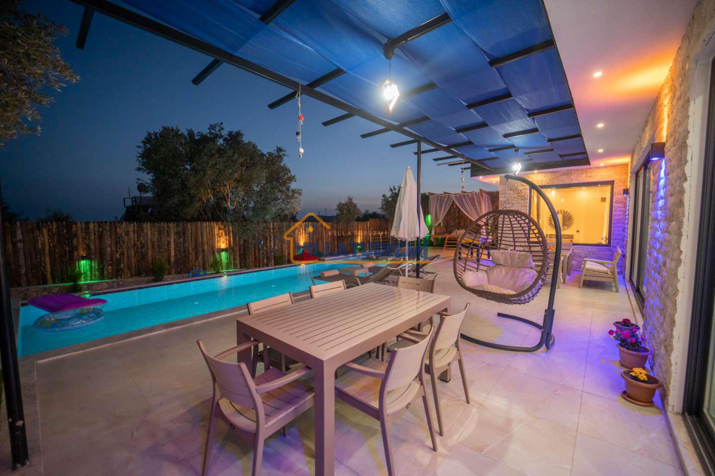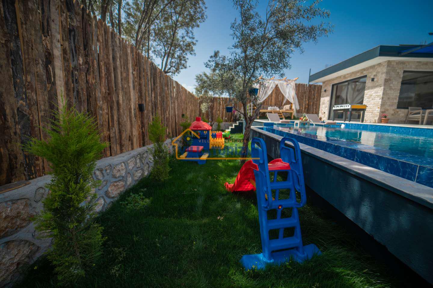 Kiralık villanın özel korunaklı havuzu, dış dünyadan izole, mahremiyetin ön planda tutulduğu bir ortamda serinleme ve dinlenme imkanı sunmaktadır. Bu özellik, özellikle gözlerden uzak bir tatil geçirmek isteyen aileler ve çiftler için büyük bir avantaj sağlamaktadır. Geniş bahçe alanı ise, çocukların güvenle oyun oynayabileceği, yetişkinlerin ise doğayla iç içe vakit geçirebileceği ferah bir yaşam alanı sunmaktadır. Çocuk oyun alanı, minik misafirlerin eğlenceli ve keyifli bir tatil geçirmesini sağlarken, ebeveynlerin de rahat bir nefes almasına olanak tanımaktadır.