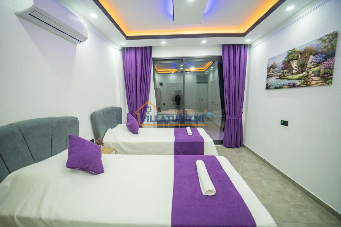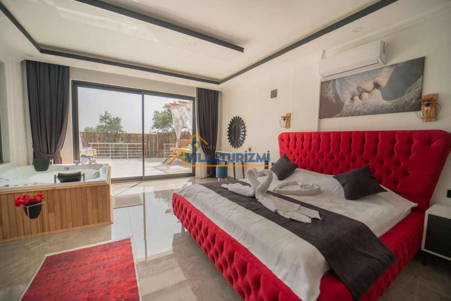 Kiralık Villa Aslanbey, 2 yatak odası ile maksimum 4 kişiye kadar konaklama imkânı sağlamakta olup, küçük aileler veya arkadaş grupları için ideal kapasitededir. Yatak odalarındaki konfor unsurları titizlikle düşünülmüş, modern ve şık bir şekilde dizayn edilmiştir. Ebeveyn odasında bulunan çift kişilik jakuzi ise misafirlere ekstra bir lüks ve rahatlama imkânı tanır. Jakuzi keyfi, hem fiziksel yorgunluğun atılmasına hem de ruhsal anlamda dinlenmeye katkıda bulunarak, tatilin çok daha özel ve unutulmaz geçmesini sağlar.