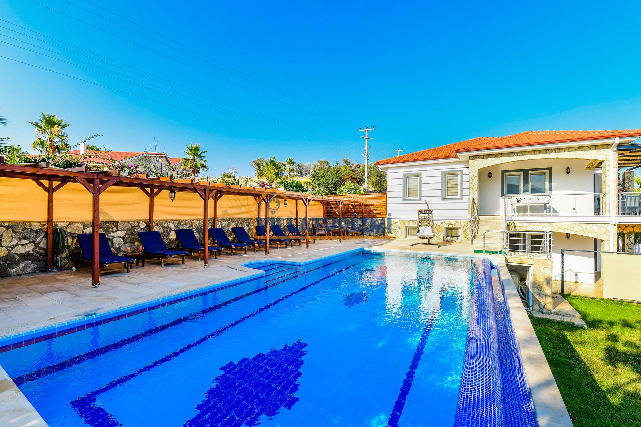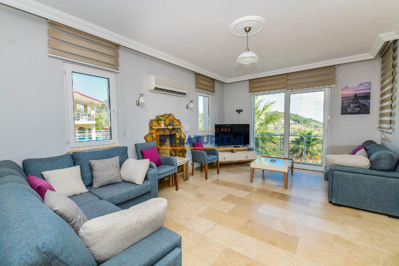 Salon: oturma grubu, yemek masası, LCD TV, uydu alıcısı, salondan havuza çıkış ve ortak kullanım tuvalet bulunmaktadır.