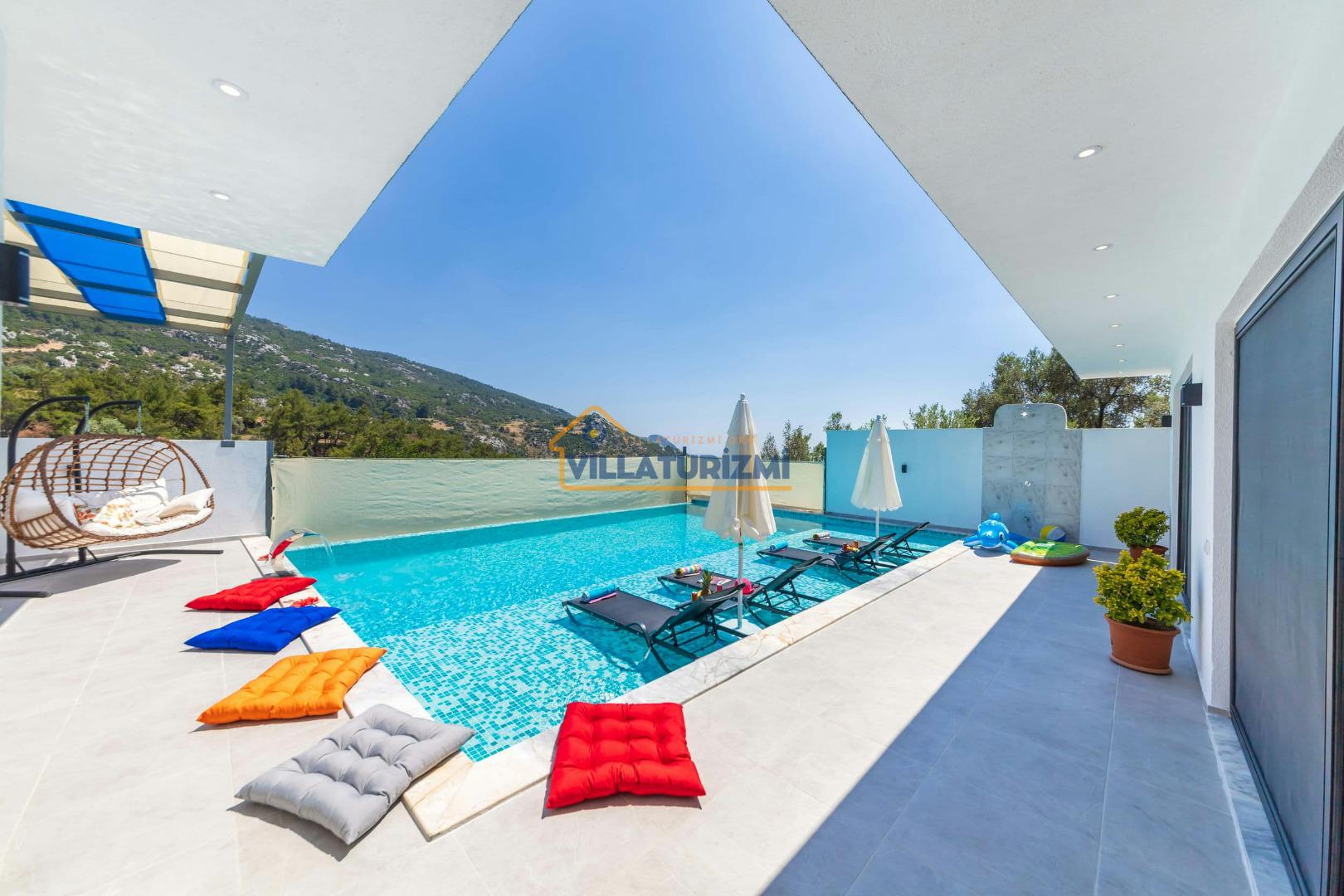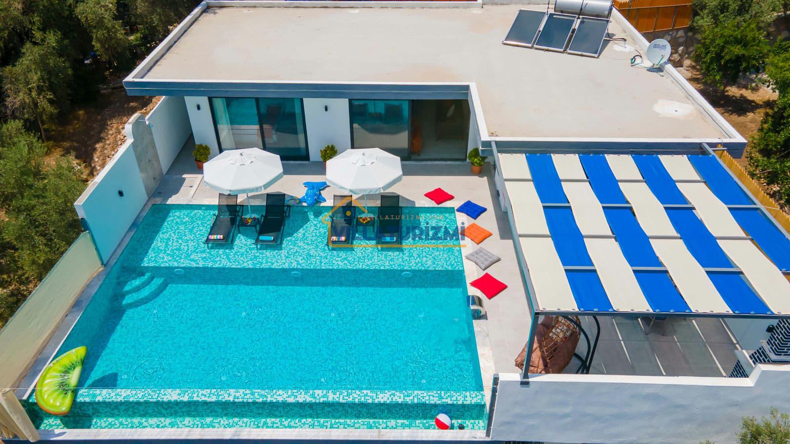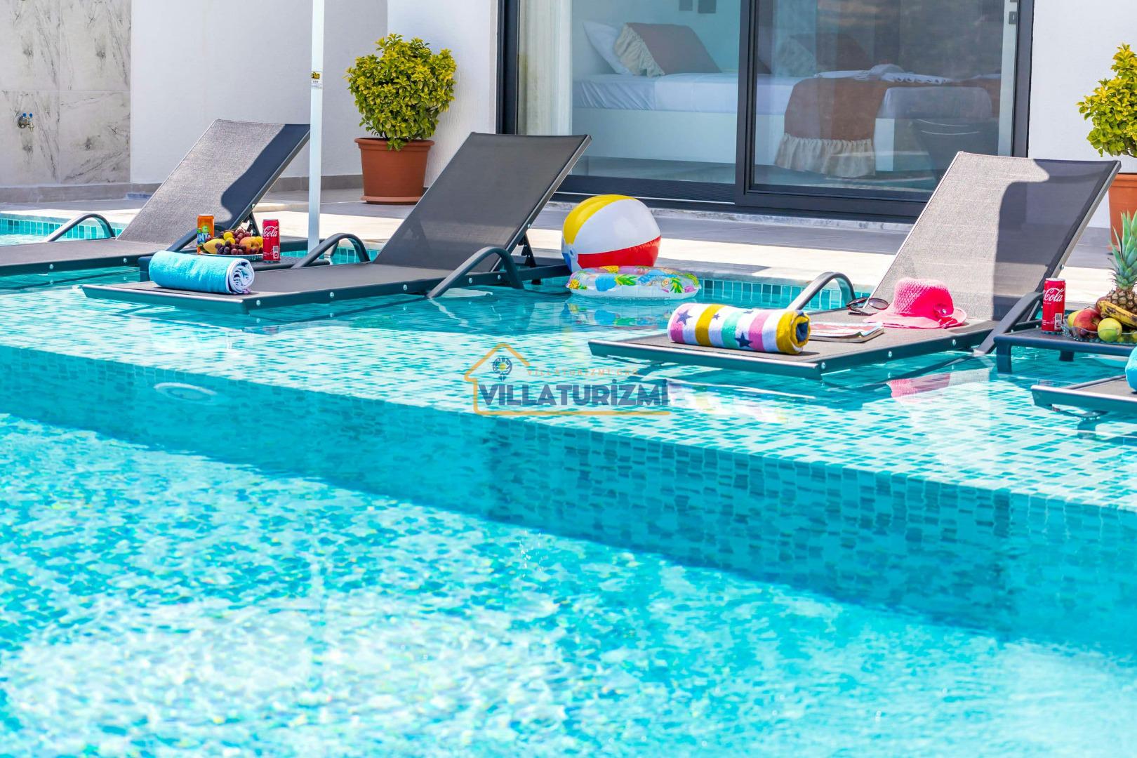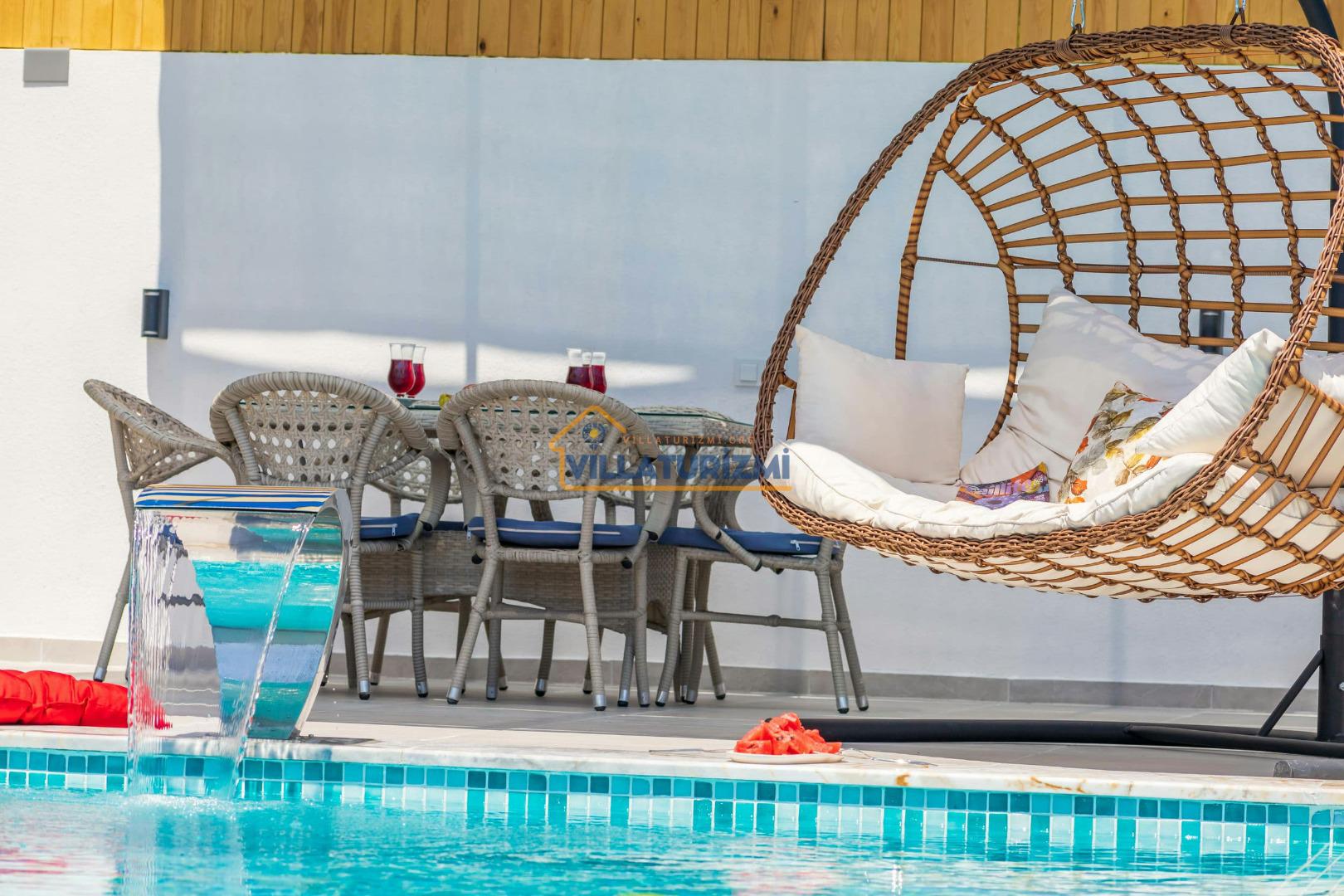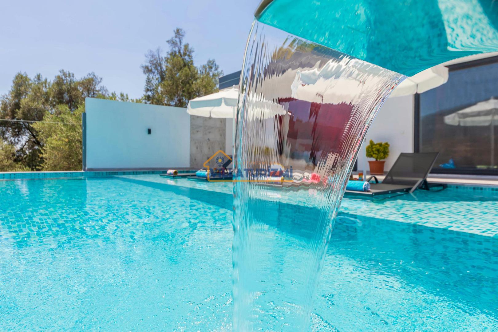Villa'nın sahip olduğu özel korunaklı havuzu, misafirlere büyüleyici bir manzara eşliğinde yüzme keyfi yaşatmaktadır. Havuzun etrafı tamamen korunaklı bir şekilde dizayn edilmiştir; bu sayede tatilinizi daha özel ve mahrem bir ortamda geçirme fırsatına sahip olmaktasınız. Özellikle balayı çiftleri için düşünülmüş bu korunaklı alan, dışarıdan hiçbir gözün sizi rahatsız edemeyeceği bir tatil deneyimi sunmaktadır. Eşinizle birlikte romantik anlar yaşayabileceğiniz bu özel alanda, tatilin tadını çıkarabilirsiniz.