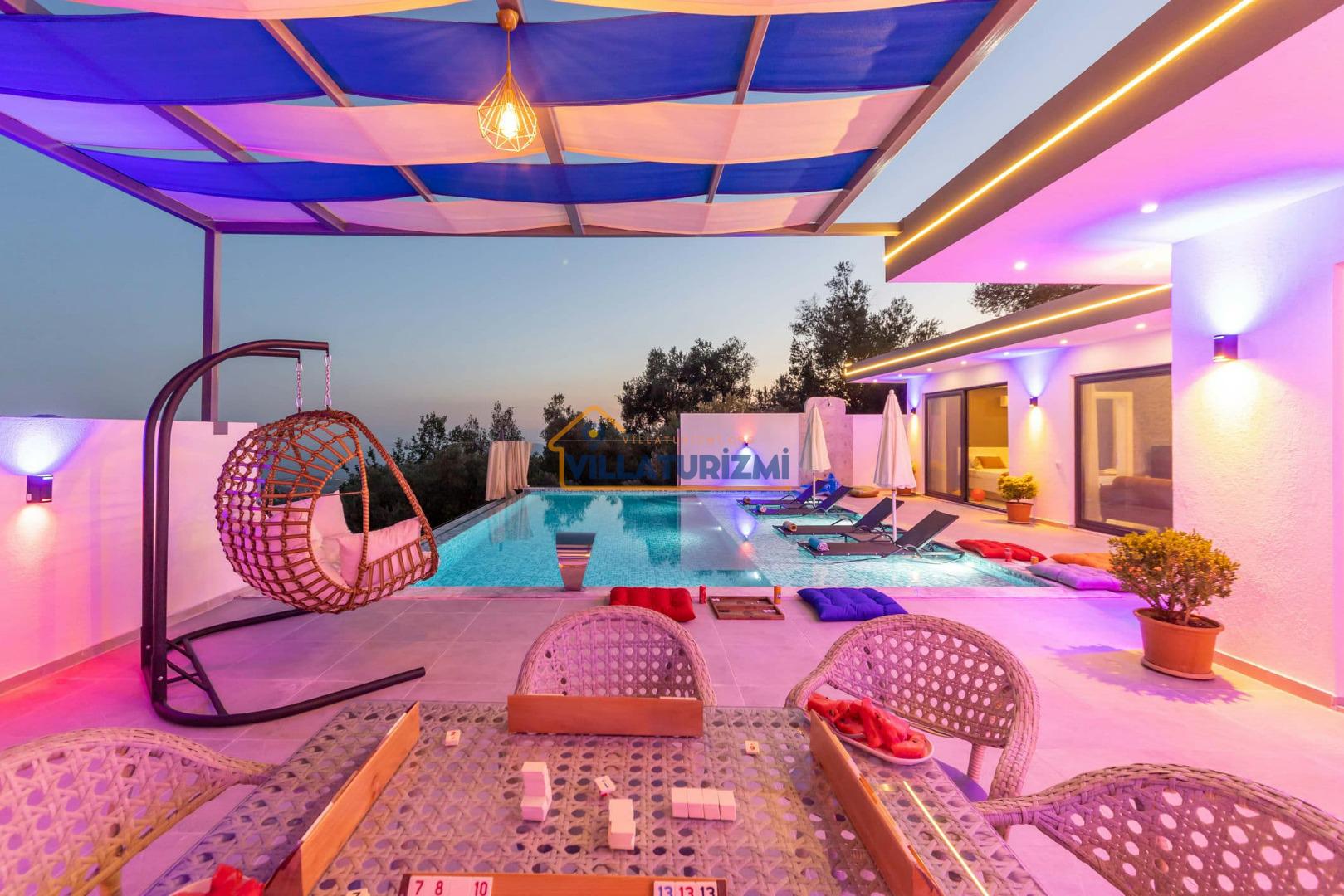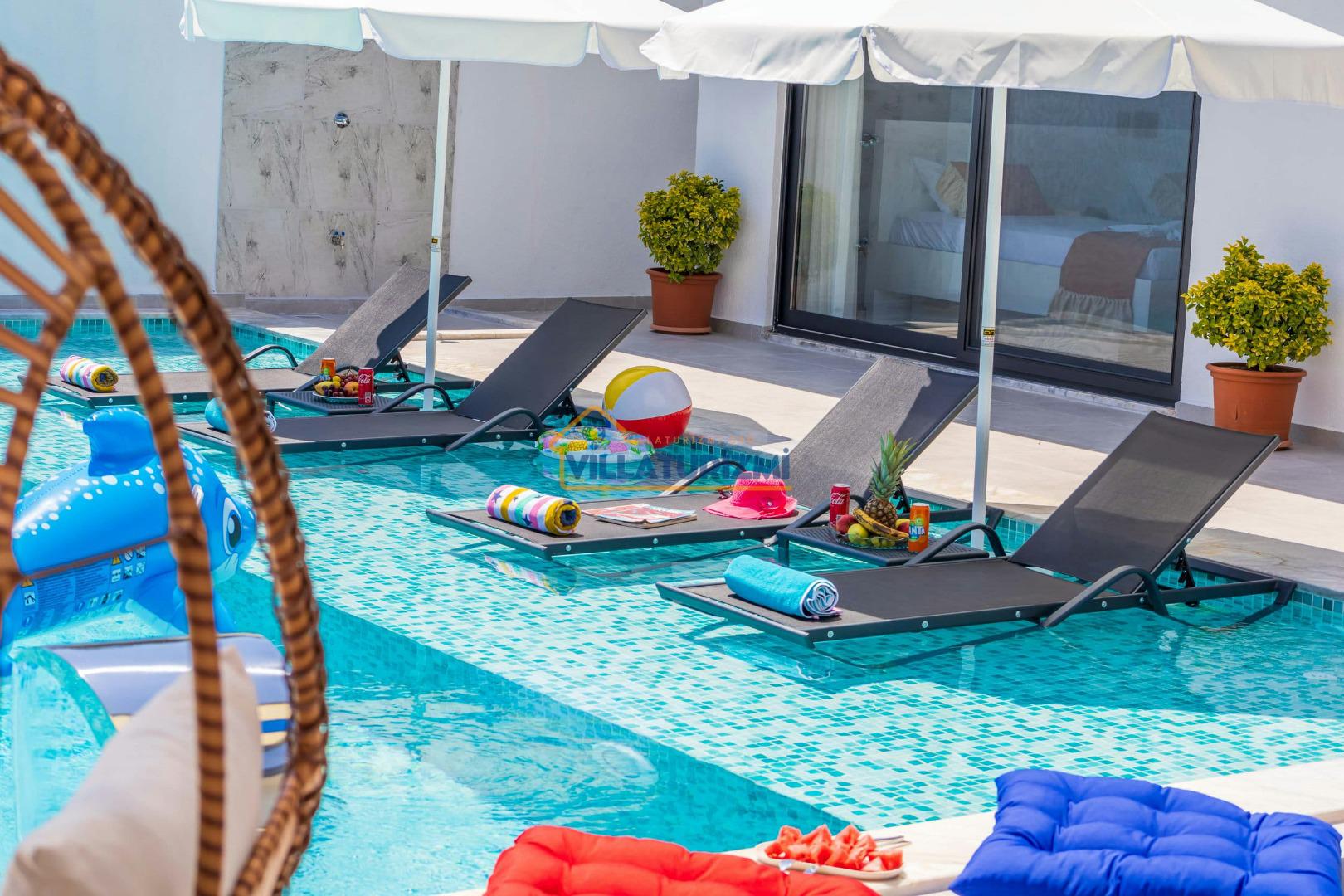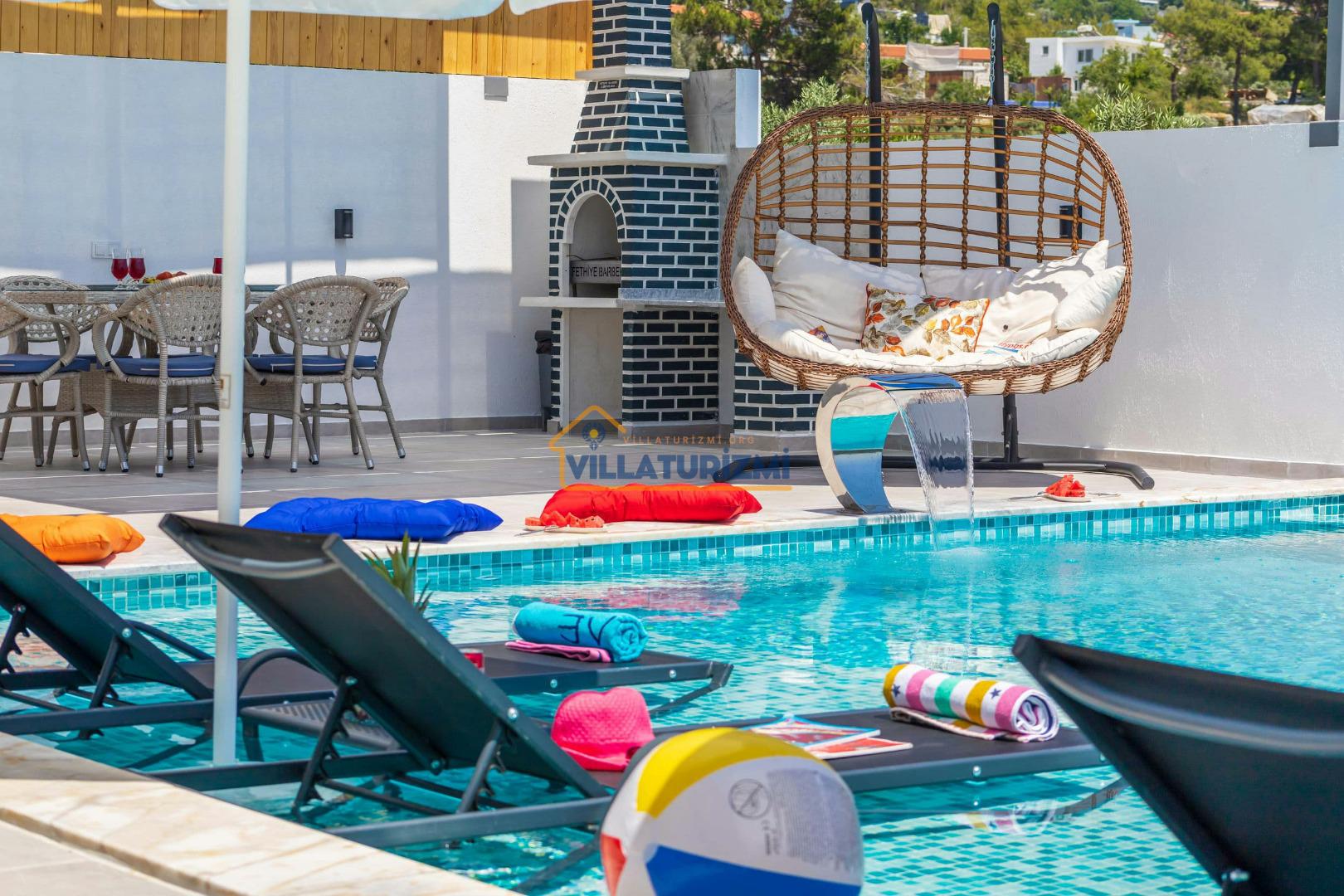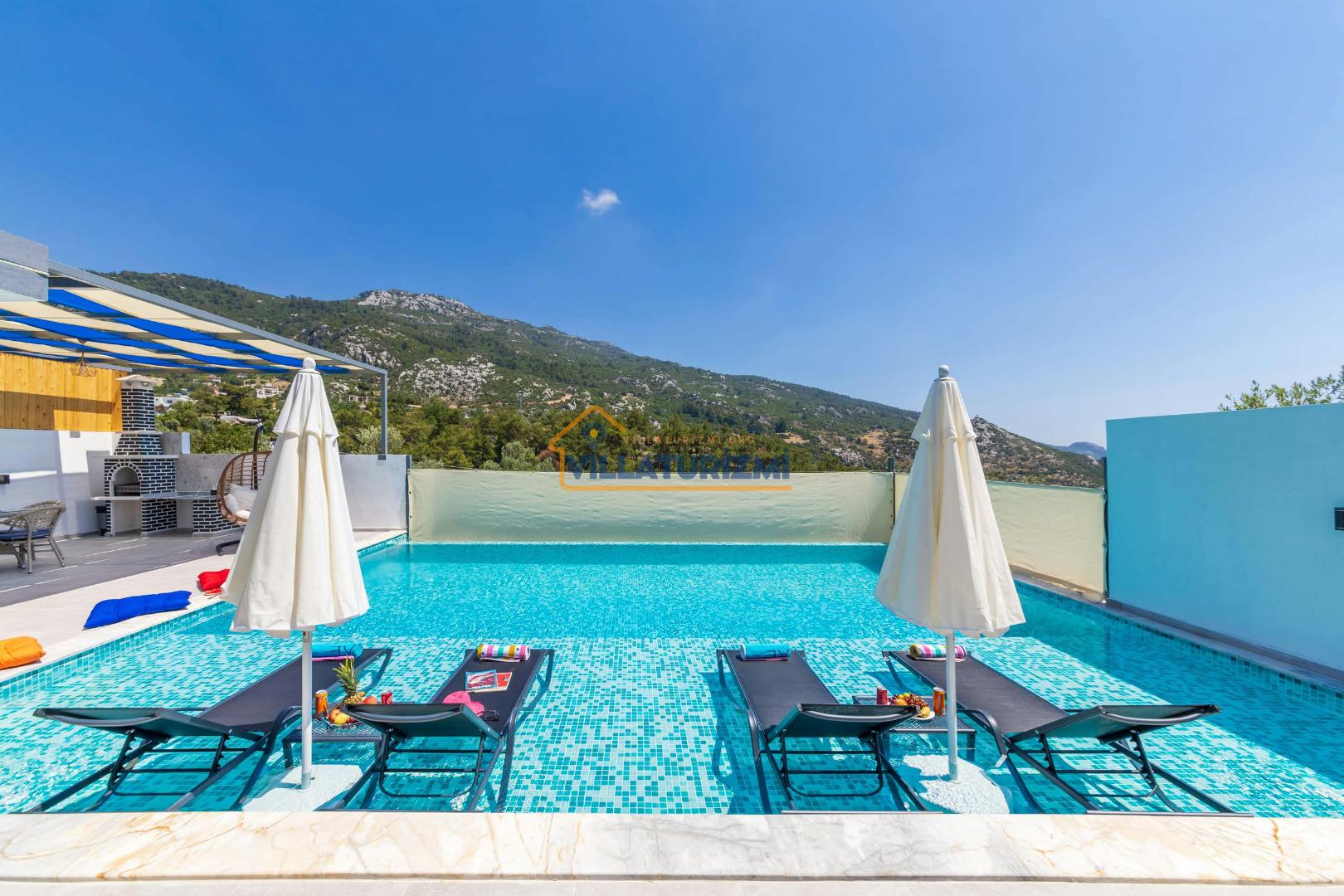 Villa'nın sahip olduğu özel korunaklı havuzu, misafirlere büyüleyici bir manzara eşliğinde yüzme keyfi yaşatmaktadır. Havuzun etrafı tamamen korunaklı bir şekilde dizayn edilmiştir; bu sayede tatilinizi daha özel ve mahrem bir ortamda geçirme fırsatına sahip olmaktasınız. Özellikle balayı çiftleri için düşünülmüş bu korunaklı alan, dışarıdan hiçbir gözün sizi rahatsız edemeyeceği bir tatil deneyimi sunmaktadır. Eşinizle birlikte romantik anlar yaşayabileceğiniz bu özel alanda, tatilin tadını çıkarabilirsiniz.