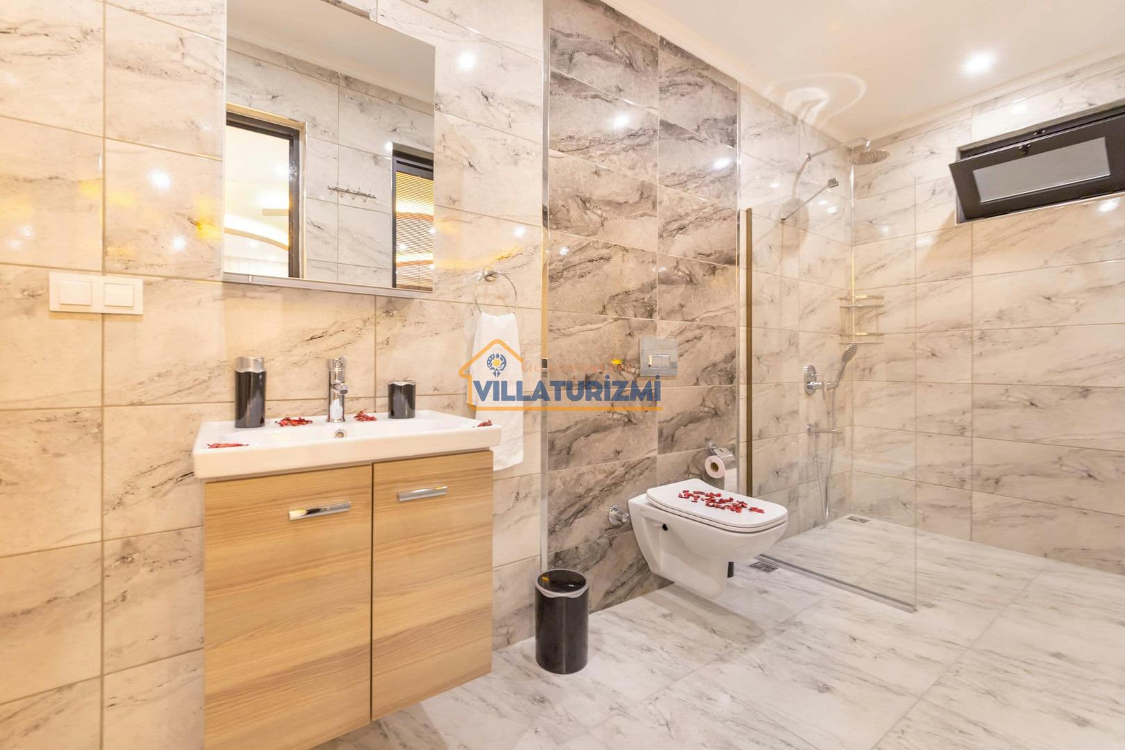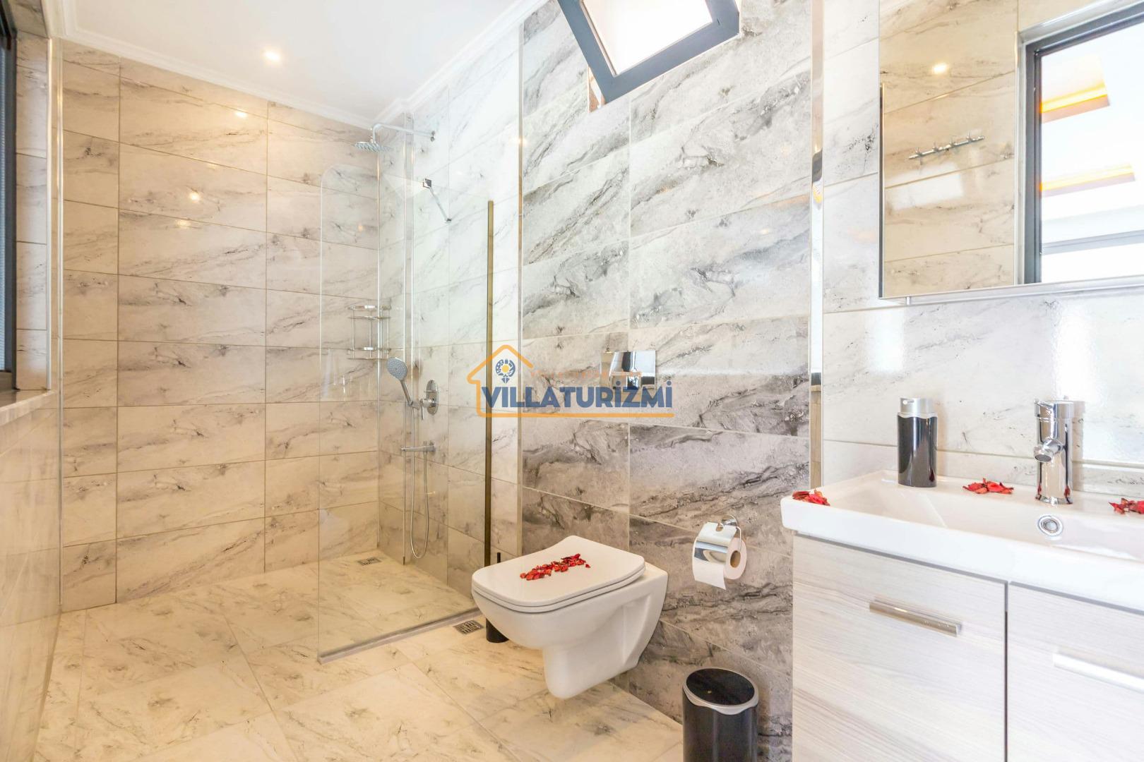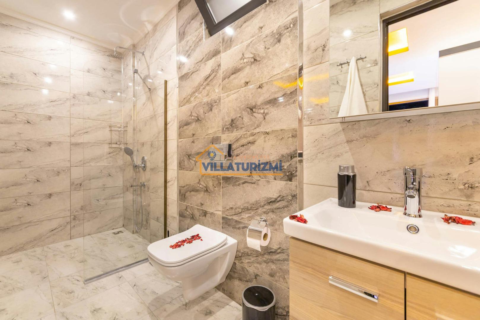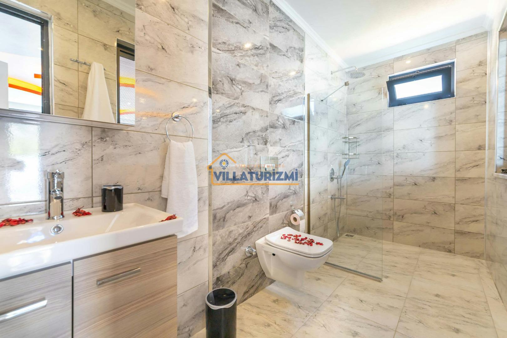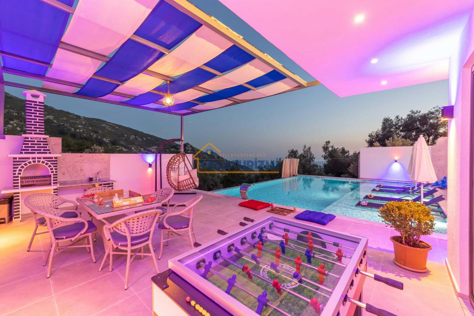 Villa'nın sahip olduğu özel korunaklı havuzu, misafirlere büyüleyici bir manzara eşliğinde yüzme keyfi yaşatmaktadır. Havuzun etrafı tamamen korunaklı bir şekilde dizayn edilmiştir; bu sayede tatilinizi daha özel ve mahrem bir ortamda geçirme fırsatına sahip olmaktasınız. Özellikle balayı çiftleri için düşünülmüş bu korunaklı alan, dışarıdan hiçbir gözün sizi rahatsız edemeyeceği bir tatil deneyimi sunmaktadır. Eşinizle birlikte romantik anlar yaşayabileceğiniz bu özel alanda, tatilin tadını çıkarabilirsiniz.