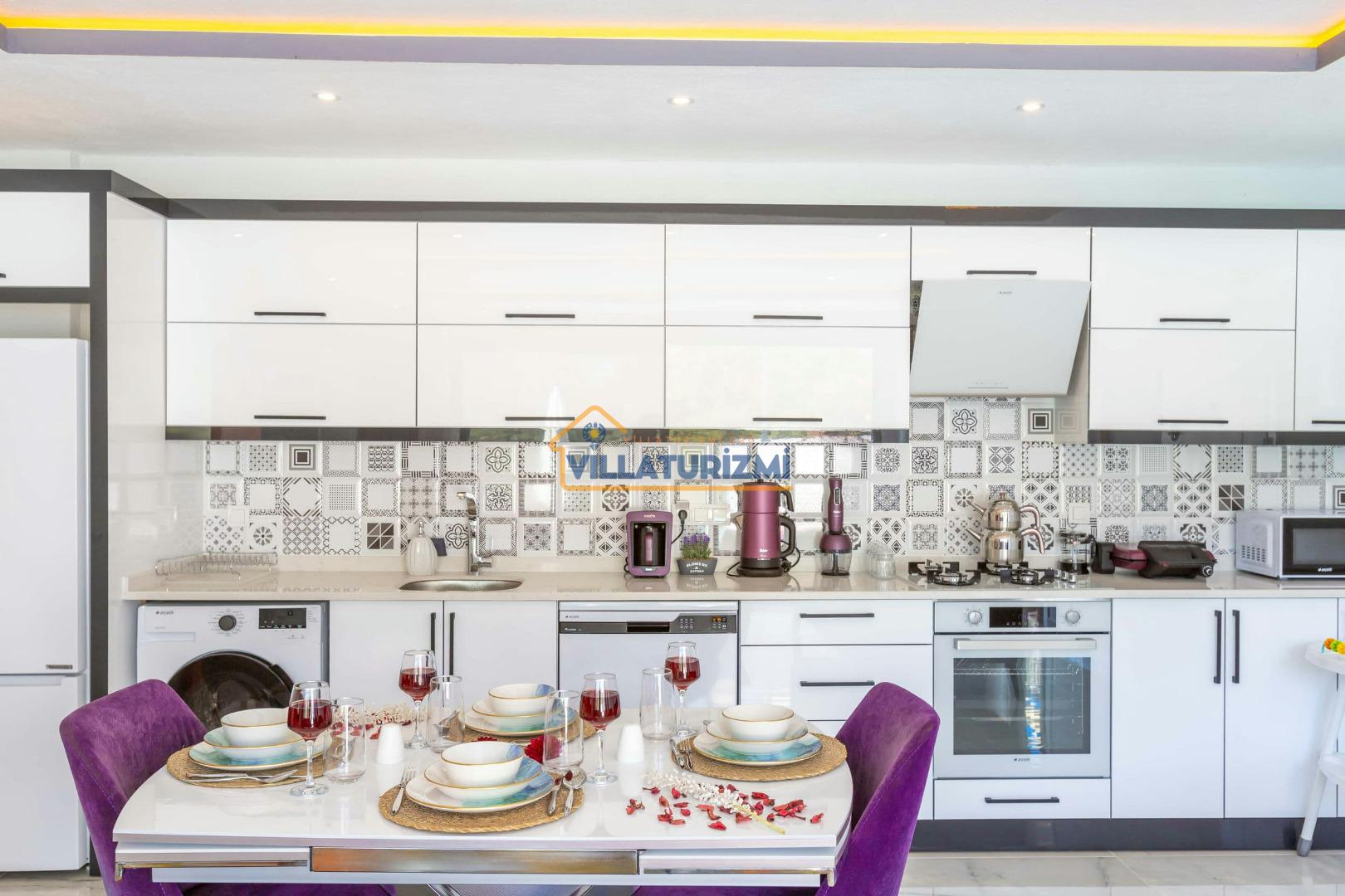 Salon ve Mutfak: Geniş ve modern bir salon, mutfak ve yemek alanı toplam 6,5mt uzunluk 5,5mt enindedir. Salonda bolca oturma alanı ve gösteren 107” Smart Led TV ve müzik sistemi mevcuttur. Tam donanımlı ankastre mutfakta elektrikli fırın, ocak, buzdolabı, bulaşık makinası, Çamaşır makinesi, kahve makinası, tost makinası, ekmek kızartma makinesi, Mutfak robotu, kettle bulunur. Mutfakta yemek yapılabilmesi için gerekli her türlü araç gereç mevcuttur. Yemek masası 6 kişiliktir.