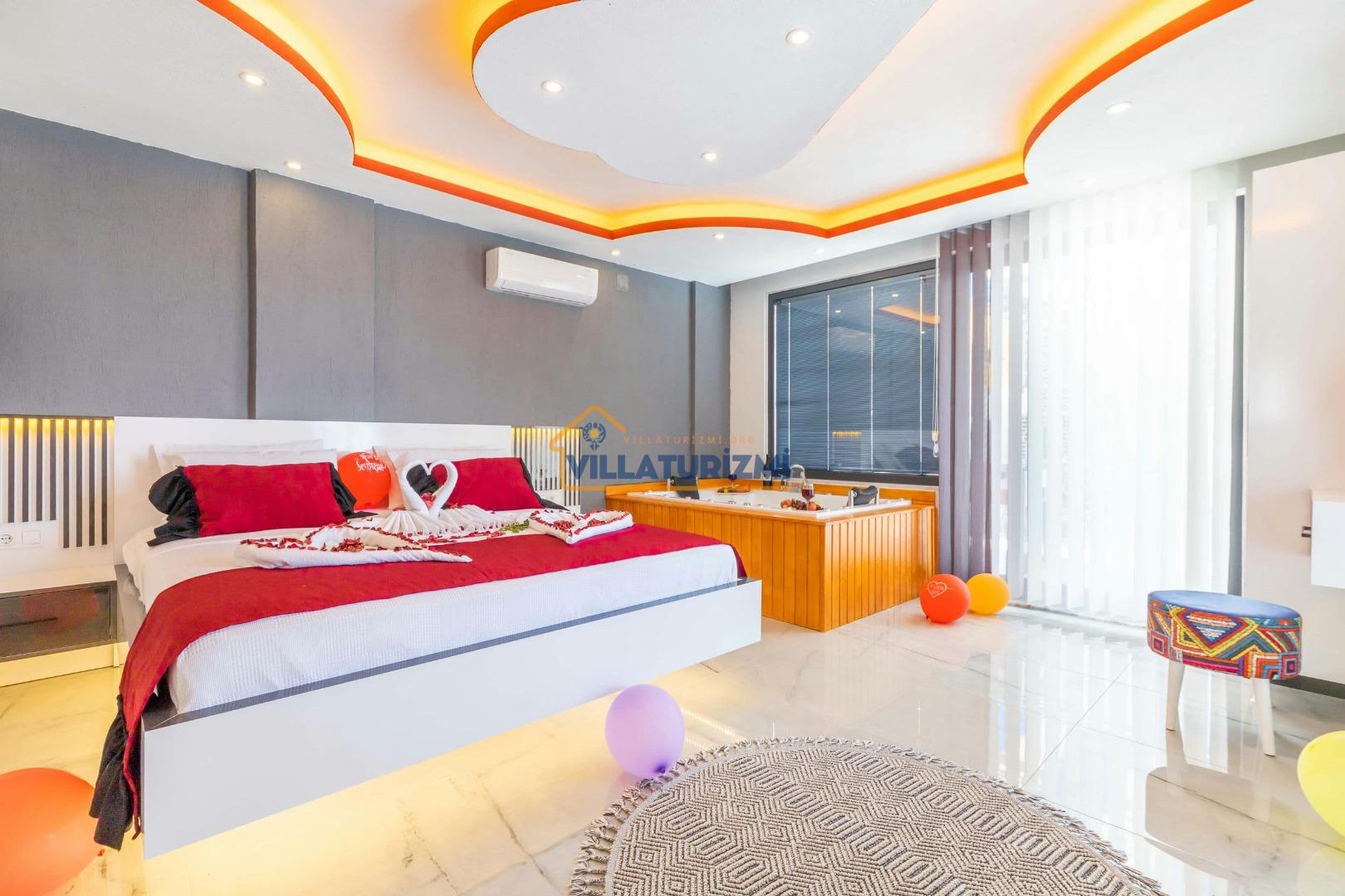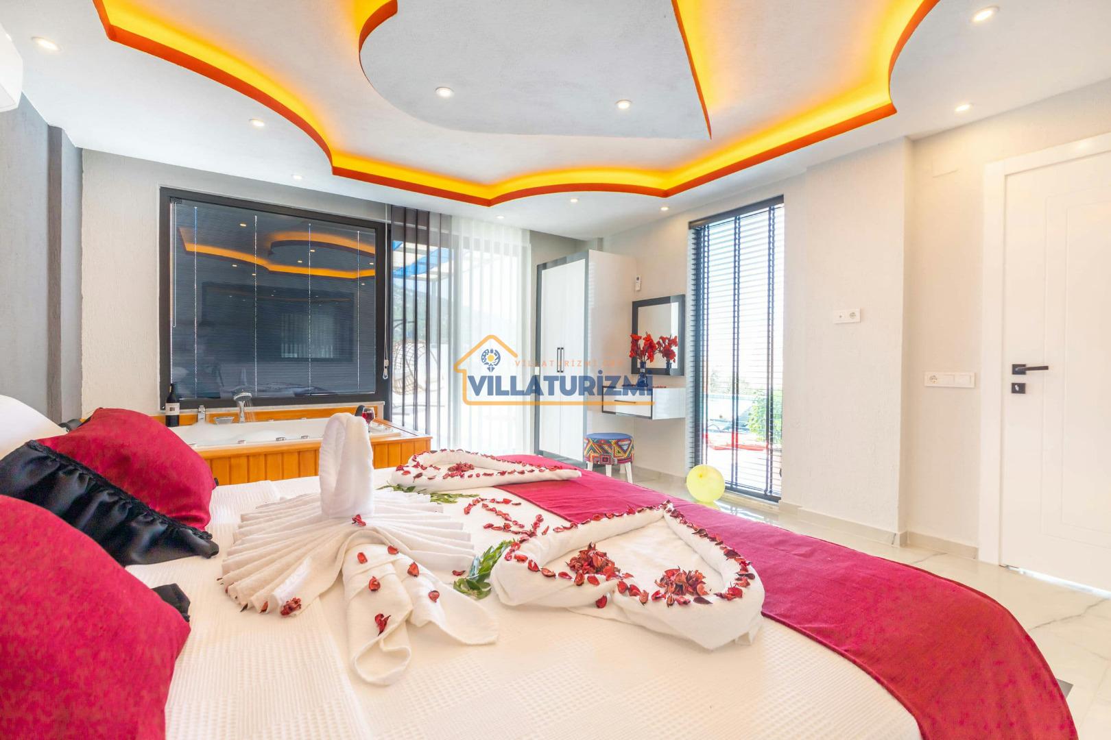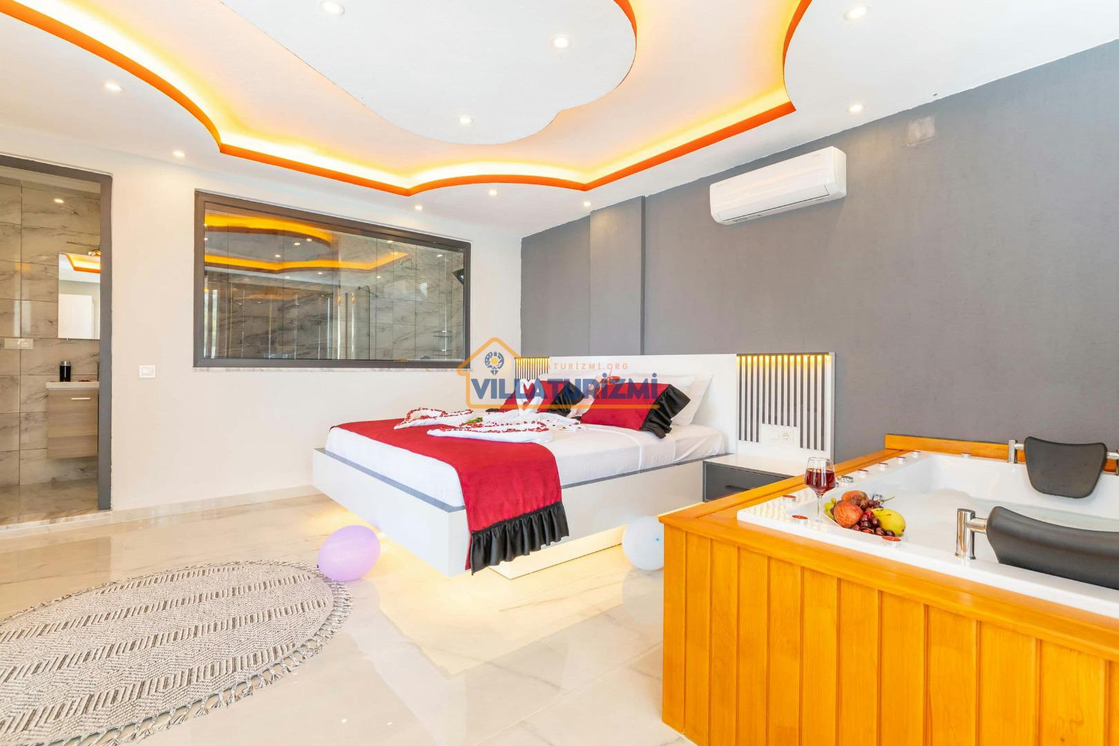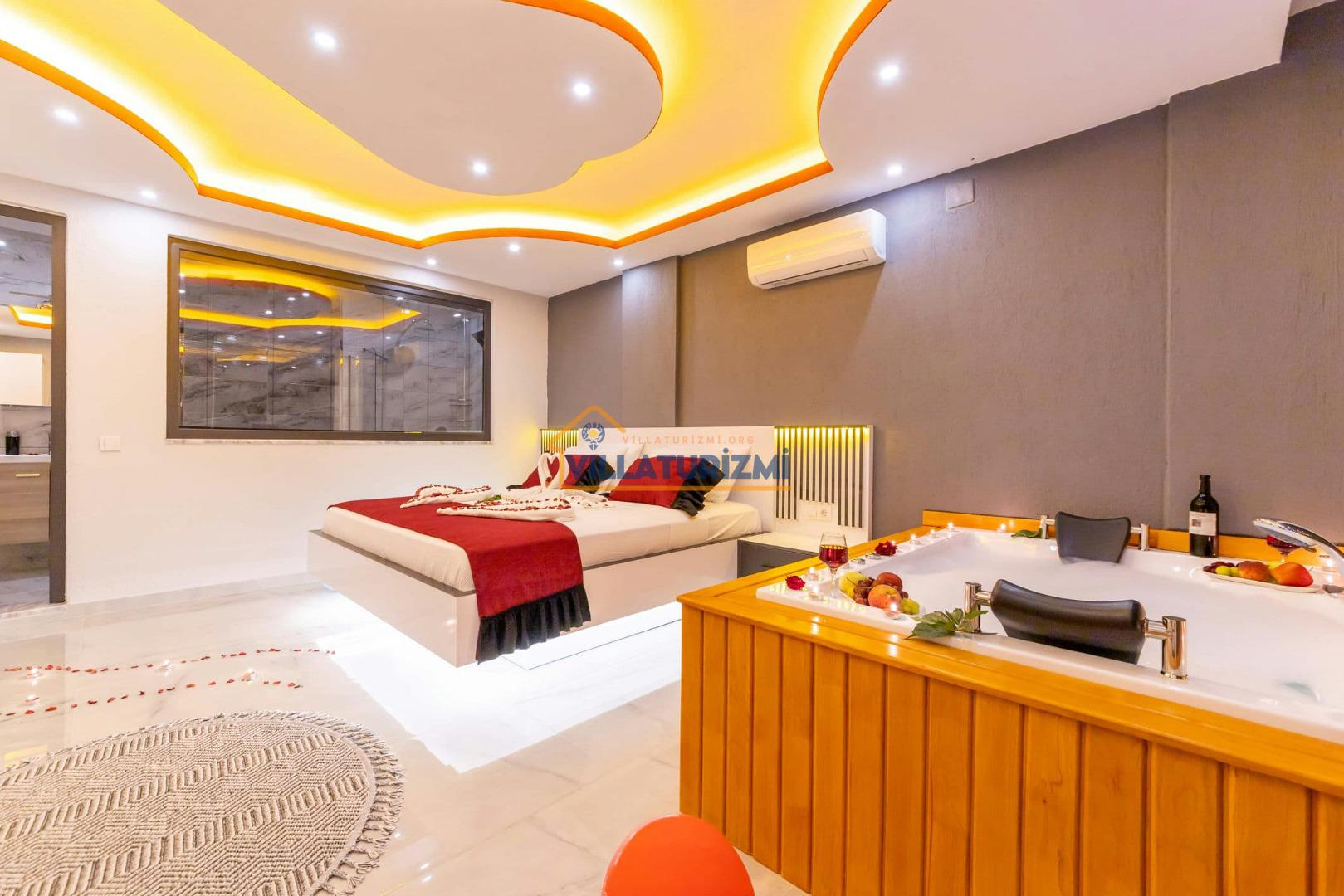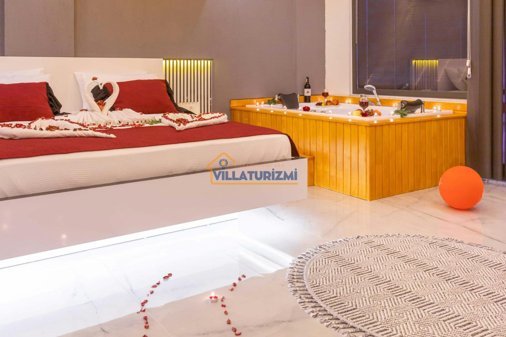 1.Yatak Odası: Ebeveyn/Balayı odası balayı konseptiyle dekore edilmiştir ve havuz manzaralıdır her odanın kapısı havuza çıkışlıdır. Büyük boy (200cmx200cm) çift kişilik yatak bulunur. Çift kişilik jakuzi bulunur. Banyo oda içerisindedir. Oda büyüklüğü 10m2’dir.