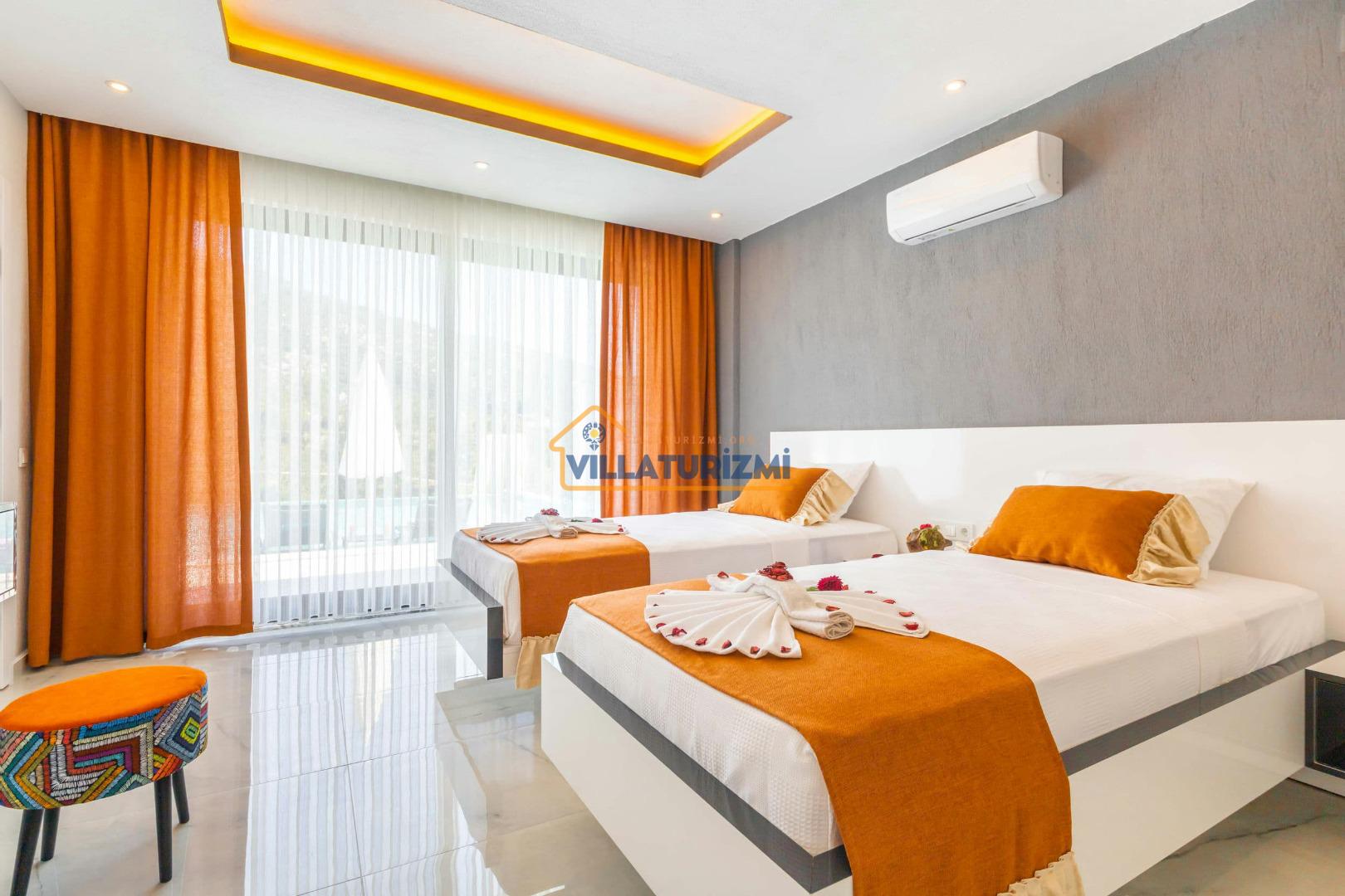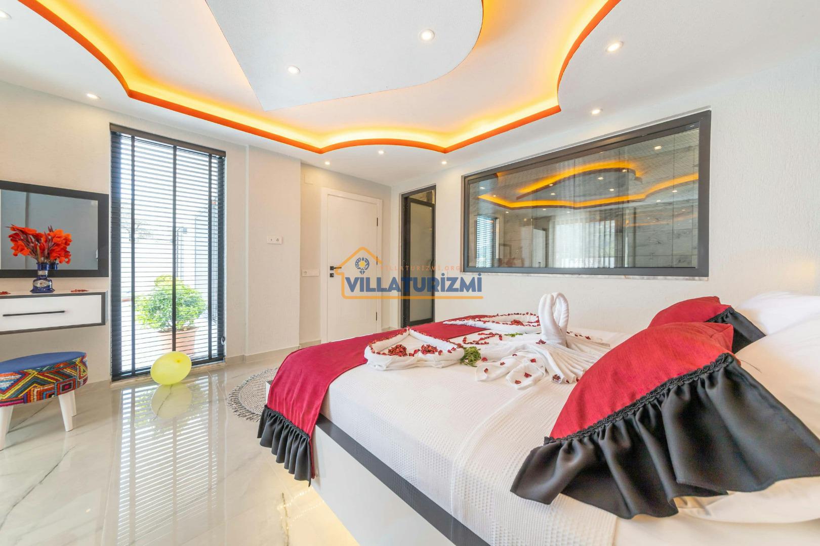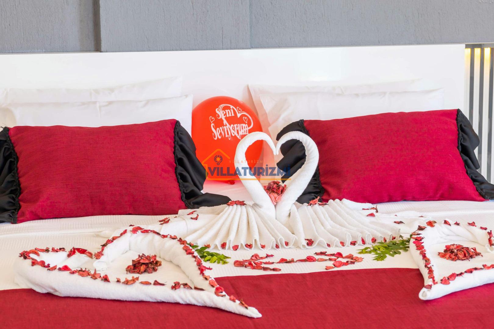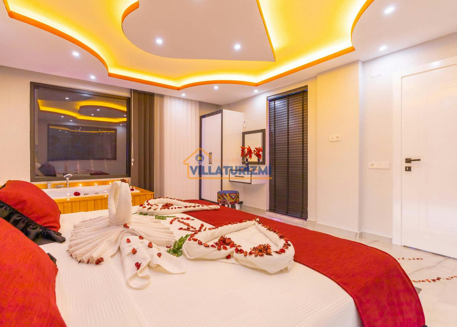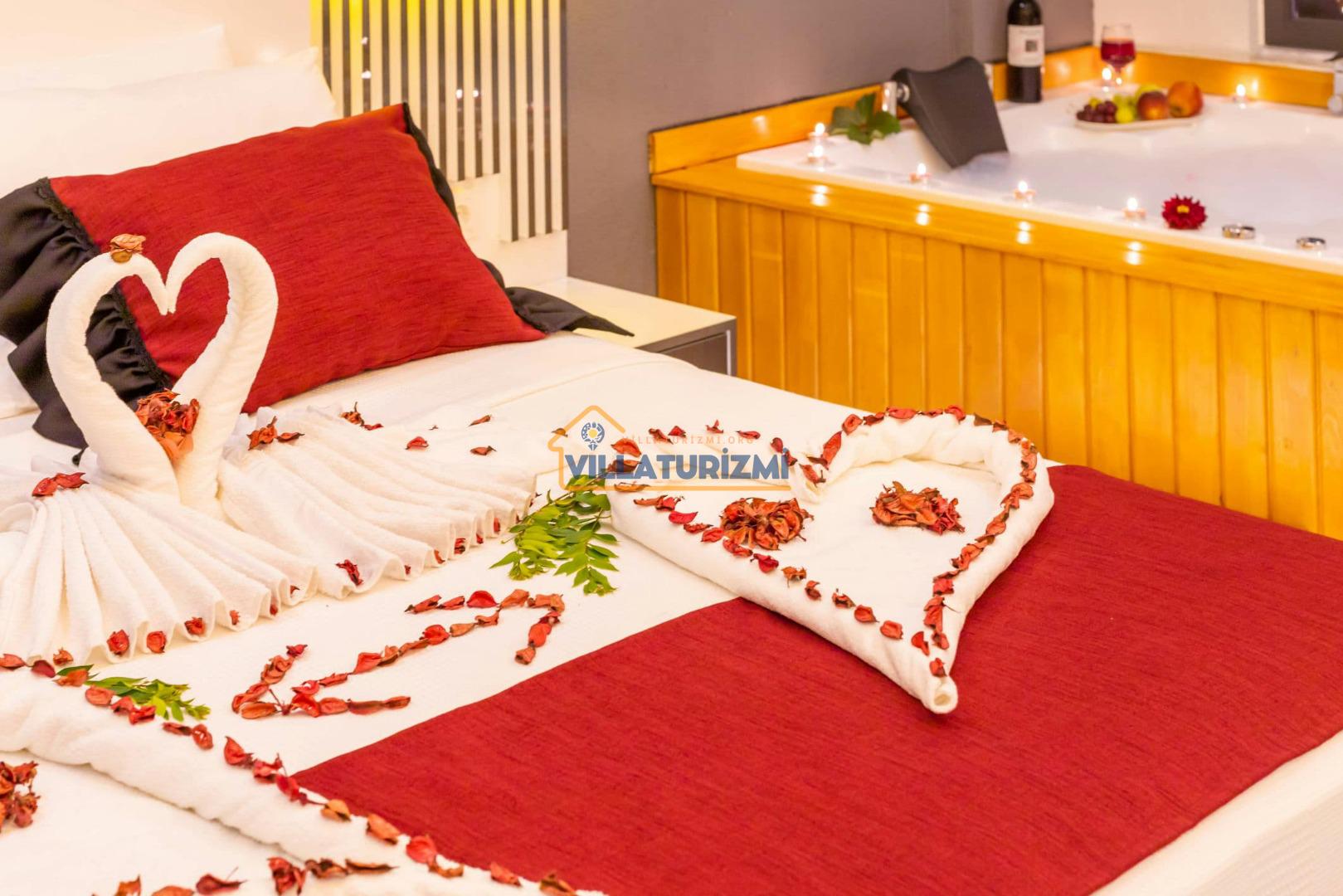 1.Yatak Odası: Ebeveyn/Balayı odası balayı konseptiyle dekore edilmiştir ve havuz manzaralıdır her odanın kapısı havuza çıkışlıdır. Büyük boy (200cmx200cm) çift kişilik yatak bulunur. Çift kişilik jakuzi bulunur. Banyo oda içerisindedir. Oda büyüklüğü 10m2’dir.