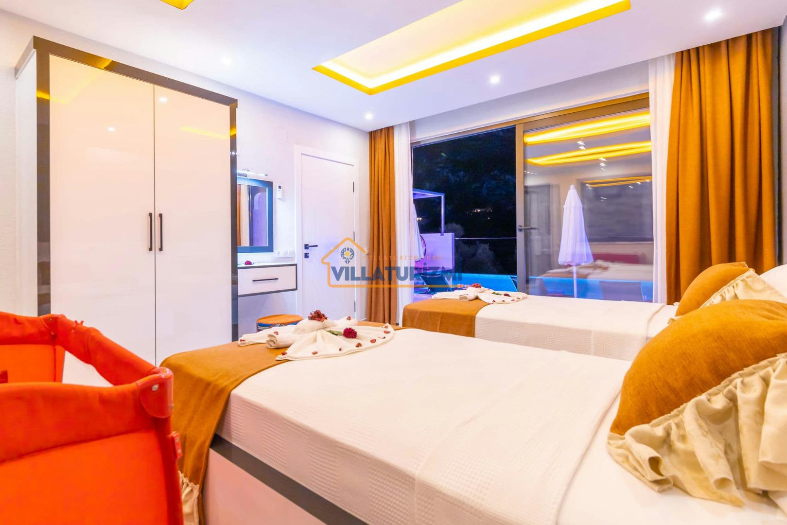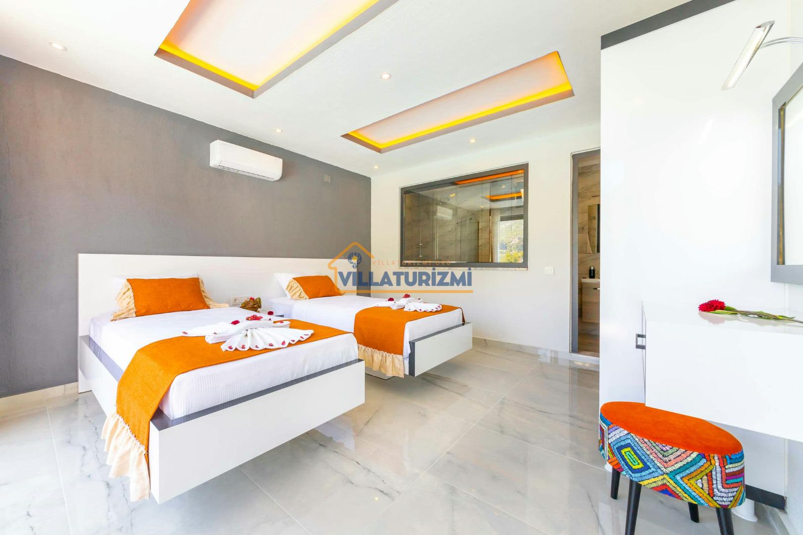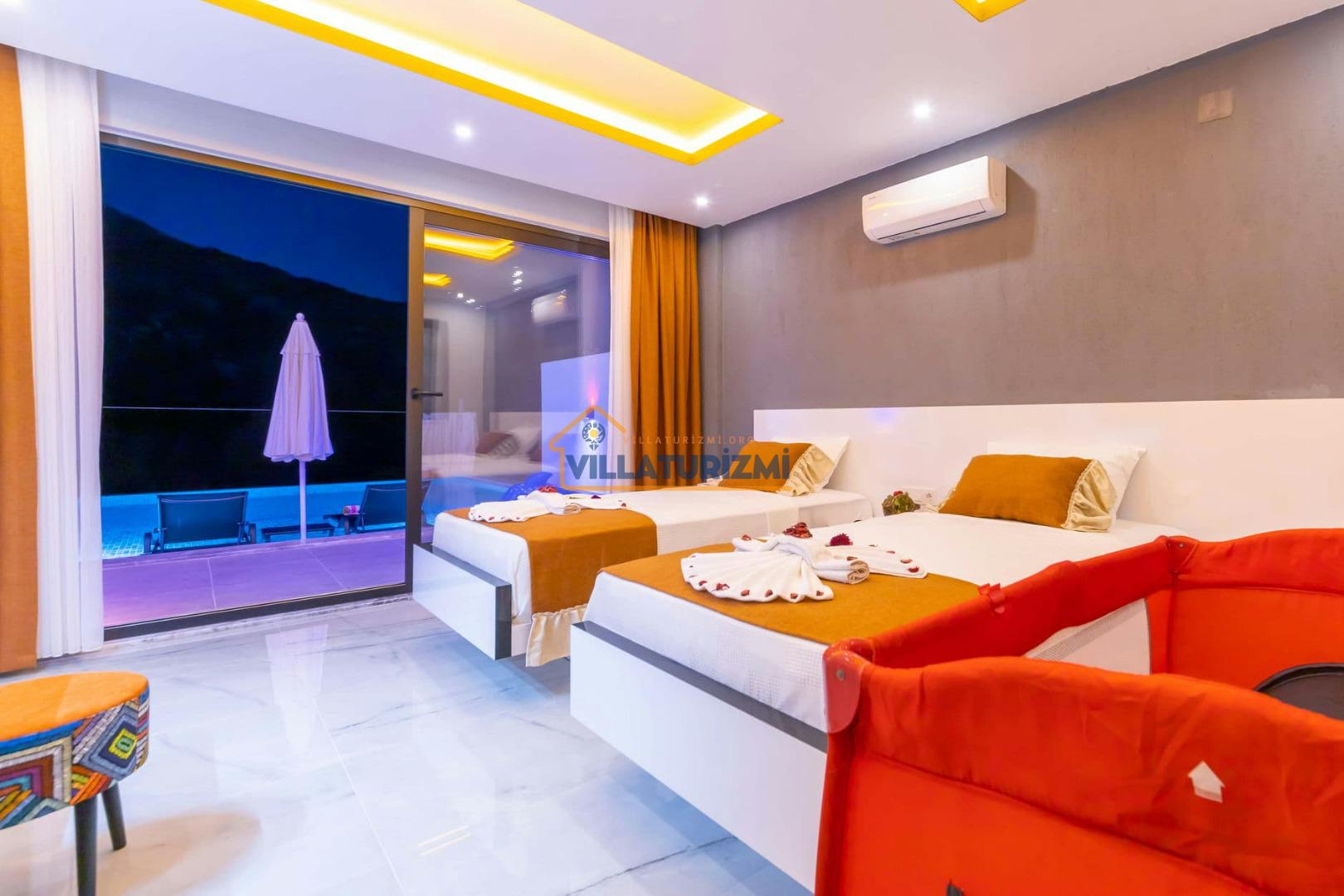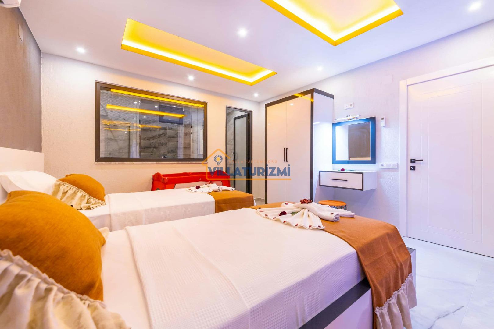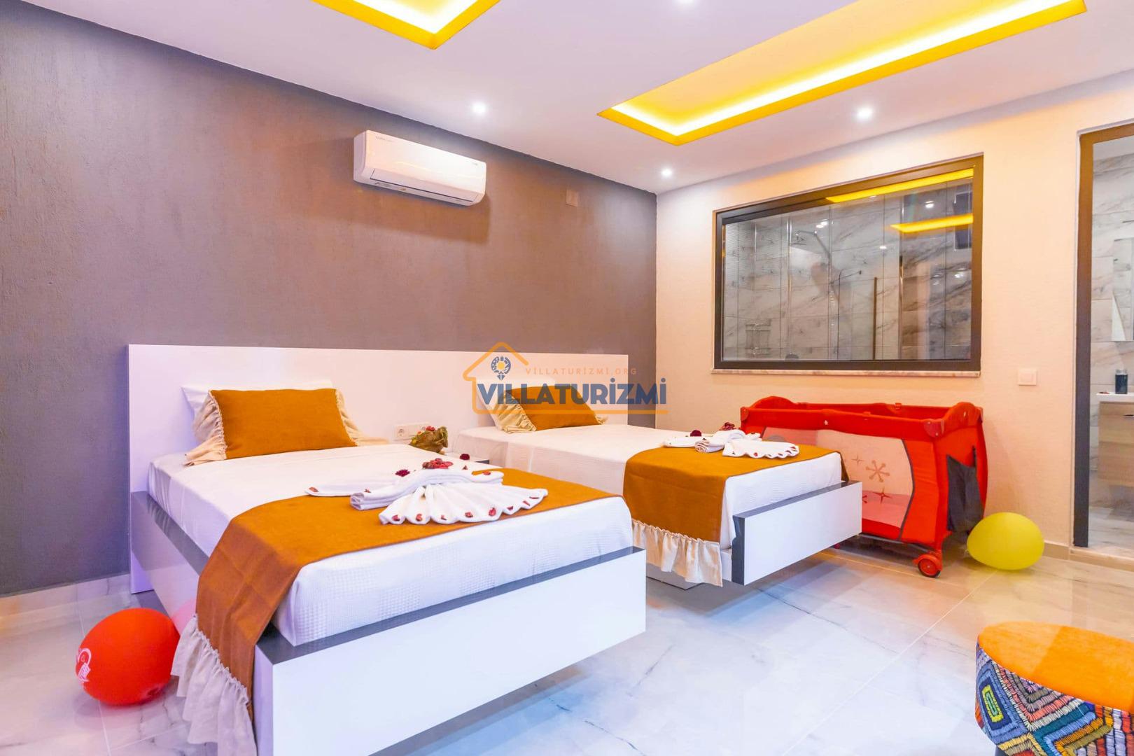 1.Yatak Odası: Ebeveyn/Balayı odası balayı konseptiyle dekore edilmiştir ve havuz manzaralıdır her odanın kapısı havuza çıkışlıdır. Büyük boy (200cmx200cm) çift kişilik yatak bulunur. Çift kişilik jakuzi bulunur. Banyo oda içerisindedir. Oda büyüklüğü 10m2’dir.