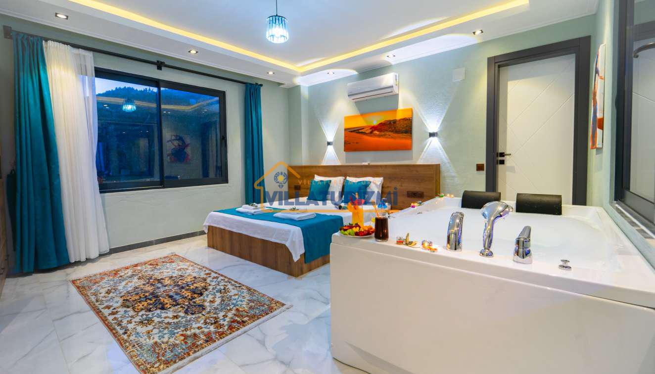 Villamızın özellikle havuz ve bahçe kısmı, konukların gizliliğini koruyacak şekilde tasarlanmış olup, deniz manzaralı bir ortamda havuz keyfini doyasıya yaşamanıza imkan tanımaktadır. Ayrıca villamızda bulunan jakuzi ise ruhunuzu ve bedeninizi dinlendirme fırsatı sunarak, stres ve yorgunluğunuzu atmanıza yardımcı olmaktadır.