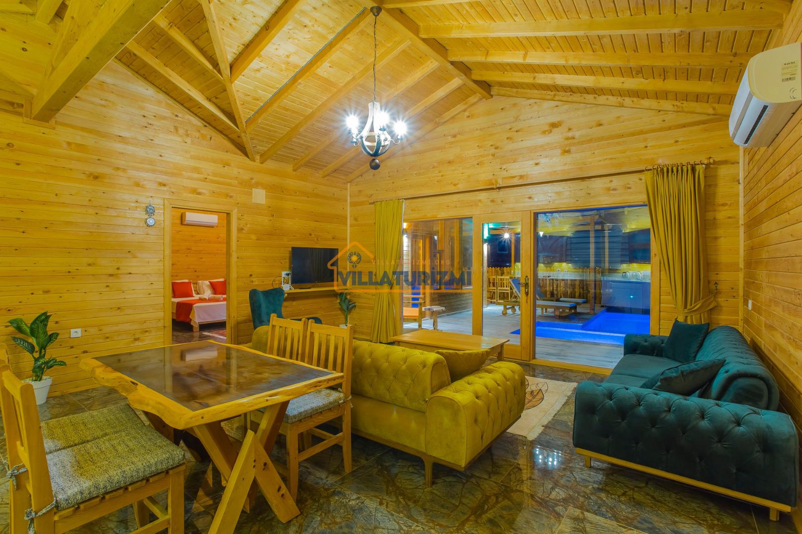 Salon :Modern oturma gurubu, klima, TV ve uydu alıcısı, kablosuz internet, havuz terasına çıkış bulunmaktadır.